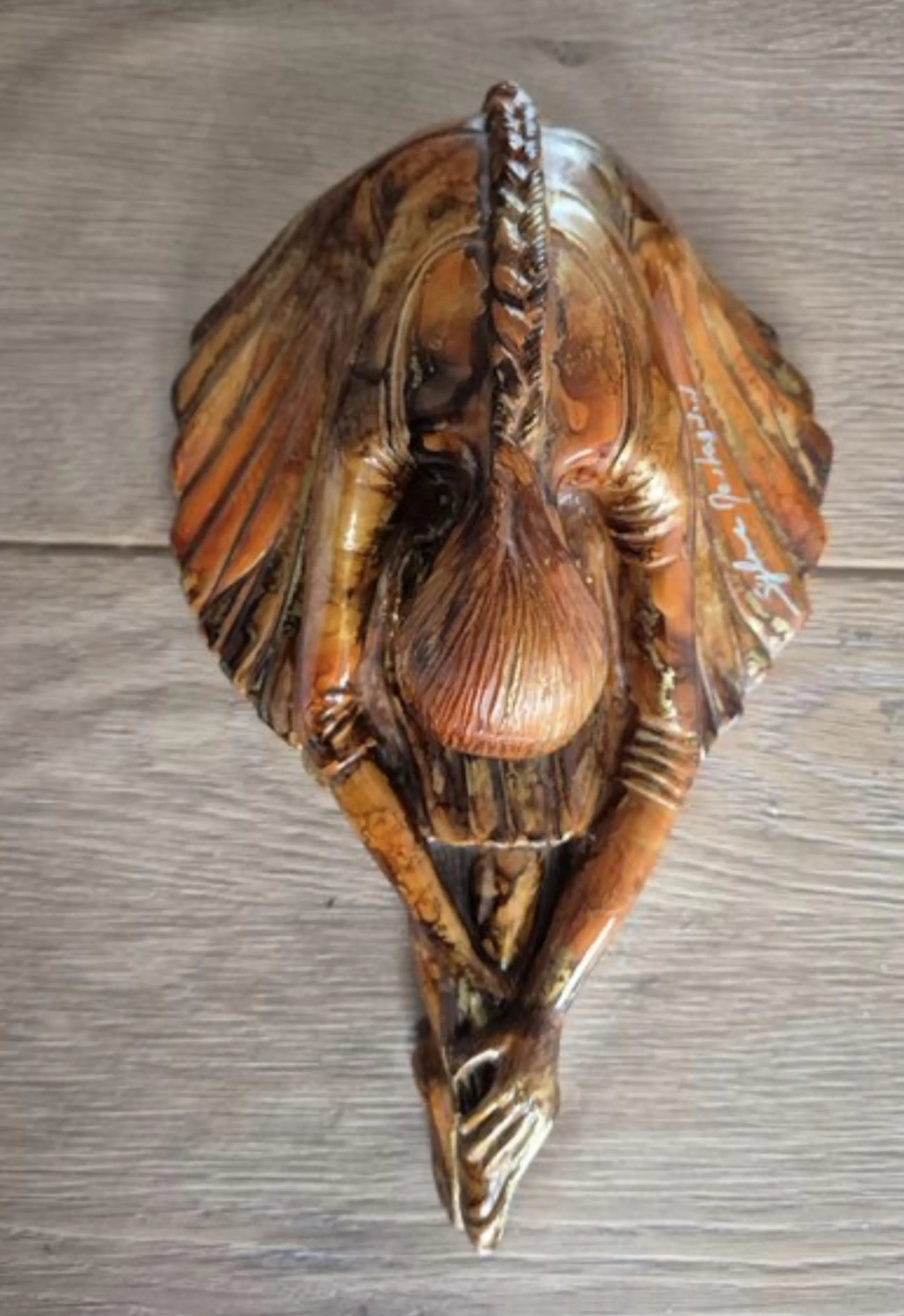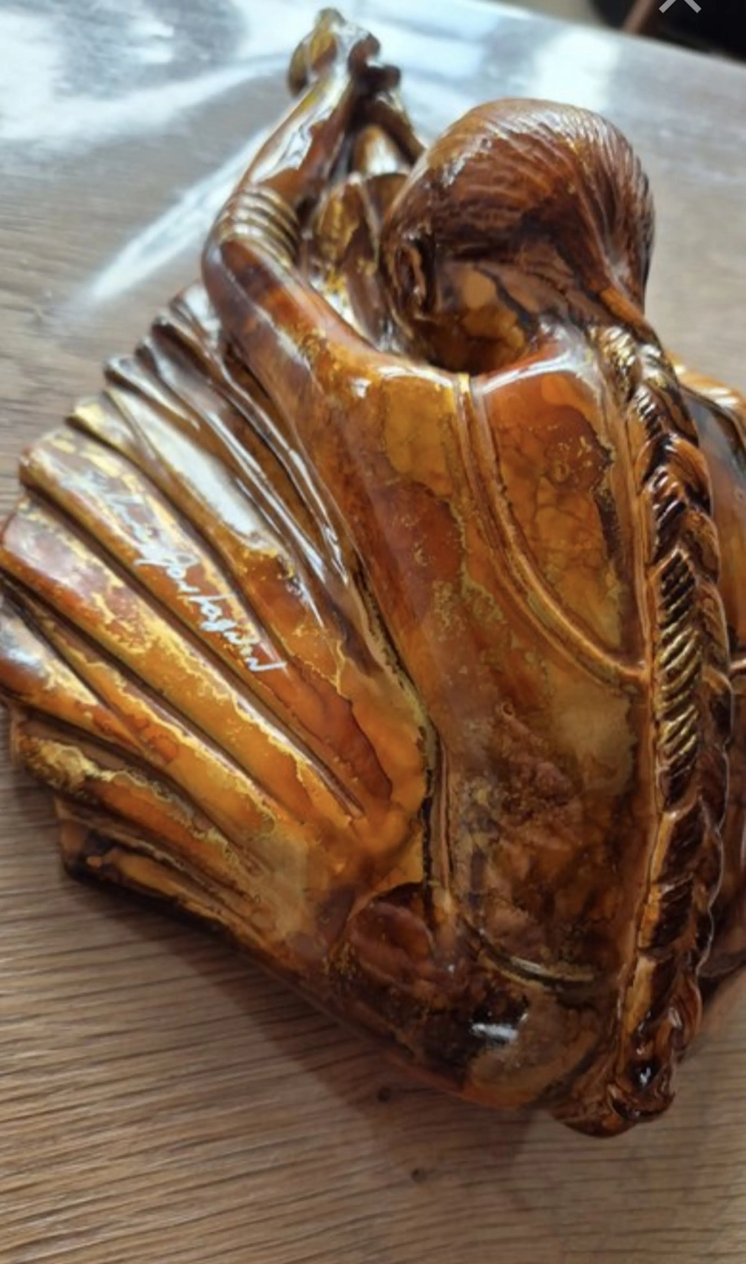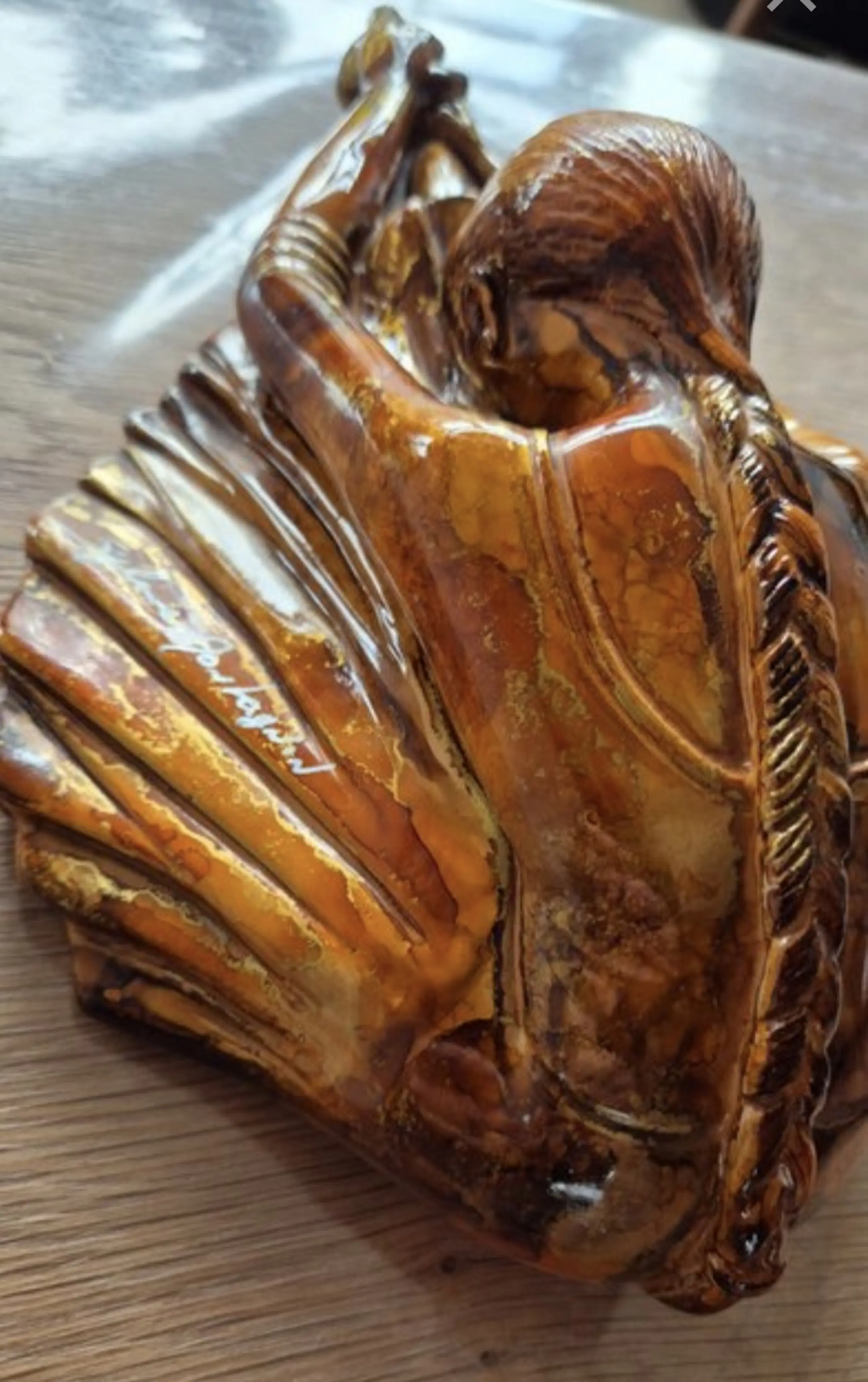 Het beeld is uitgevoerd in de kenmerkende stijl van Montagnon: een rijke, amberkleurige emaille-glazuur met schitterende bladgoud-accenten (éclats d'or) die het licht prachtig vangen. De vloeiende, organische lijnen en warme tinten maken dit een perfect voorbeeld van moderne Franse decoratieve kunst met Art Deco invloeden.