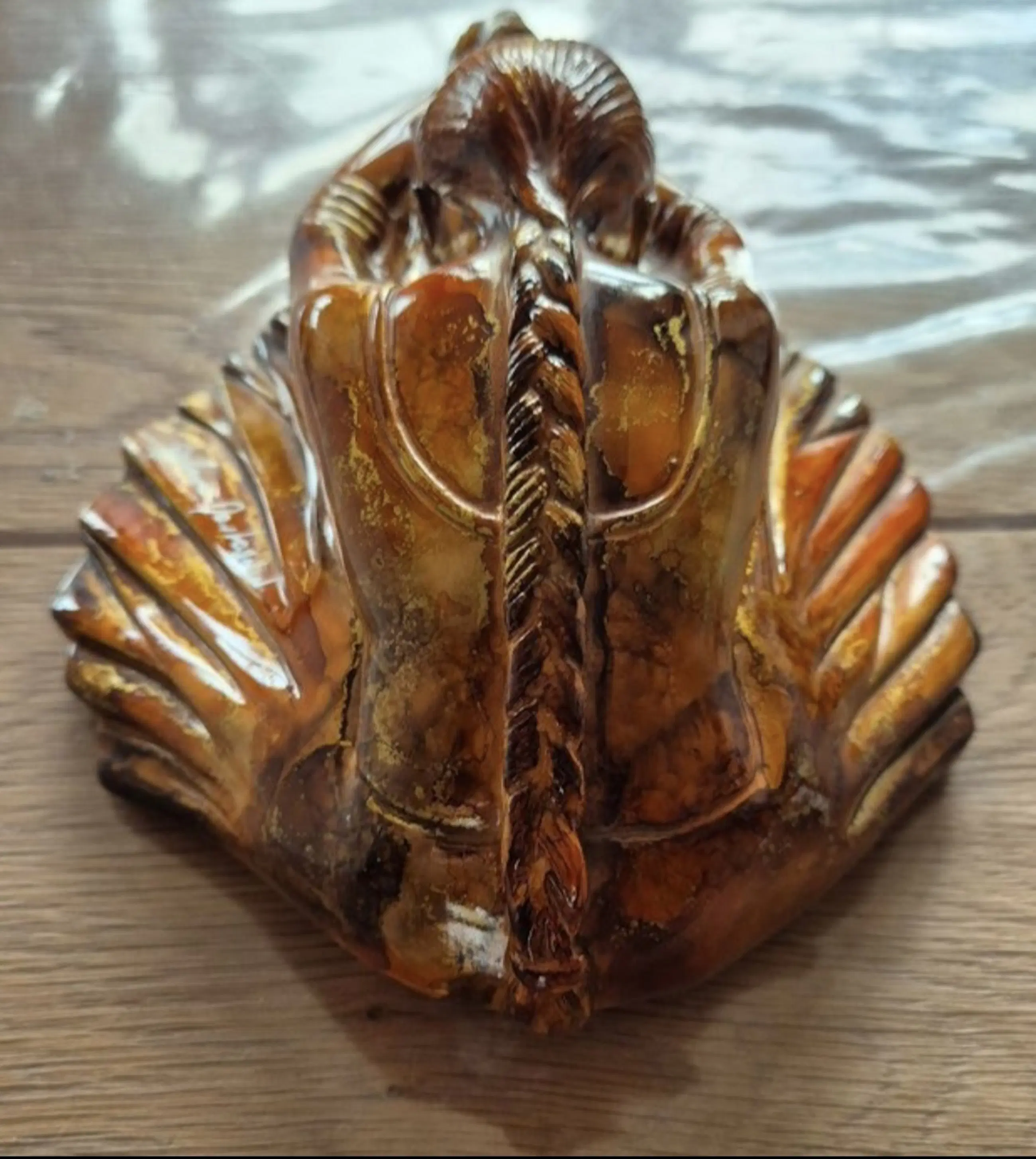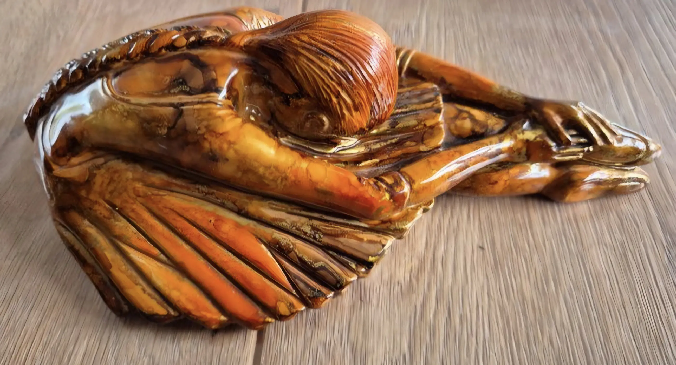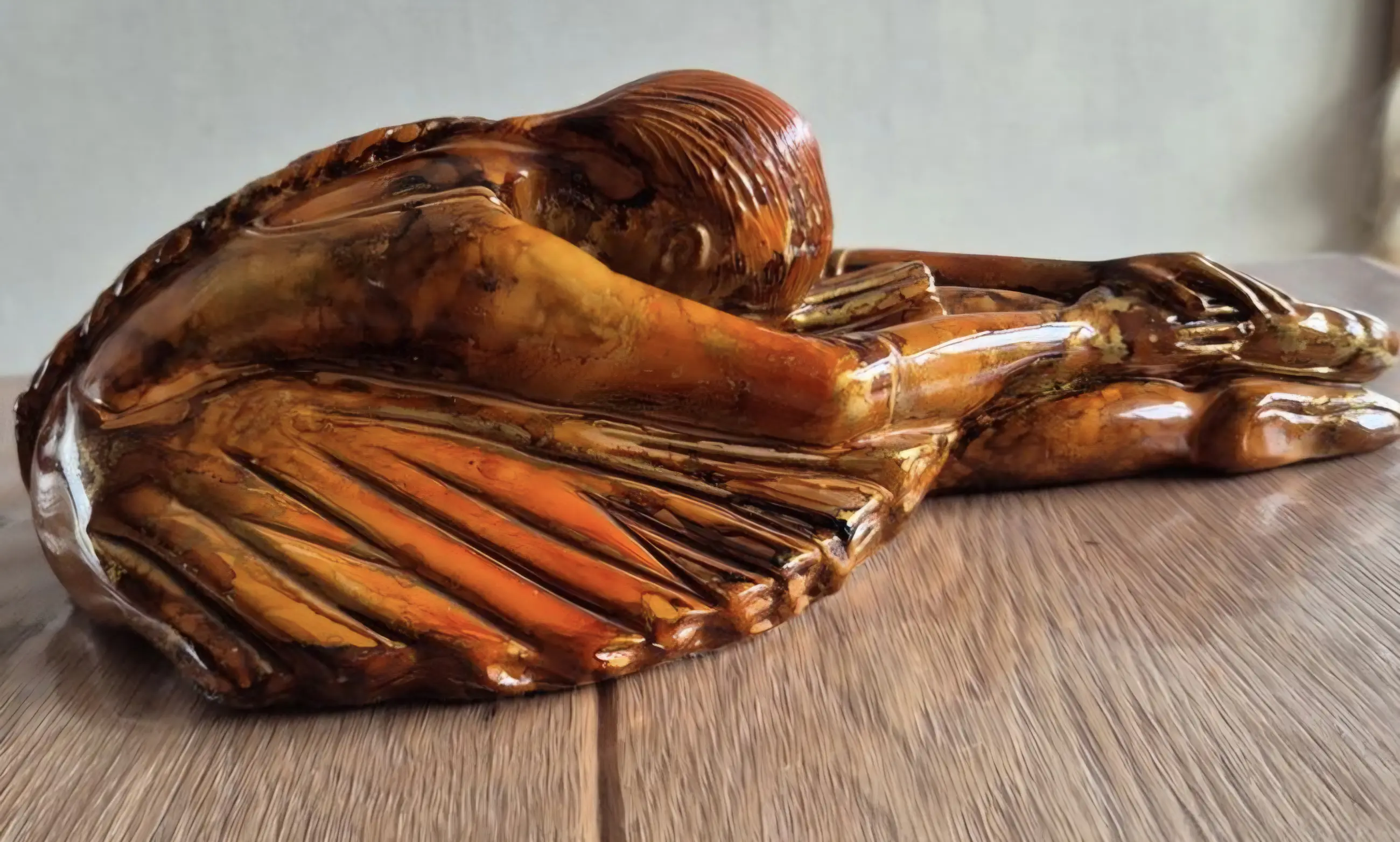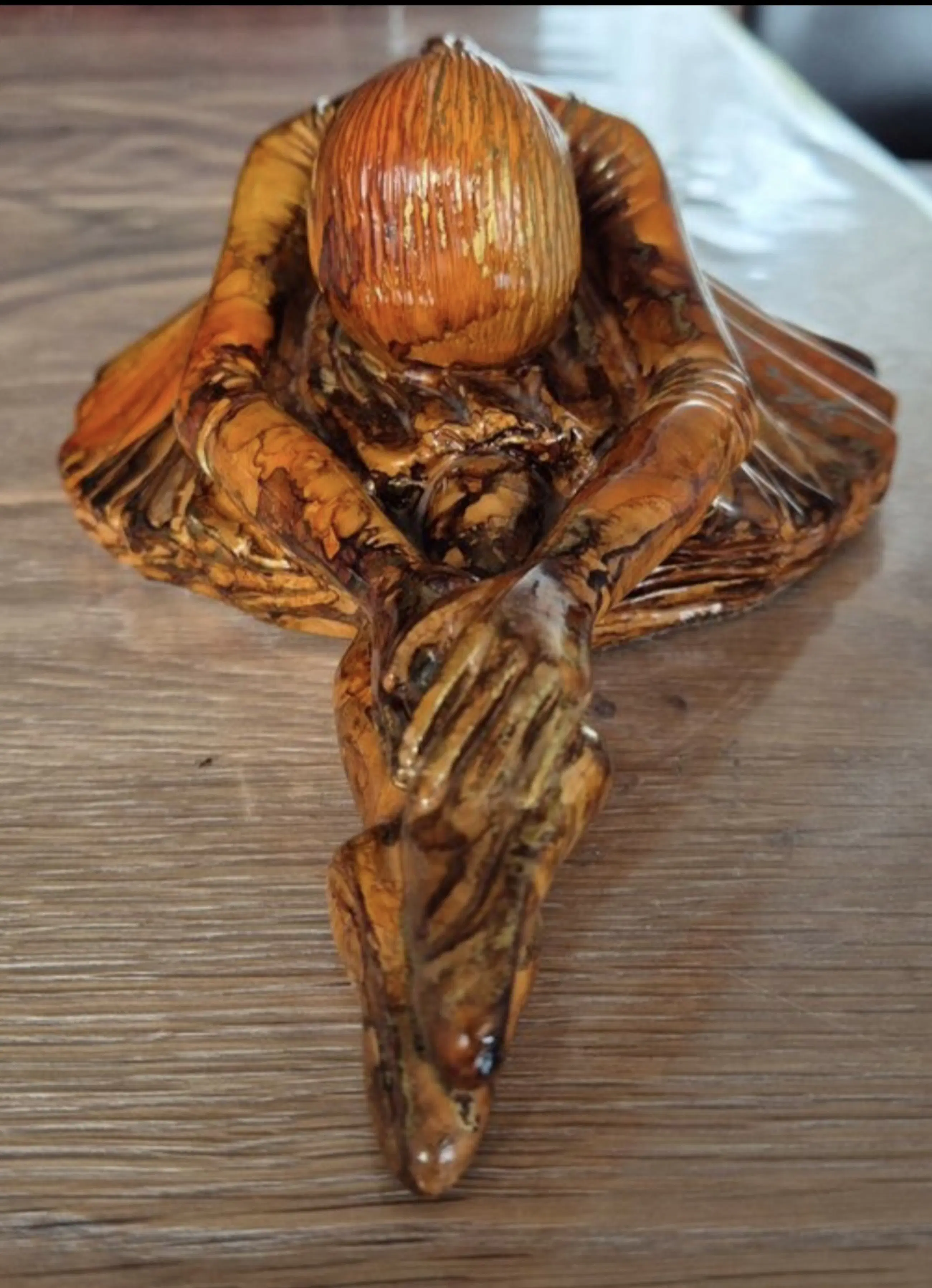 Het beeld is uitgevoerd in de kenmerkende stijl van Montagnon: een rijke, amberkleurige emaille-glazuur met schitterende bladgoud-accenten (éclats d'or) die het licht prachtig vangen. De vloeiende, organische lijnen en warme tinten maken dit een perfect voorbeeld van moderne Franse decoratieve kunst met Art Deco invloeden.
