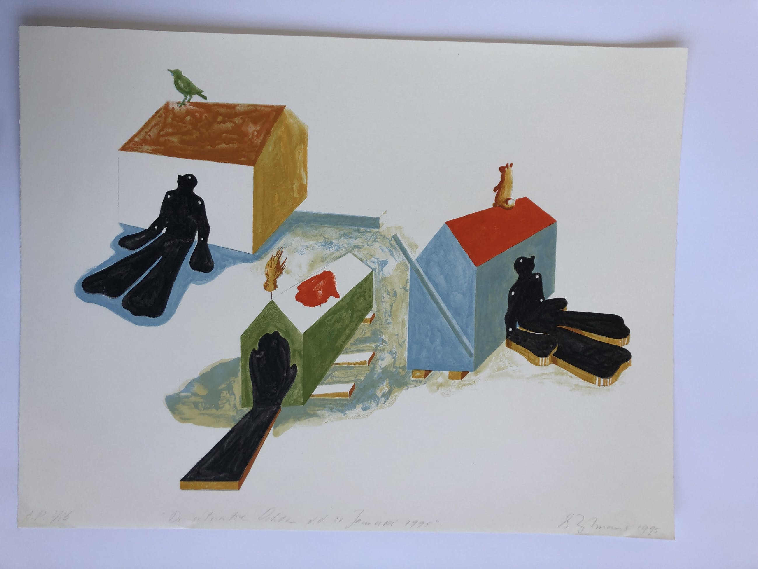 Surrealistisch tafereel van Zijlmans. U kunt het werk vooraf komen bekijken bij galerie Rotor in Gorinchem en na afloop van de veiling ophalen of per aangetekende post toegestuurd krijgen. In overleg kunt u uw aankopen laten opslaan in onze verwarmde opslagruimte en ze in een later stadium ophalen.