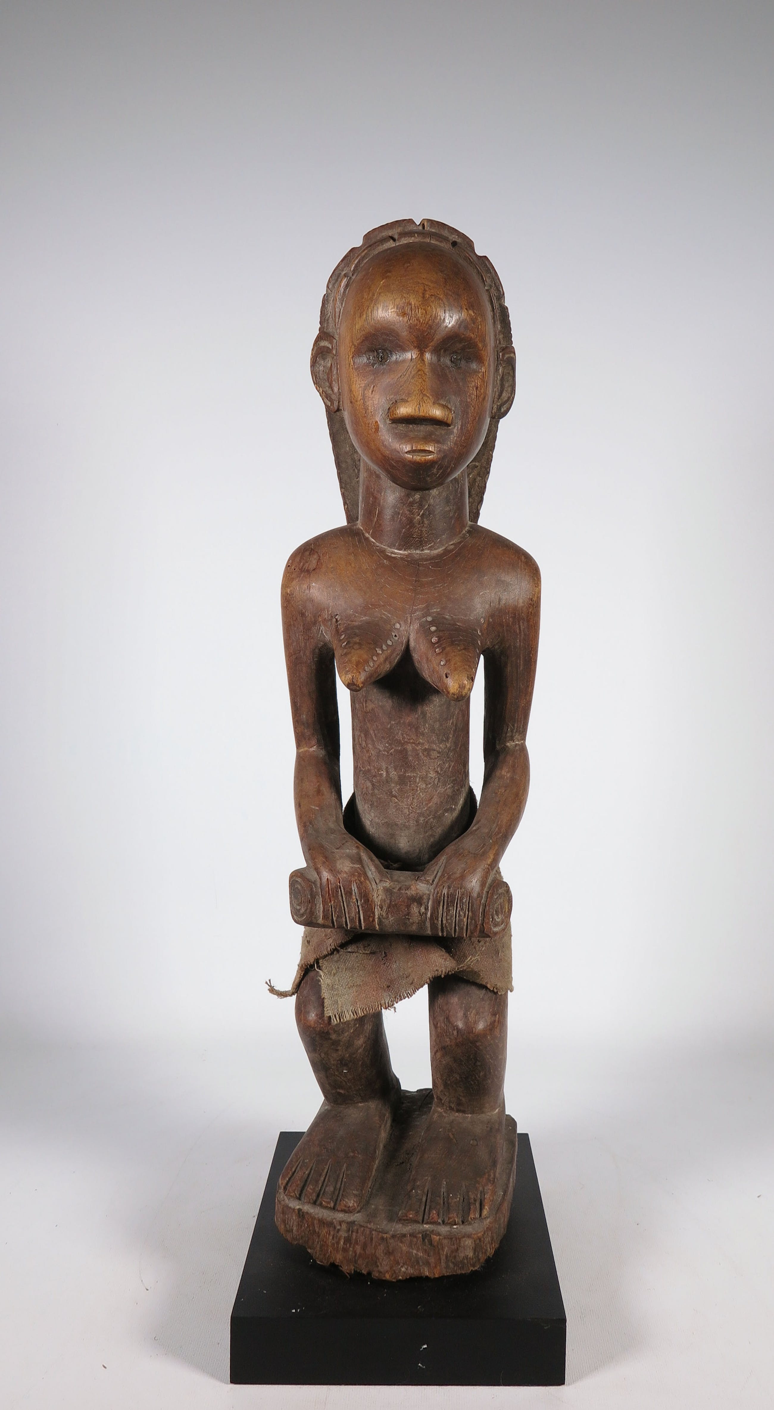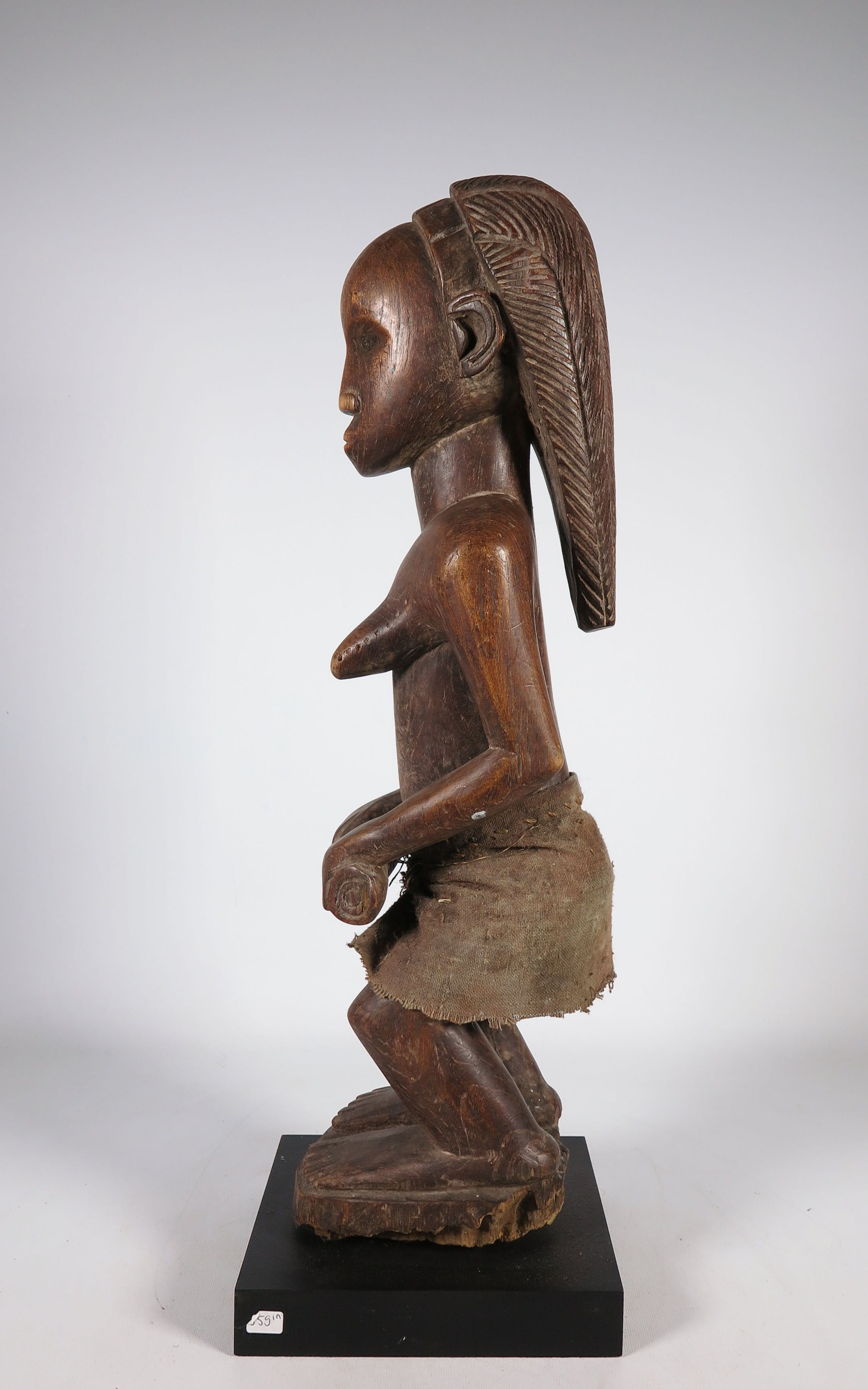 Houten gestoken Tabwa (stam) voorouderbeeld van een gehurkt vrouwenfiguur met haar in de vorm van een staart en aangekleed met een rok.