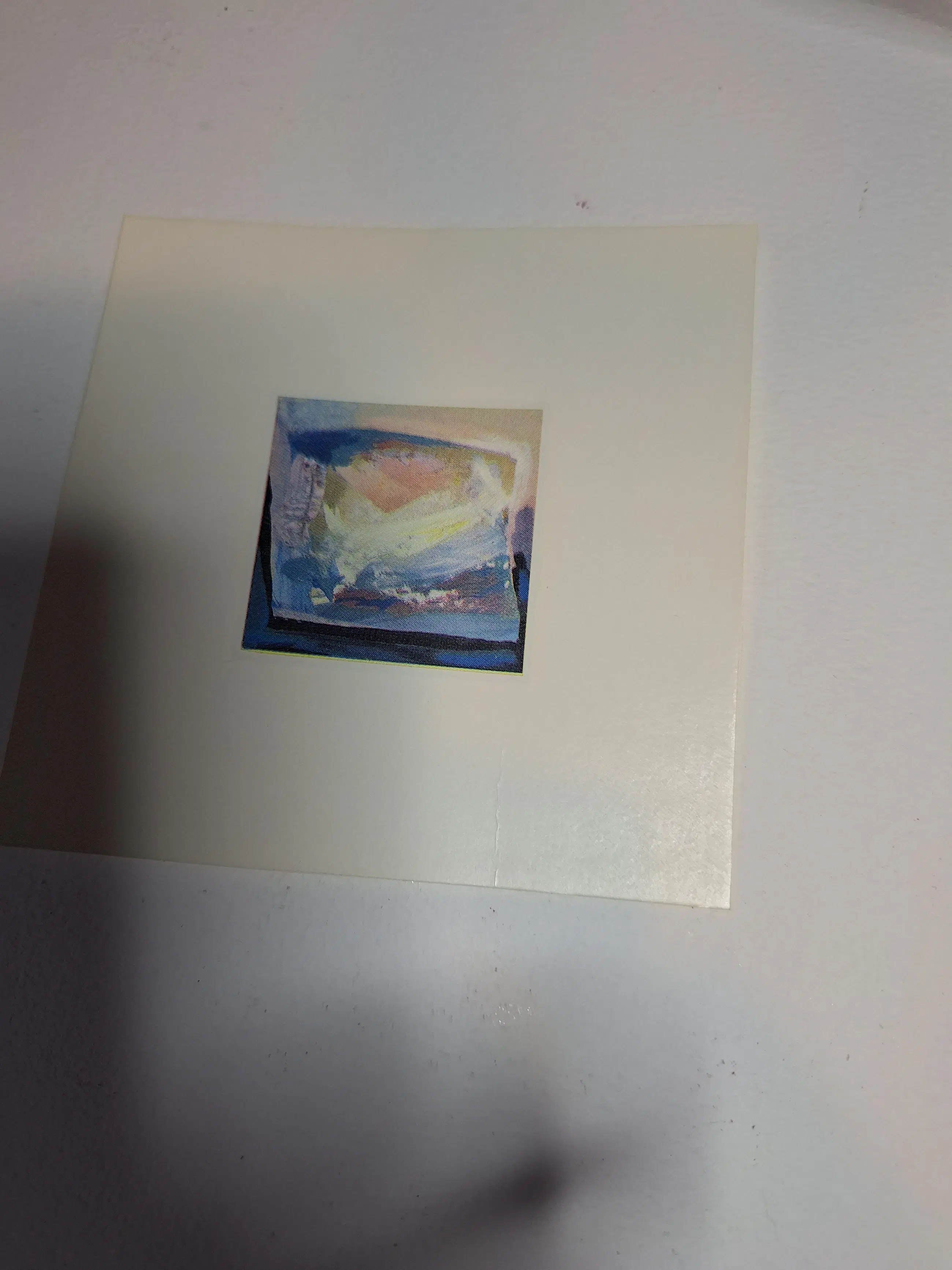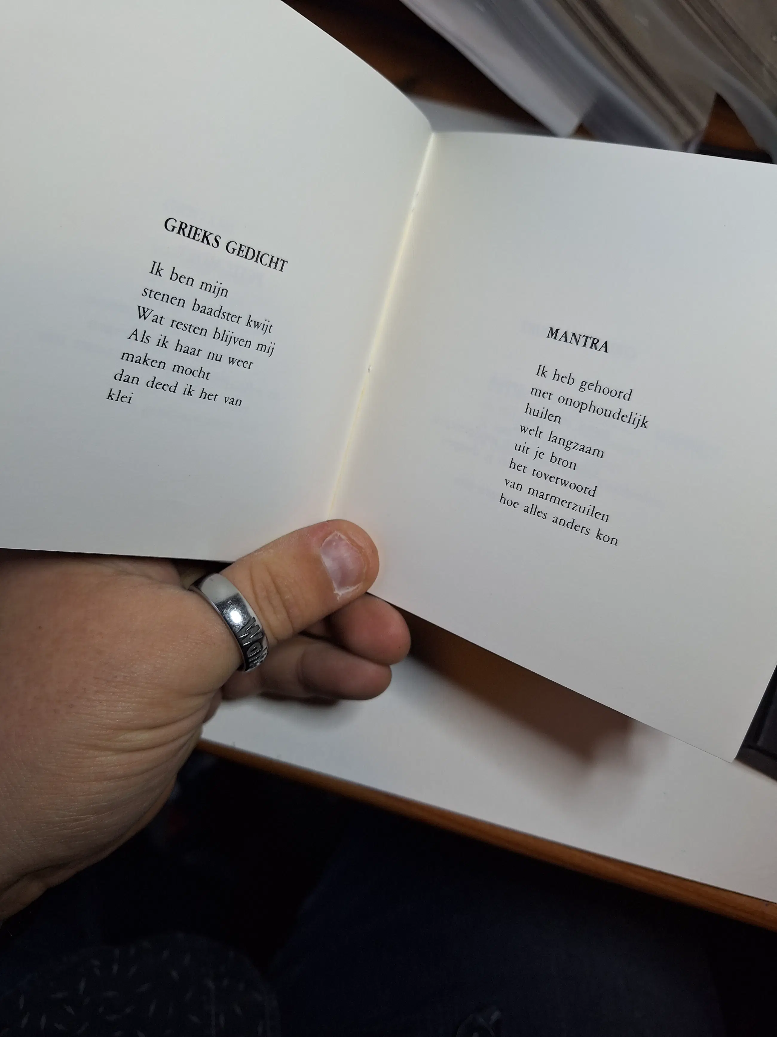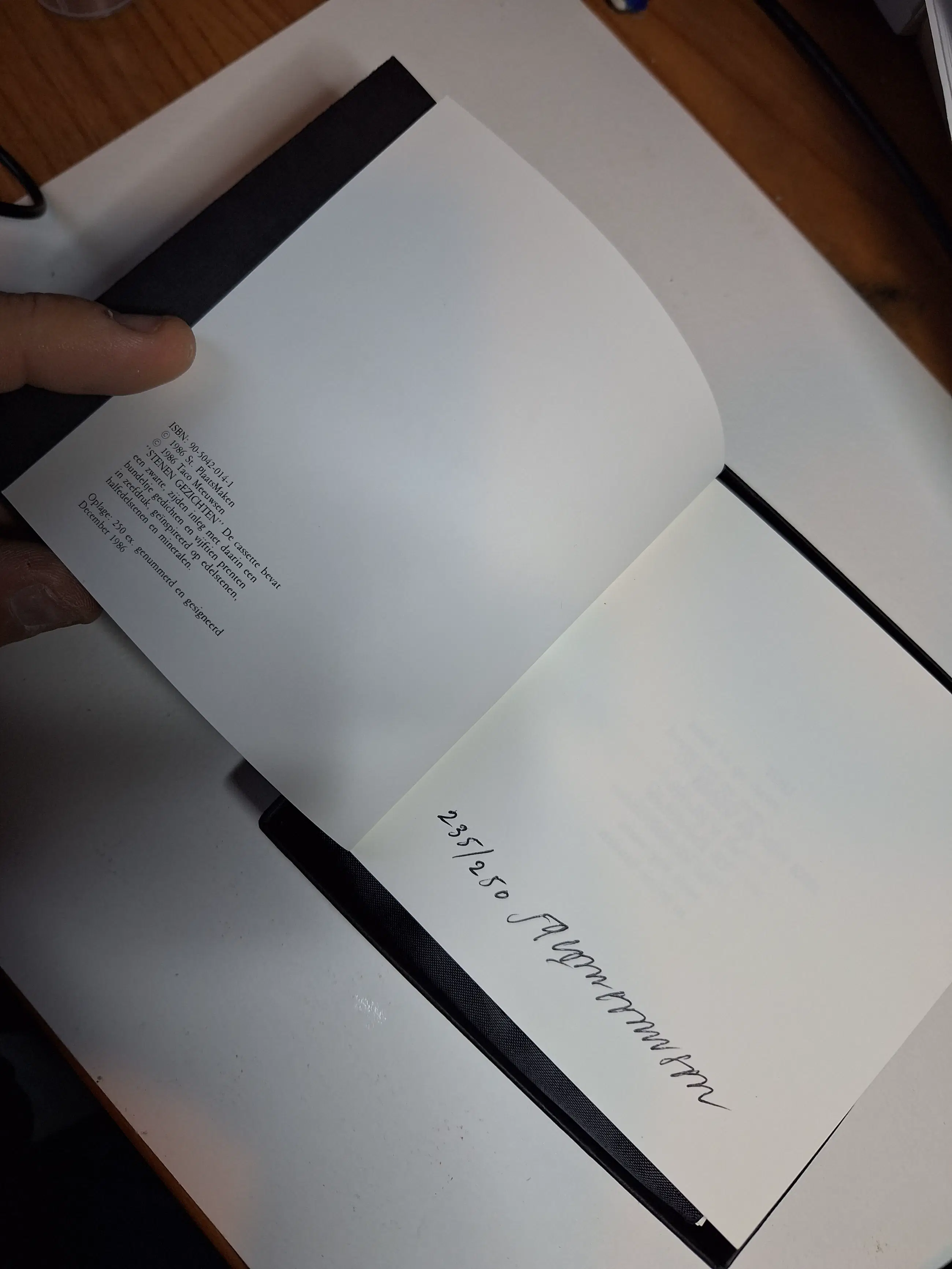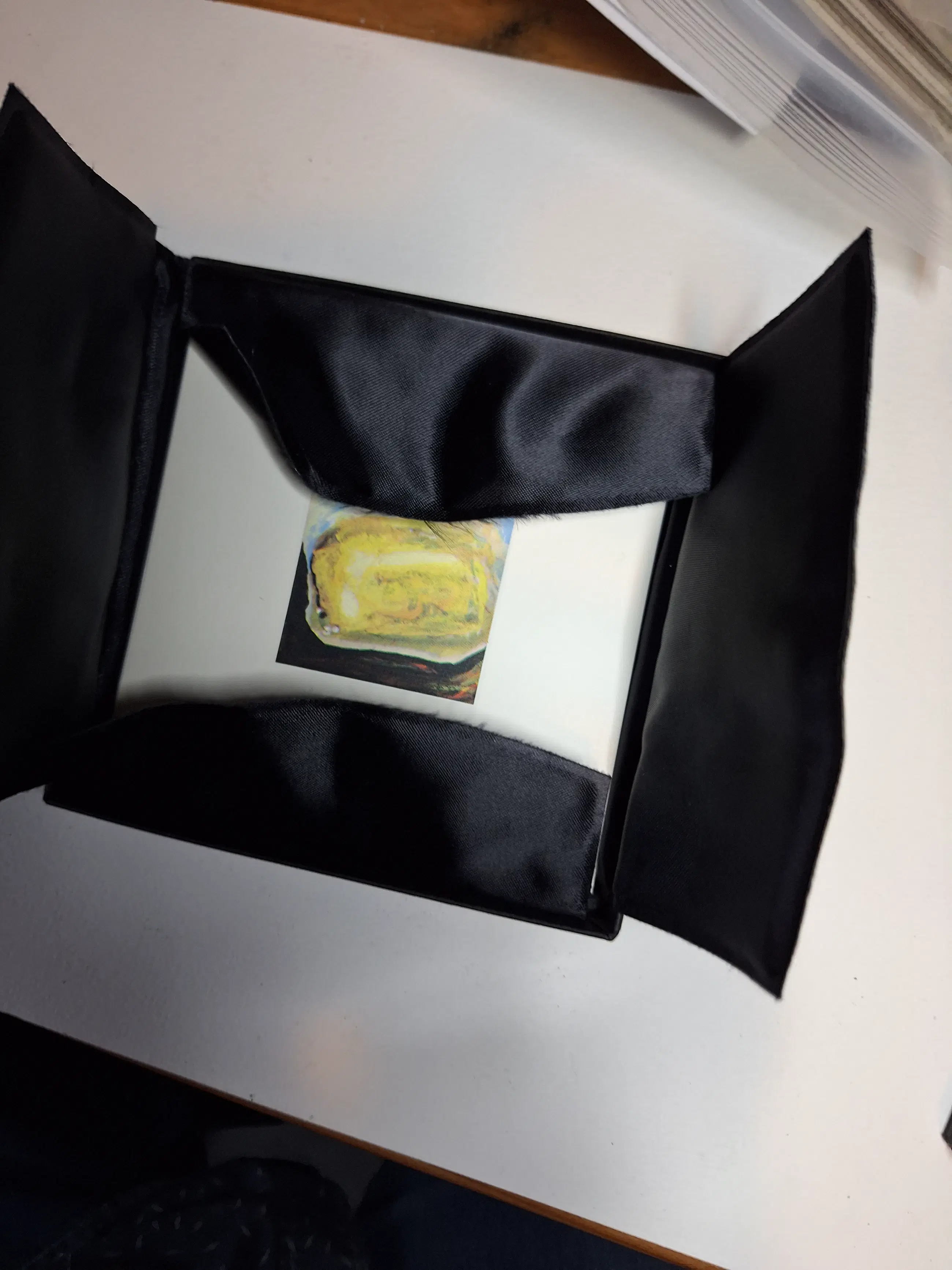 Doos van 13,5 x 13,5 cm met daarin 9 van de 15 zeefdrukjes uit de serie Stenen Gezichten van Taco Meeuwsen. Zeefdrukjes zitten in een zijden inleg, boekje met gedichten zit erbij