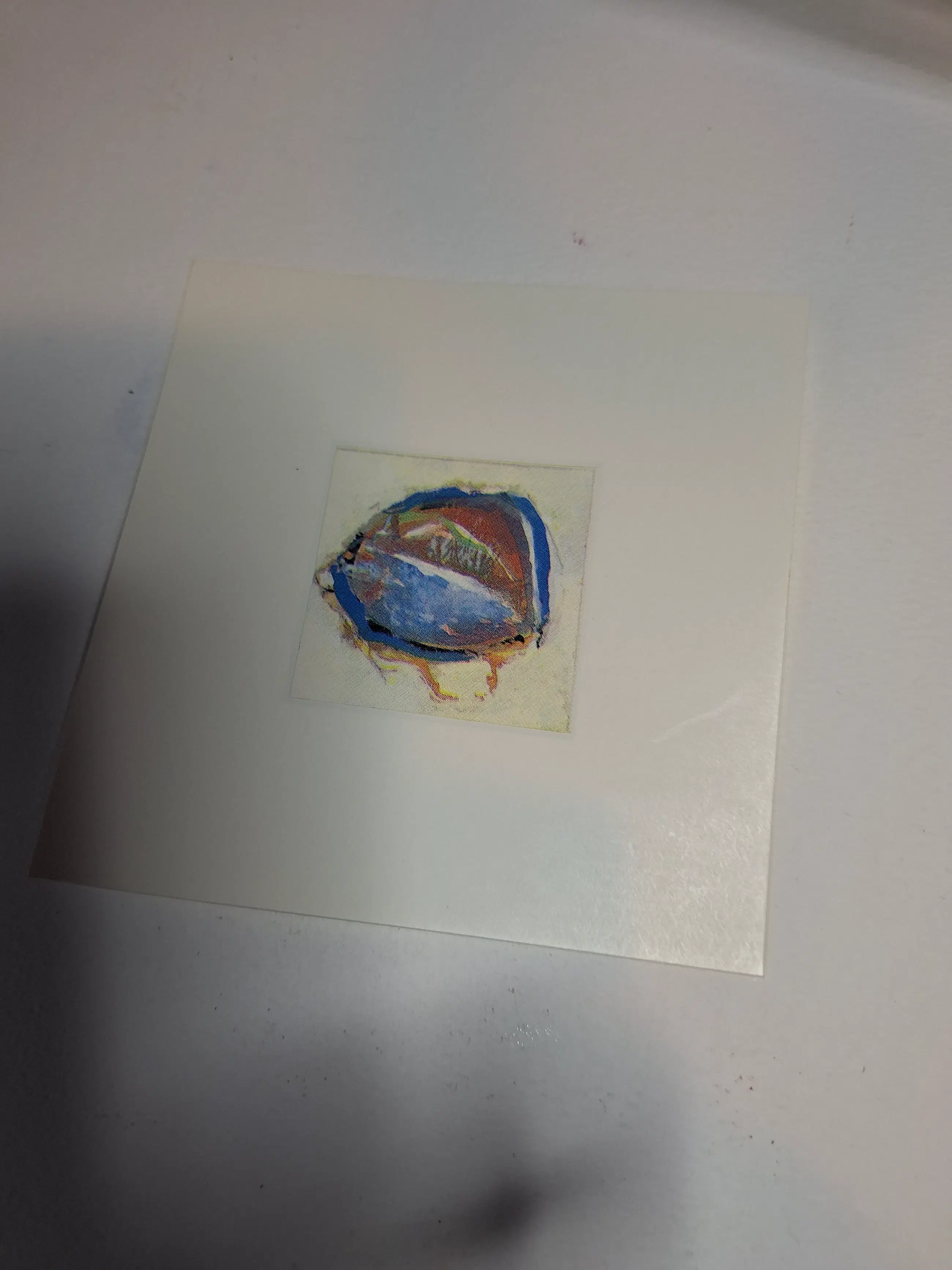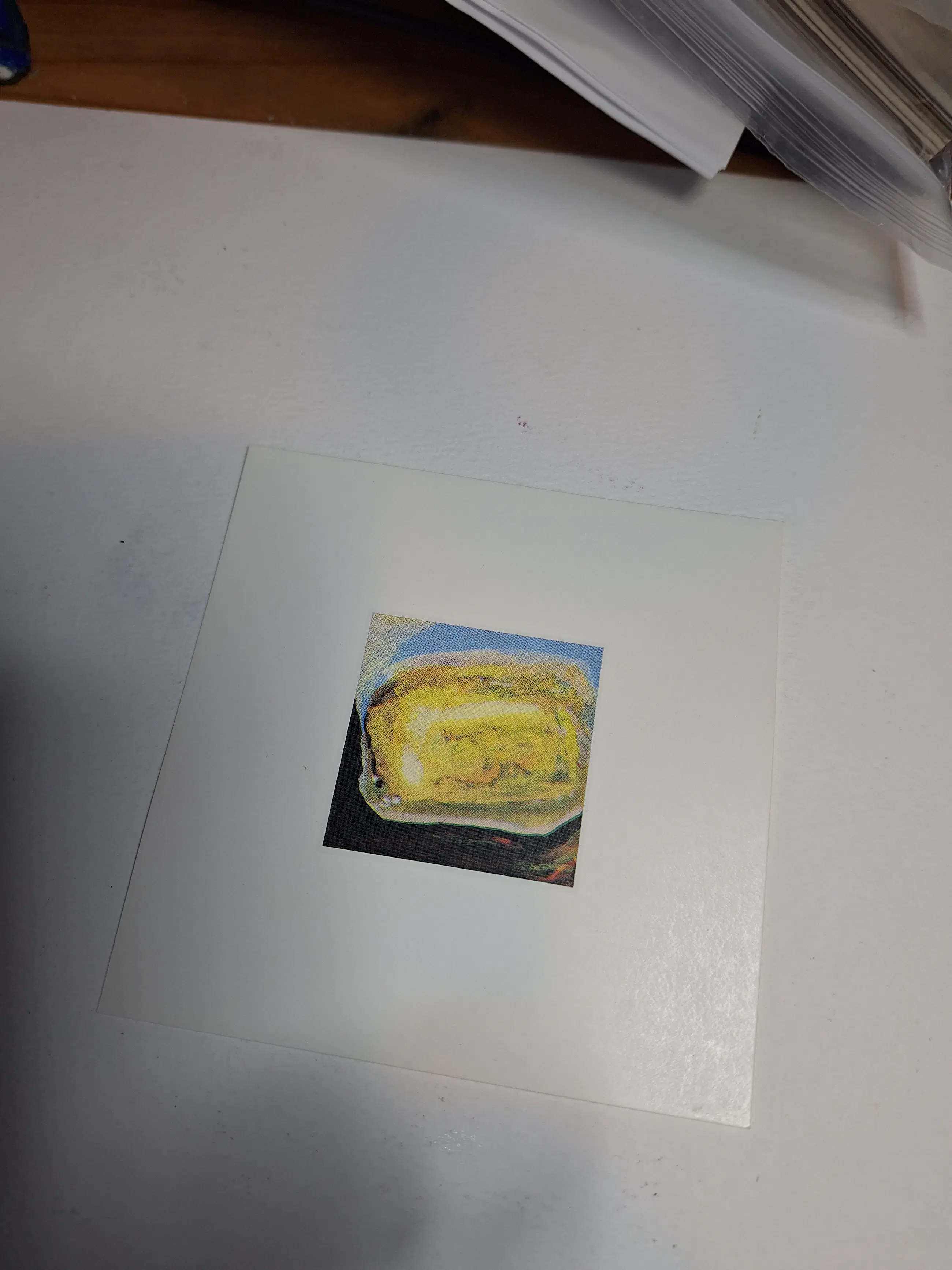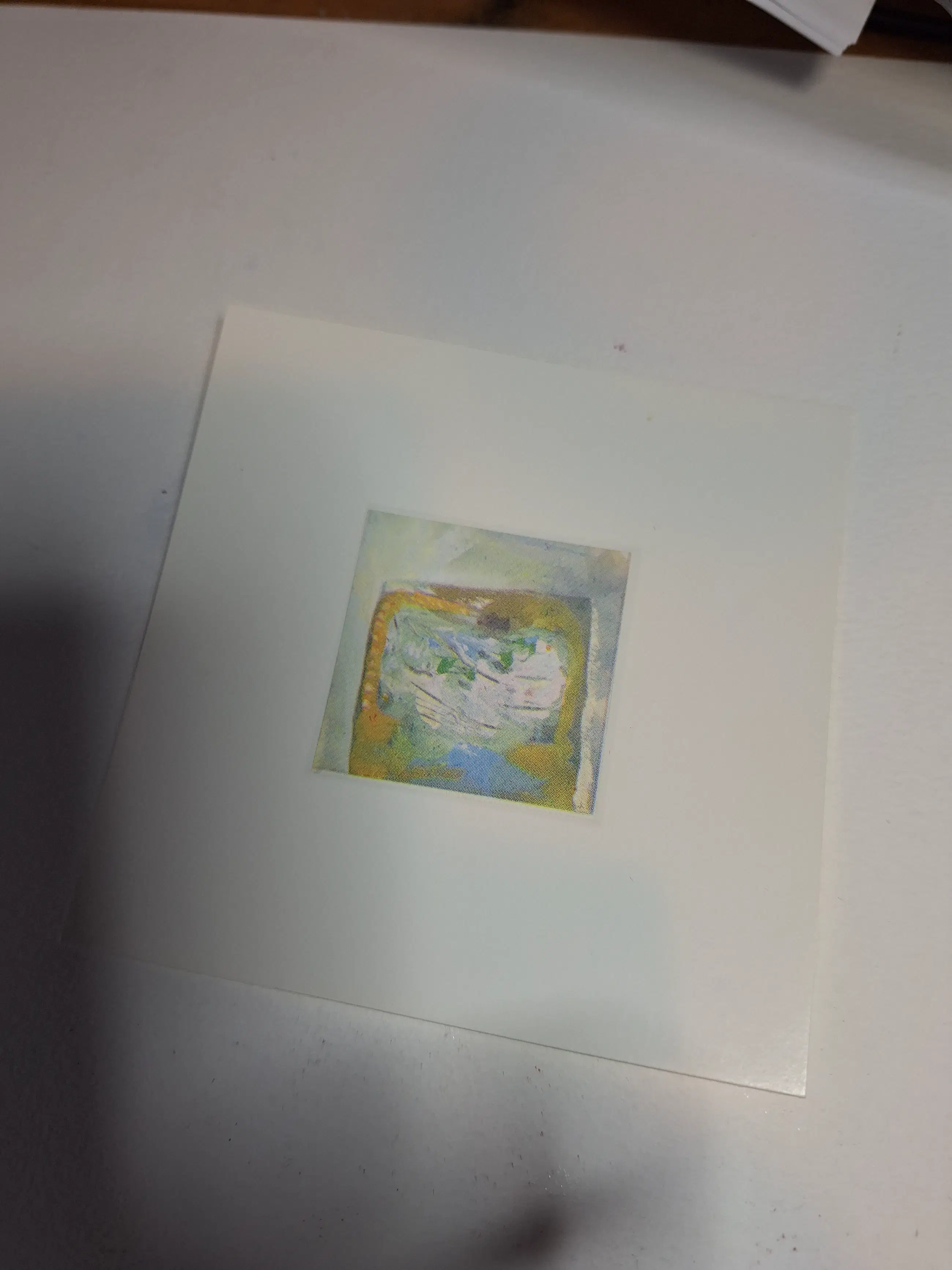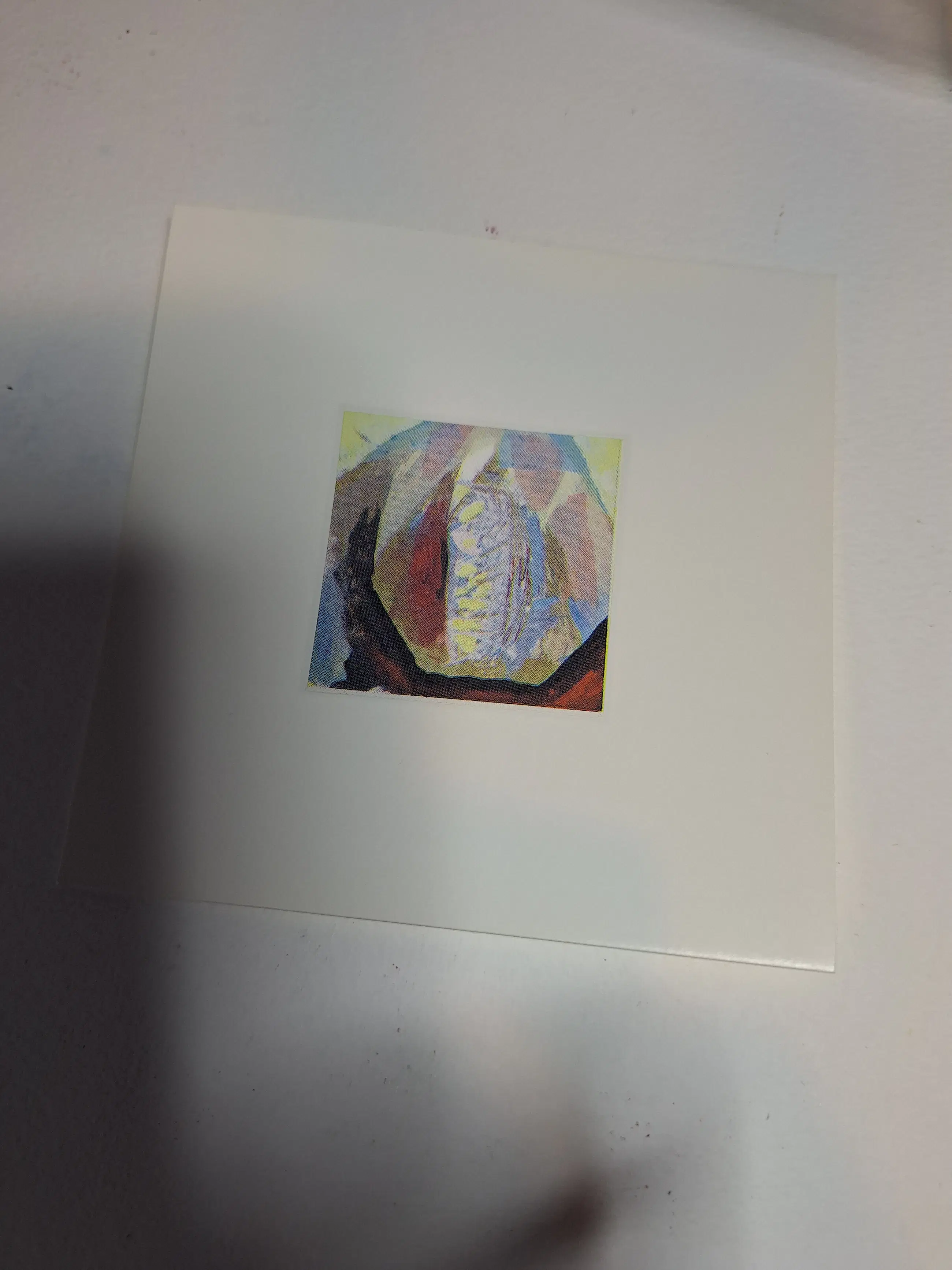 Doos van 13,5 x 13,5 cm met daarin 9 van de 15 zeefdrukjes uit de serie Stenen Gezichten van Taco Meeuwsen. Zeefdrukjes zitten in een zijden inleg, boekje met gedichten zit erbij