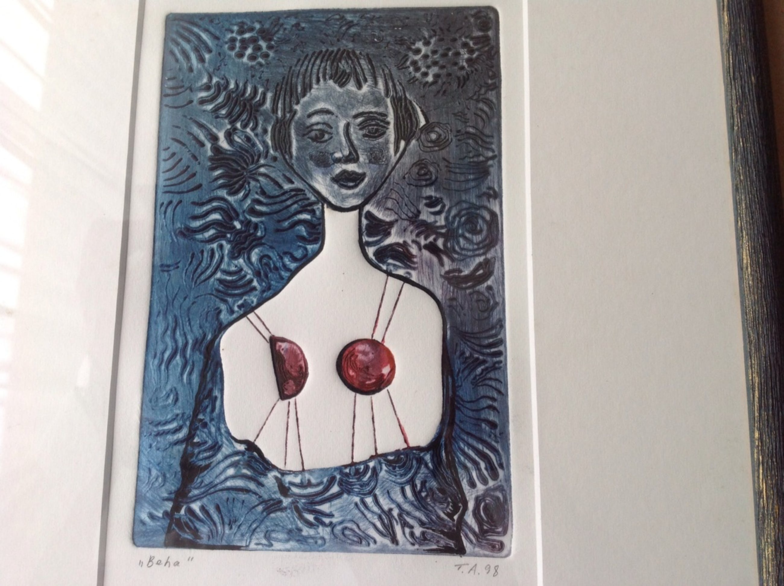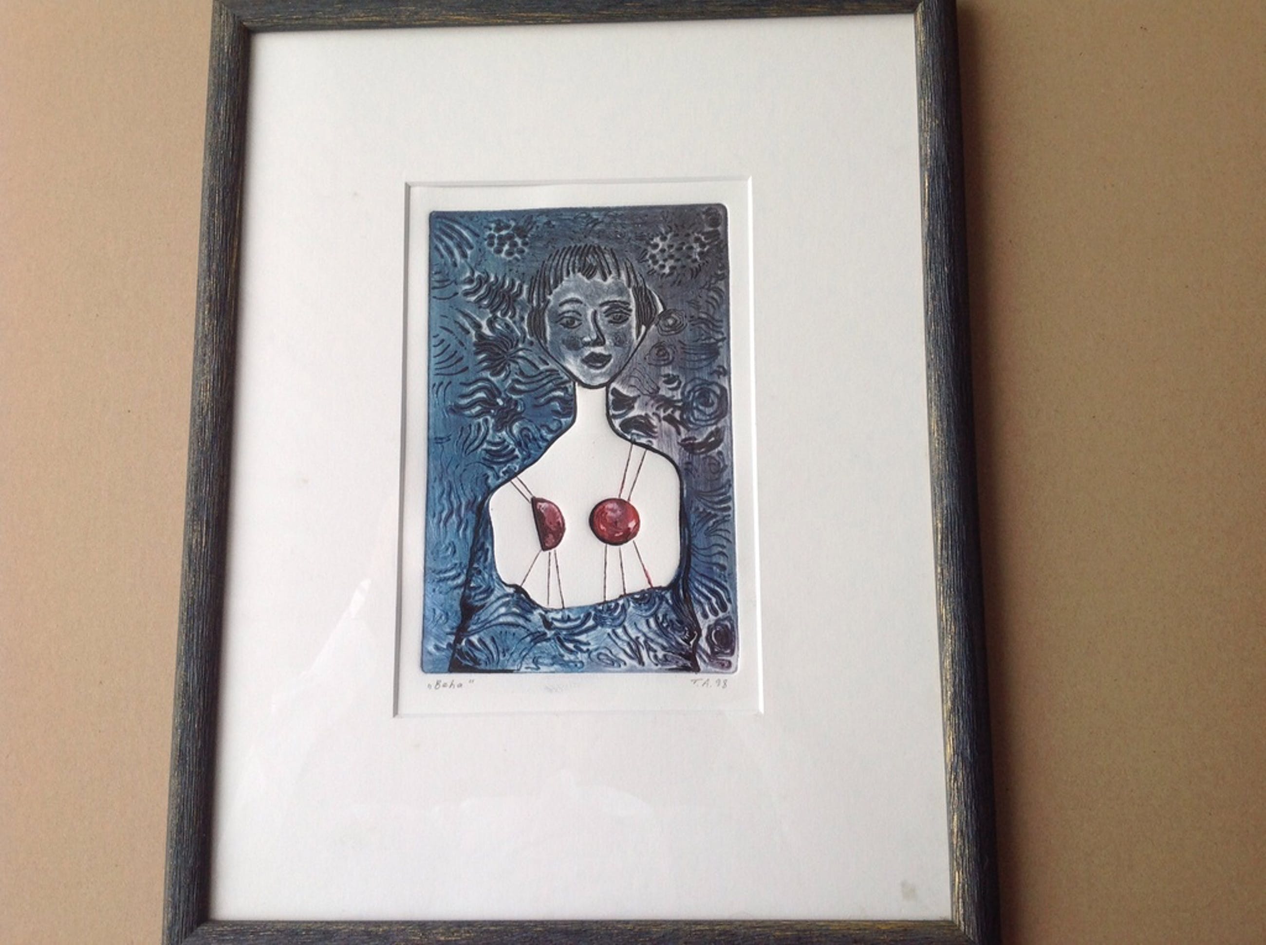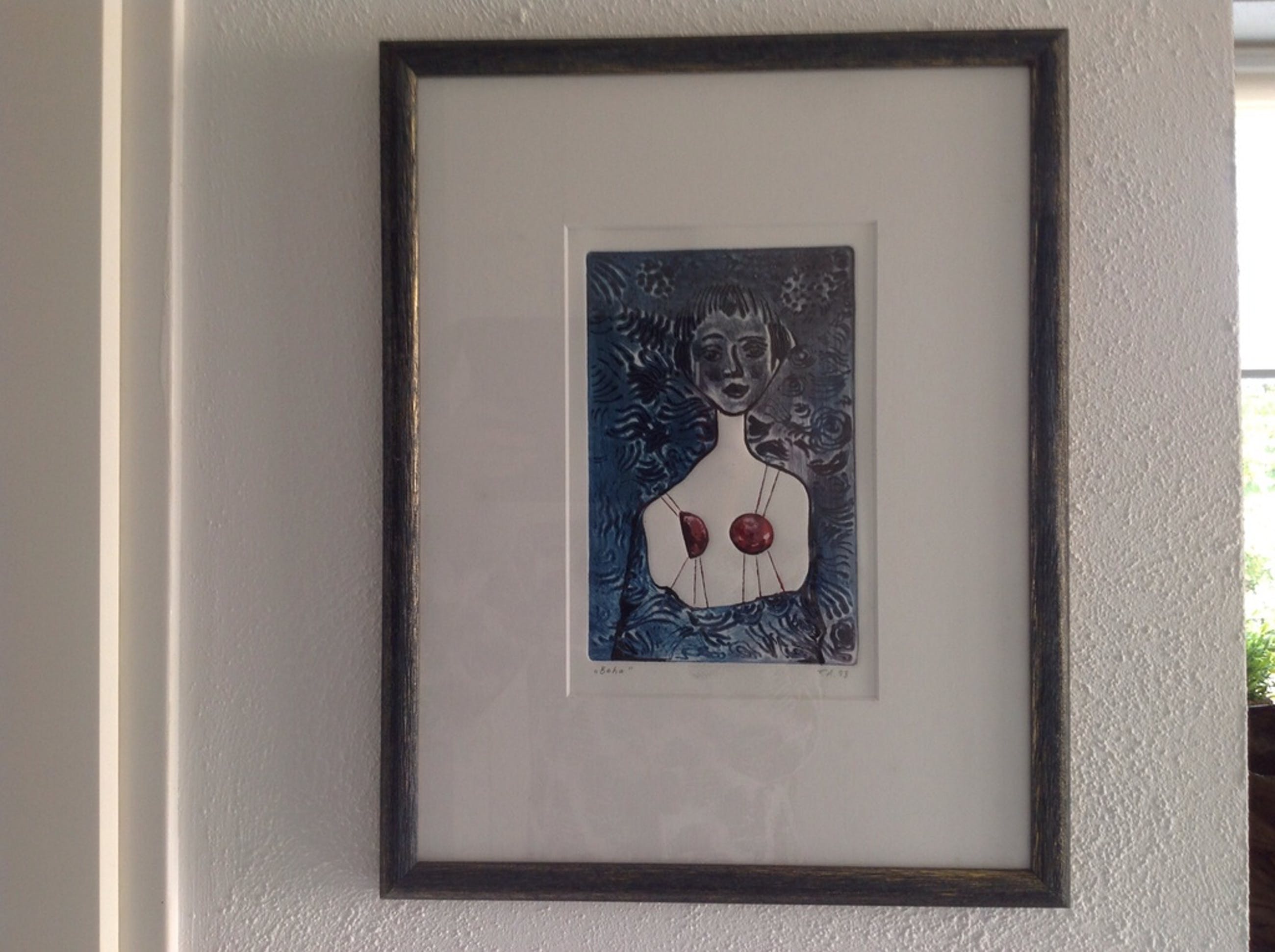 Met passe-partout in smaakvol goed bijpassende boomstam reliëf lijst op kleur van het kunstwerk , in blauw op goud.