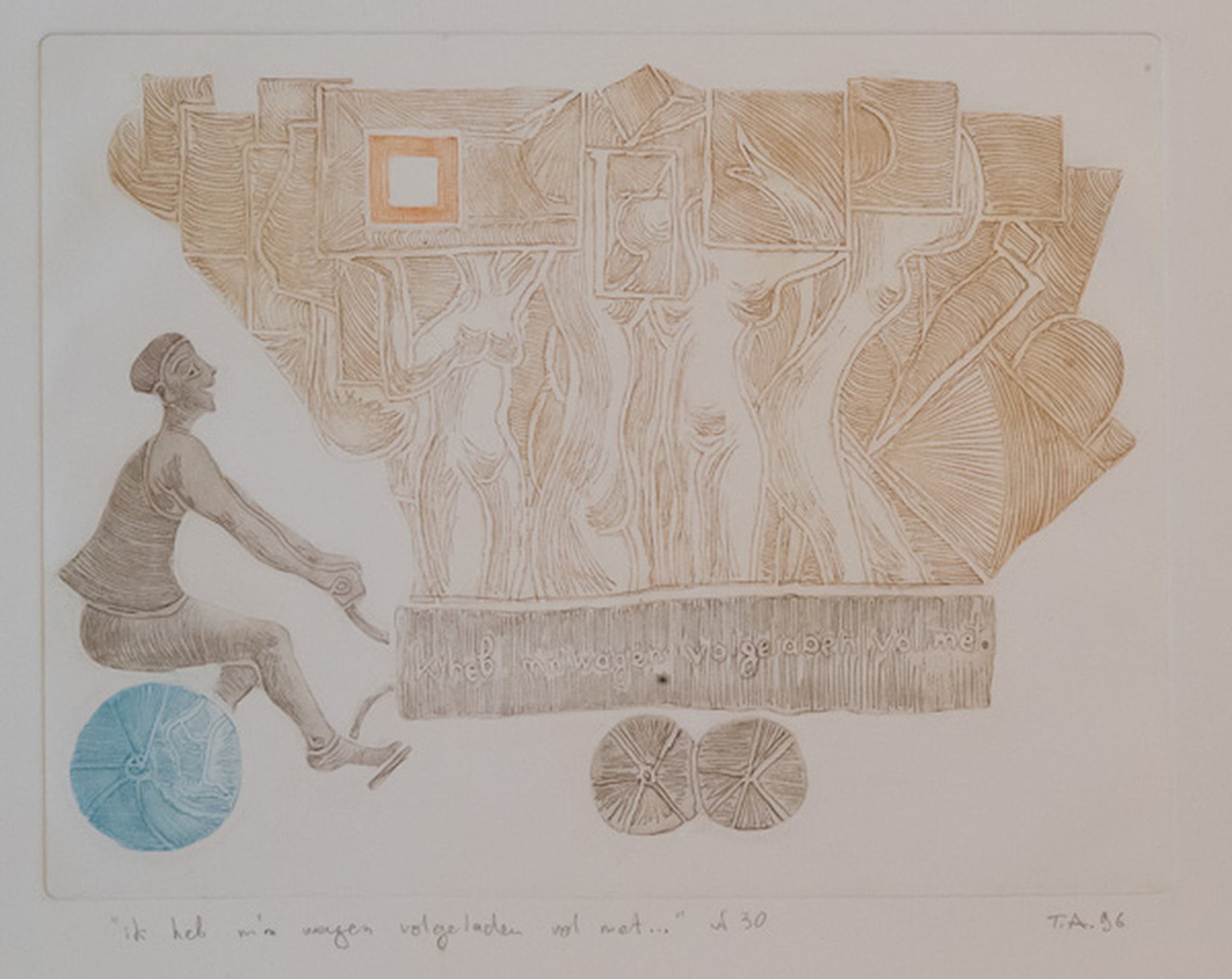 Fraaie kleine ets uit 1996 van deze Georgische kunstenaar die al vele jaren in Nederland woont. De afmeting van het beeld is 23 x 30 cm. Nooit ingelijst geweest. Gesigneerd door de kunstenaar en gemaakt in een kleine oplage ter gelegenheid van het jarige Van Gend en Loos.