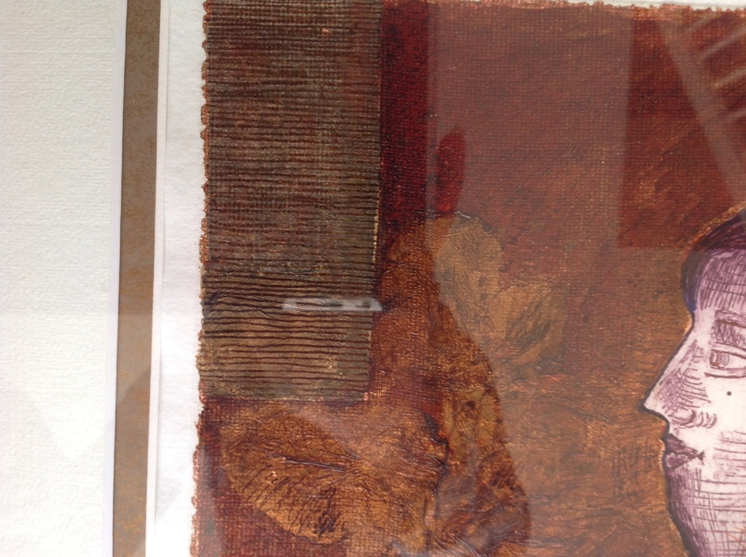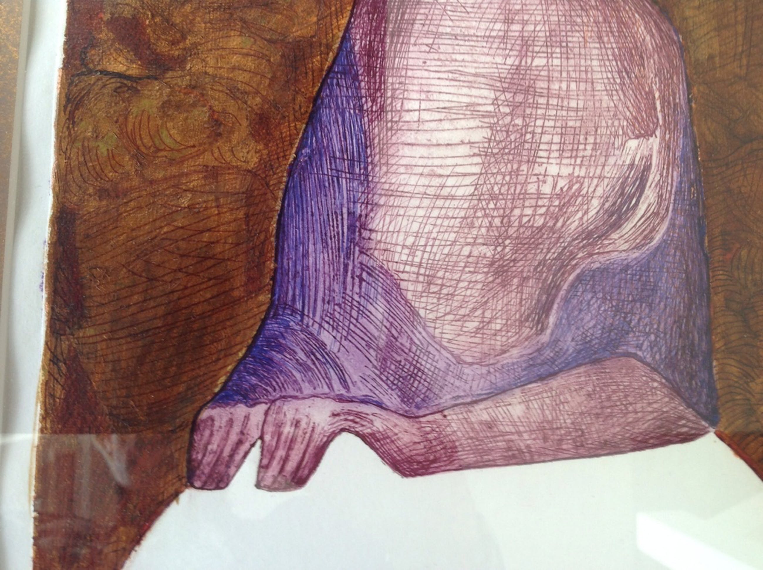 Het pakt mij elke keer, nu als ik het beschrijf : de harmonie in de kleurstelling , de diepte van de vrouw in reliëf ets afdruk in paarse inkt tinten met haar omgeving op raster stof in blad koper , goud gemengd met brons en zwart in herfsttinten. Zo mooi in detail ......