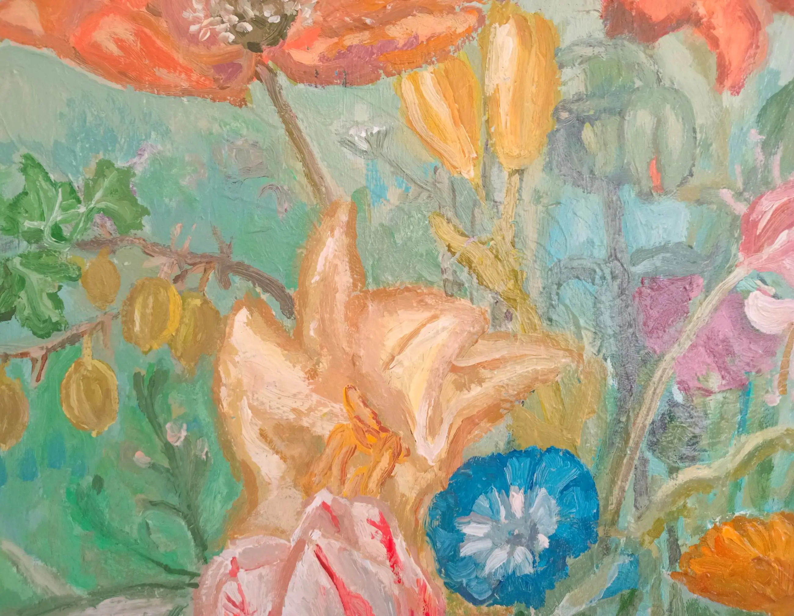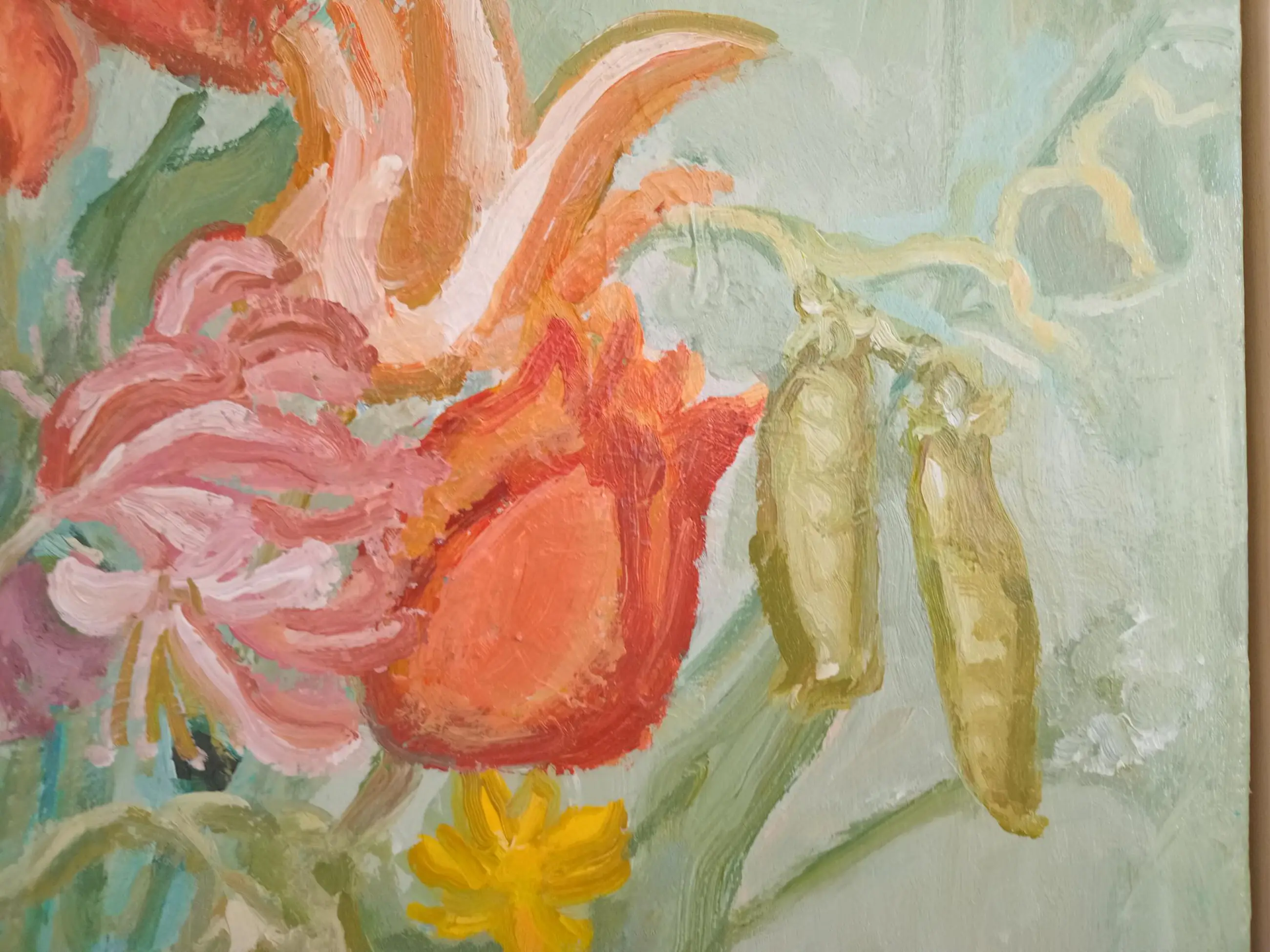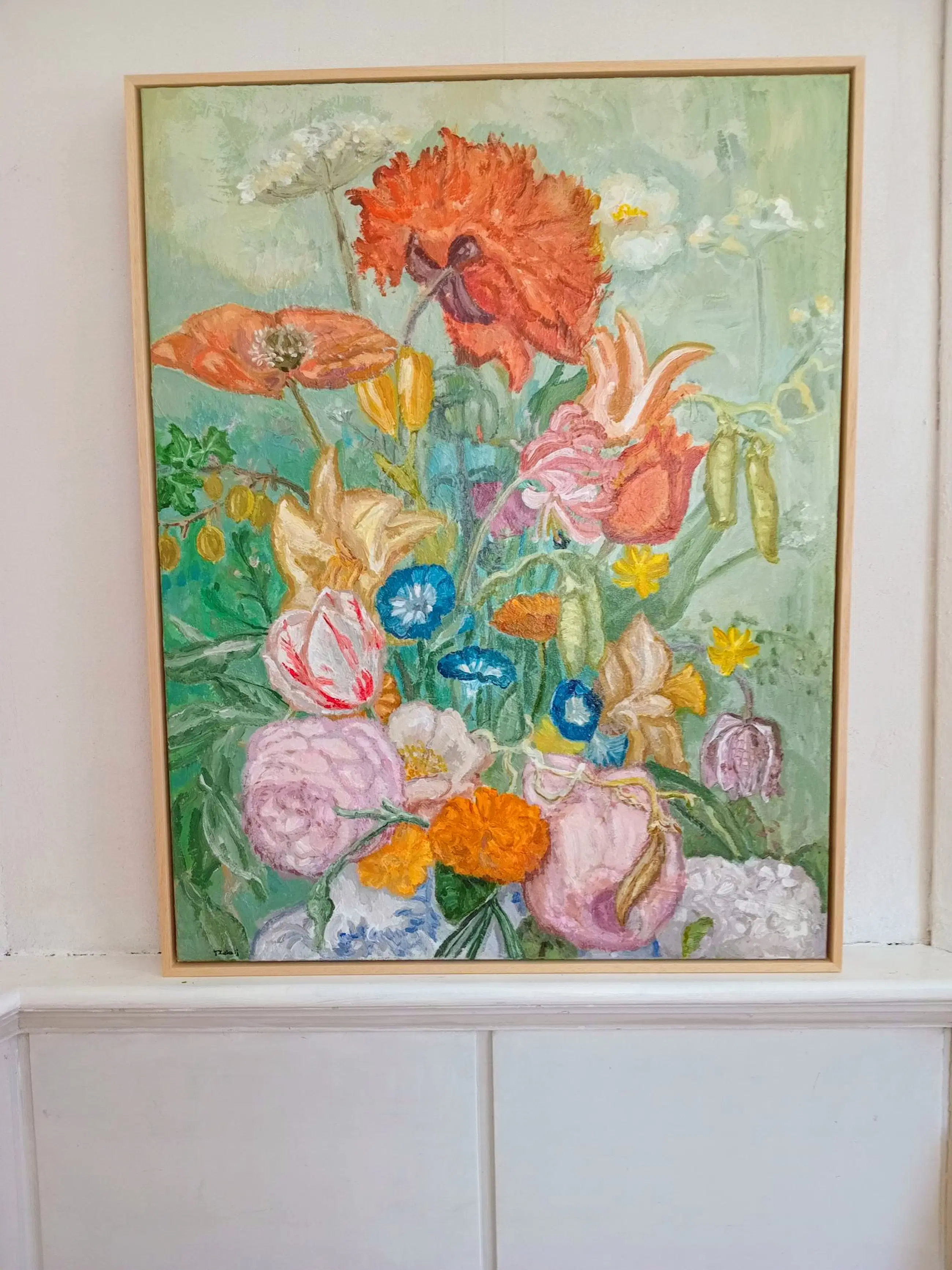 "Bloemen in het groen" 2023, gemaakt in serie "Bloemetjes en Afkomst". Het schilderij is gemaakt in impasto techniek met grote kwasten. Door deze techniek blijft de afdruk van de bewegingen van de kwast in de verf zichtbaar. Het schilderij is van de Nederlandse beeldend kunstenaar Tanja Koelemij. Het wordt in een blanco lijst verkocht en is in goed staat. Binnen Nederland verstuurt of af te halen in Velsen-Zuid, Torenstraat 7, Noord-Holland.