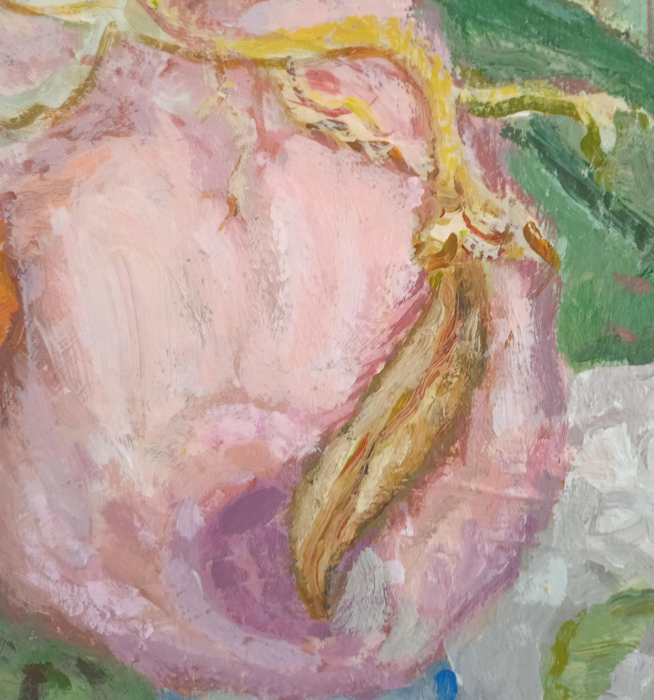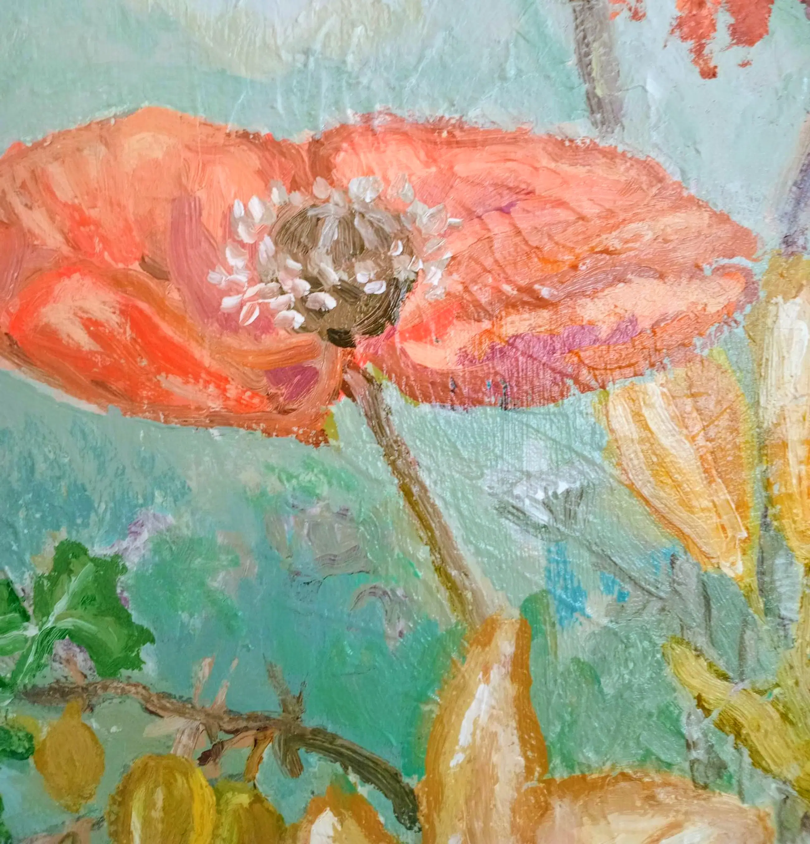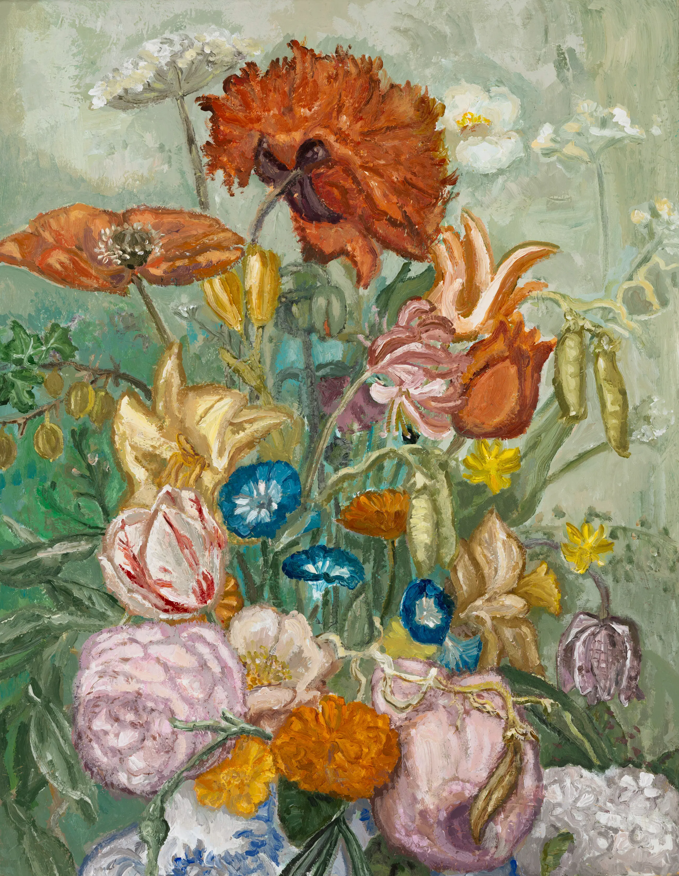"Bloemen in het groen" 2023, gemaakt in serie "Bloemetjes en Afkomst". Het schilderij is gemaakt in impasto techniek met grote kwasten. Door deze techniek blijft de afdruk van de bewegingen van de kwast in de verf zichtbaar. Het schilderij is van de Nederlandse beeldend kunstenaar Tanja Koelemij. Het wordt in een blanco lijst verkocht en is in goed staat. Binnen Nederland verstuurt of af te halen in Velsen-Zuid, Torenstraat 7, Noord-Holland.