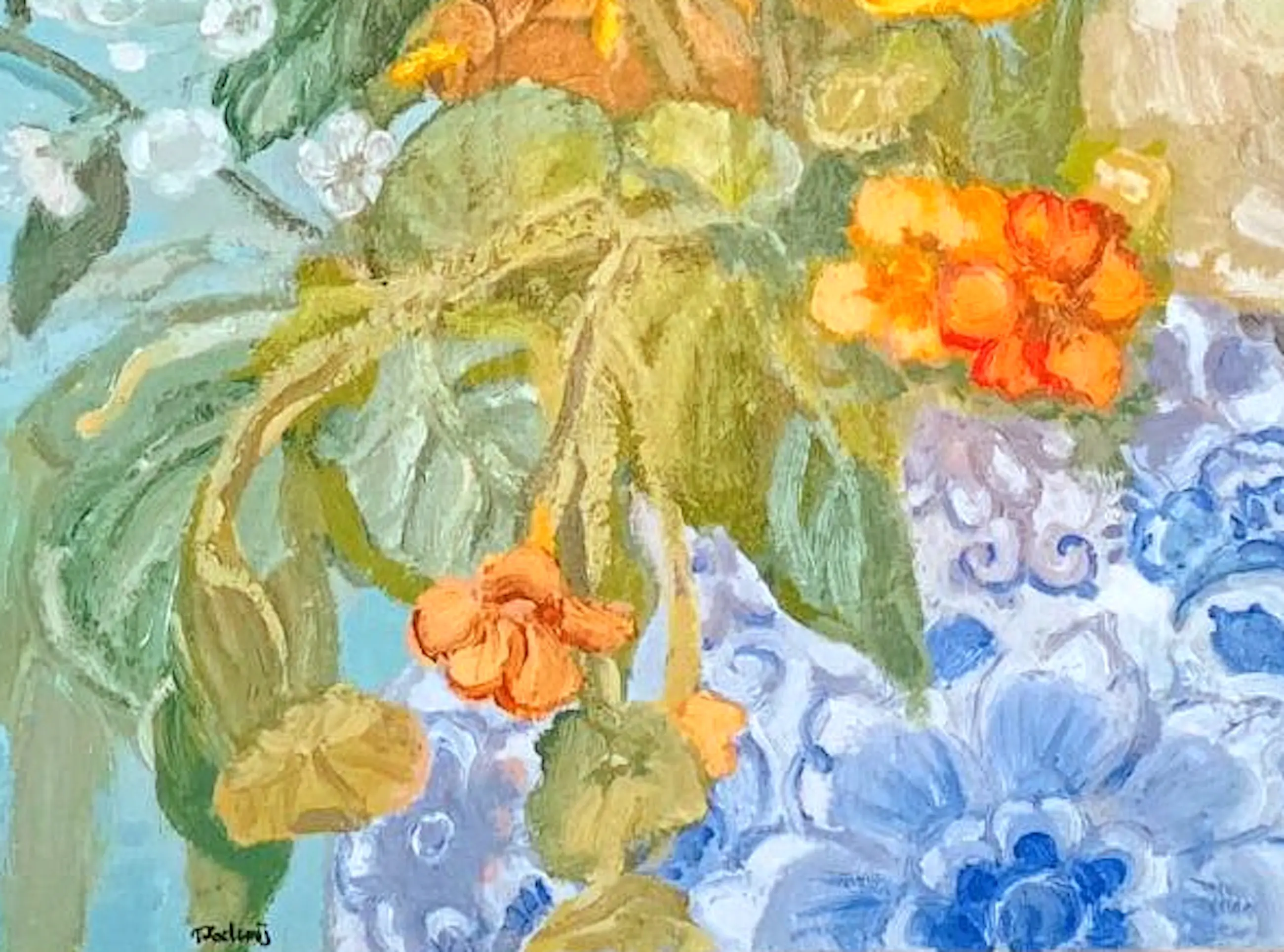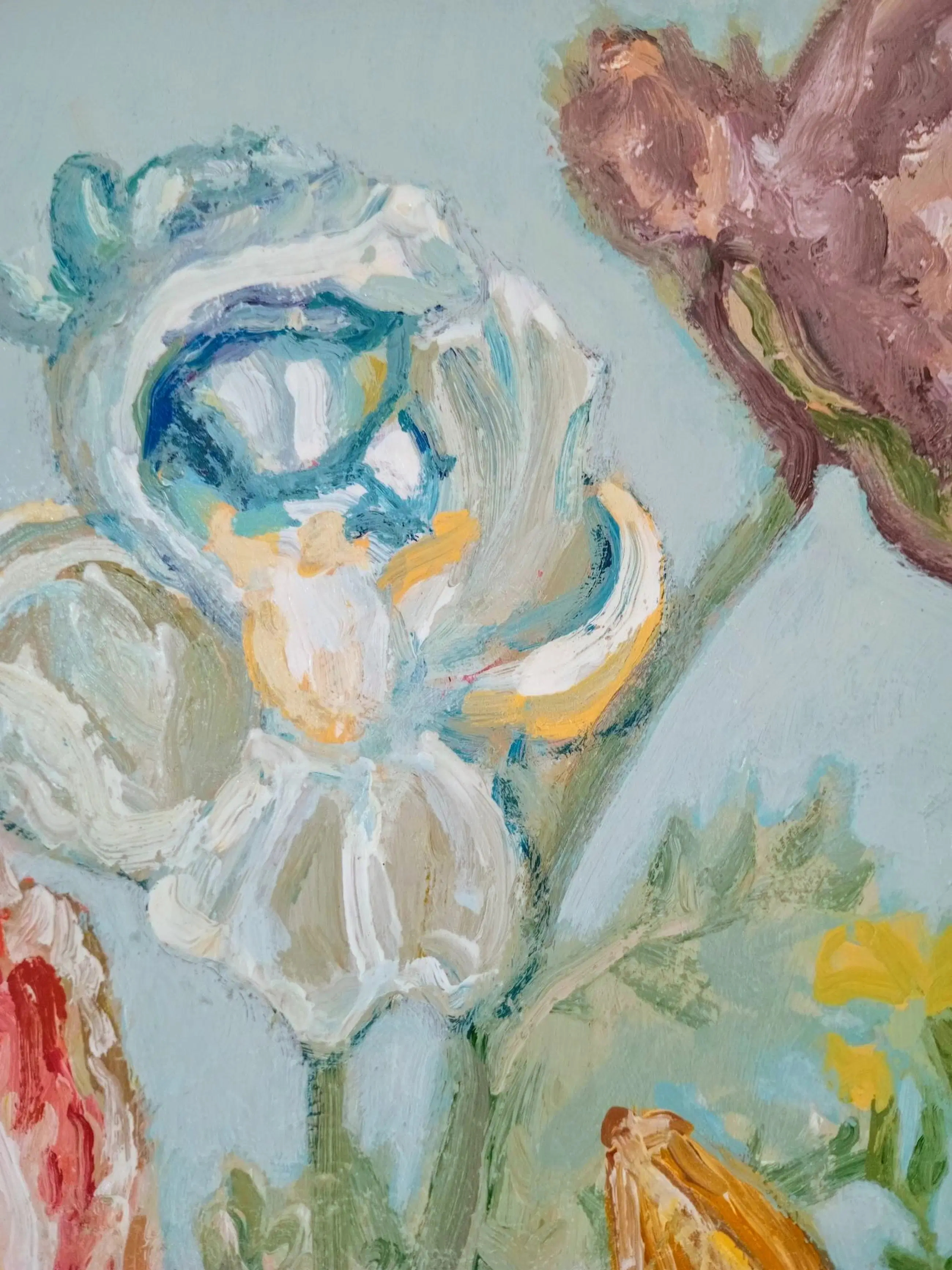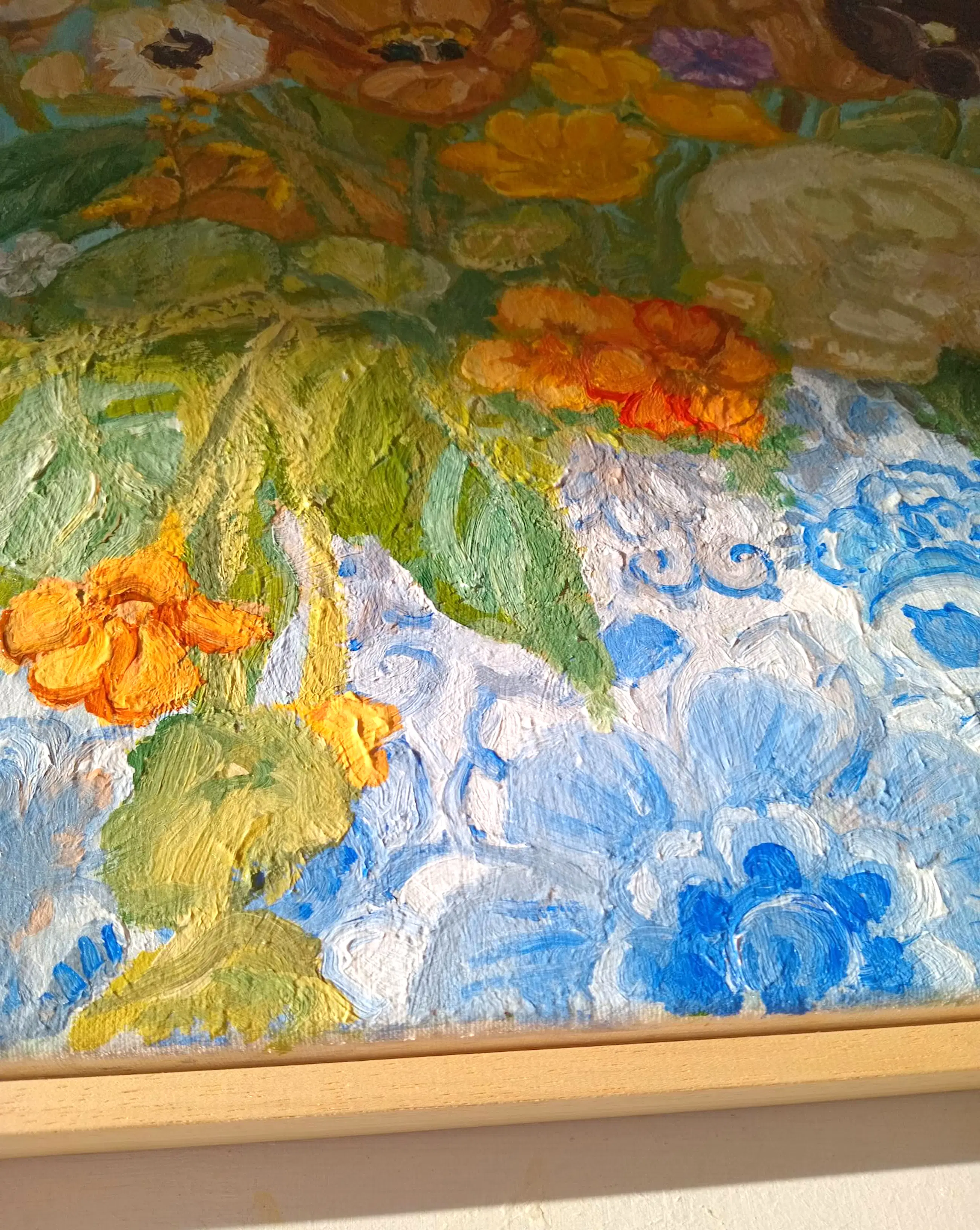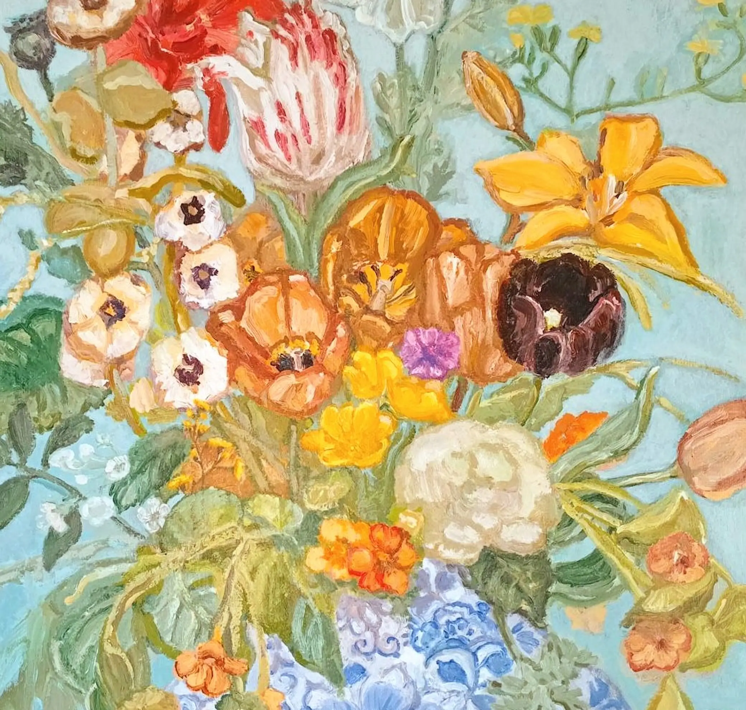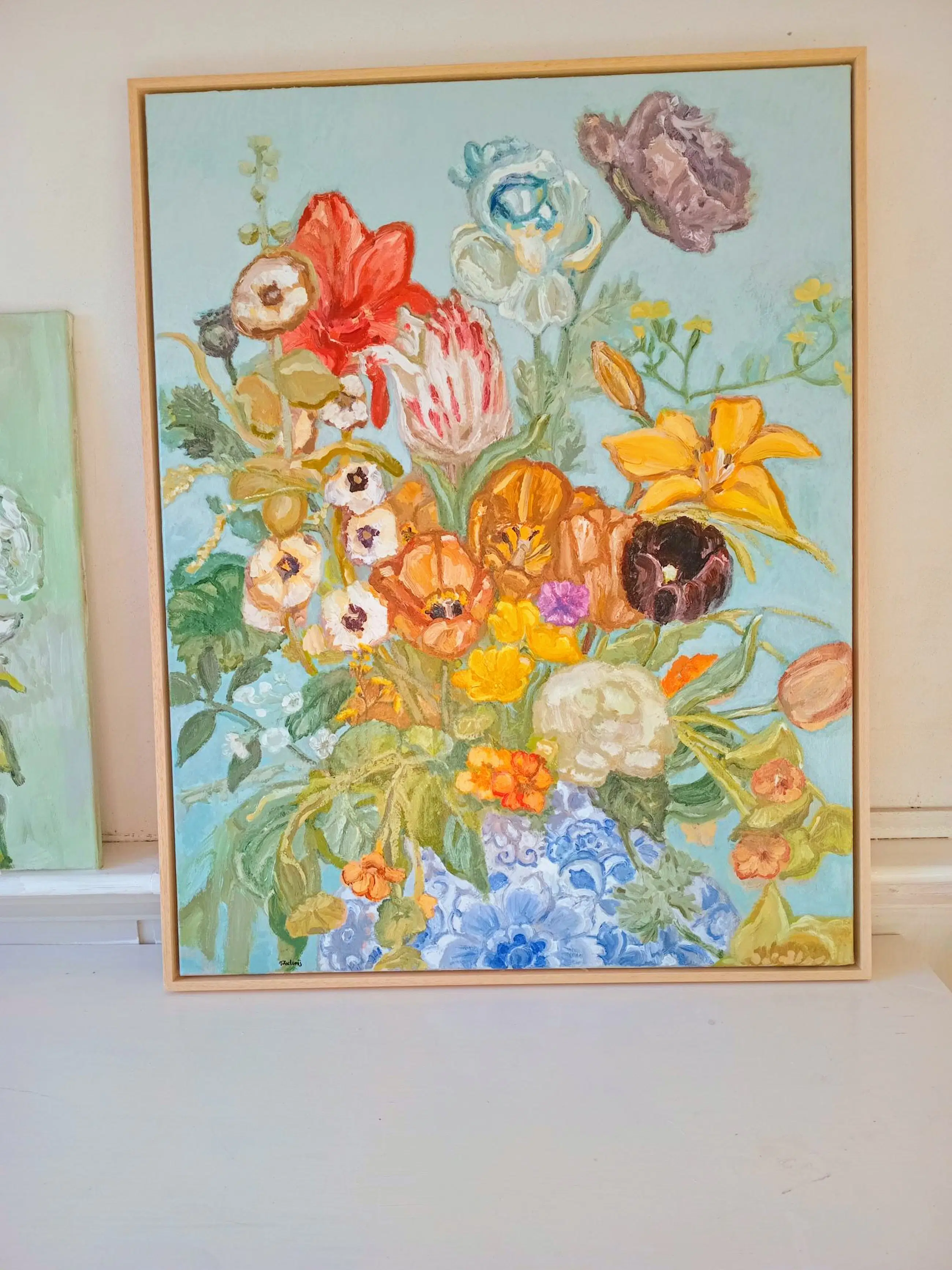 "de Blauwe Vaas" 2023, gemaakt in serie "Bloemetjes en Afkomst". Het schilderij is gemaakt in impasto techniek met grote kwasten. Door deze techniek blijven de bewegingen van de kwast in de verf zichtbaar. Het schilderij is van de Nederlandse beeldend kunstenaar Tanja Koelemij. Het wordt in een blanco lijst verkocht en is in goed staat. Binnen Nederland verstuurt of af te halen in Velsen-Zuid, Torenstraat 6, Noord-Holland.