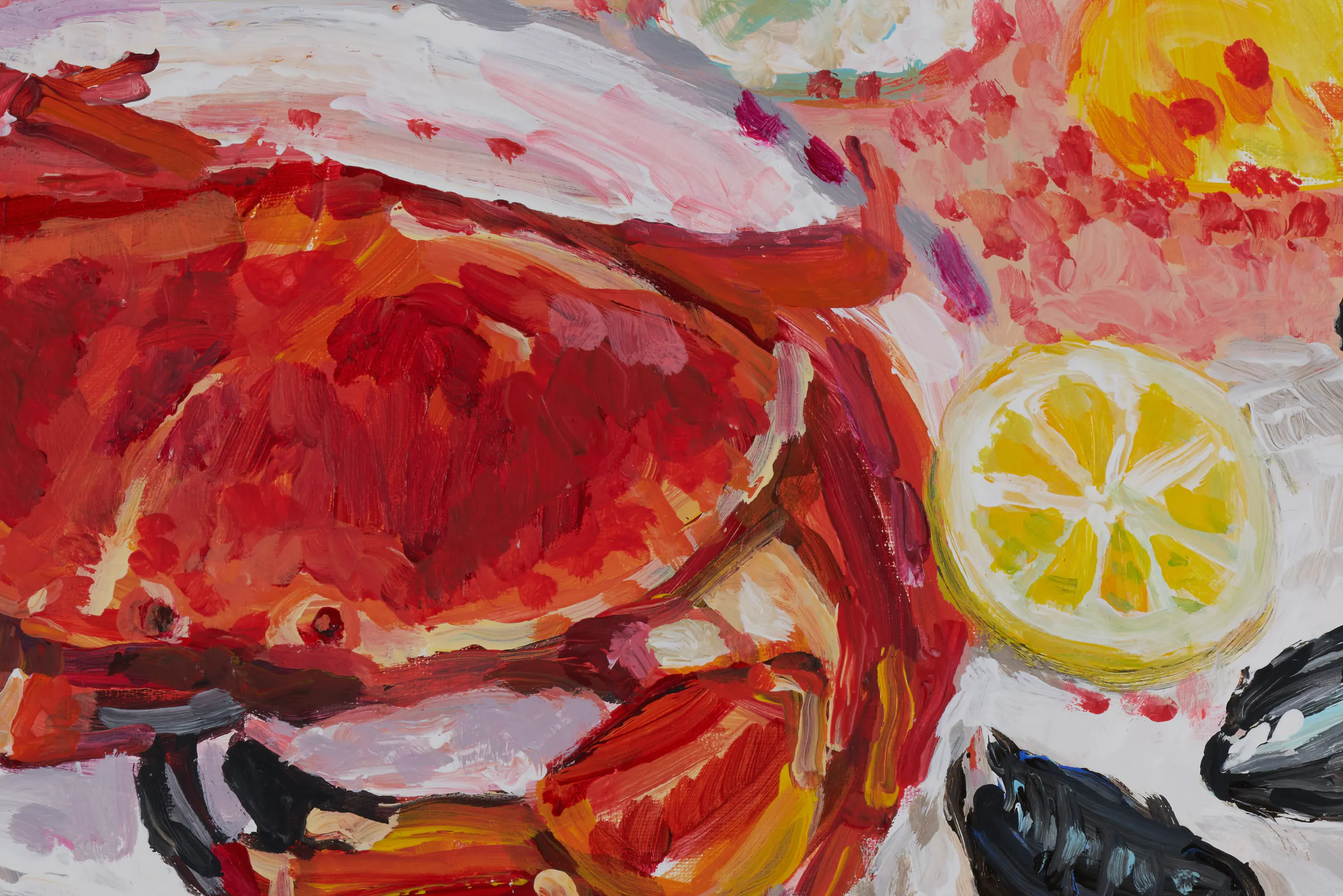 Expressionistisch werk op canvas 2020 van de Nederlandse kunstenaar Tanja Koelemij. Koelemij woont bij de zee en de visafslag. Een maaltijd met vis is één onderwerp wat Koelemij graag en vaak schildert.