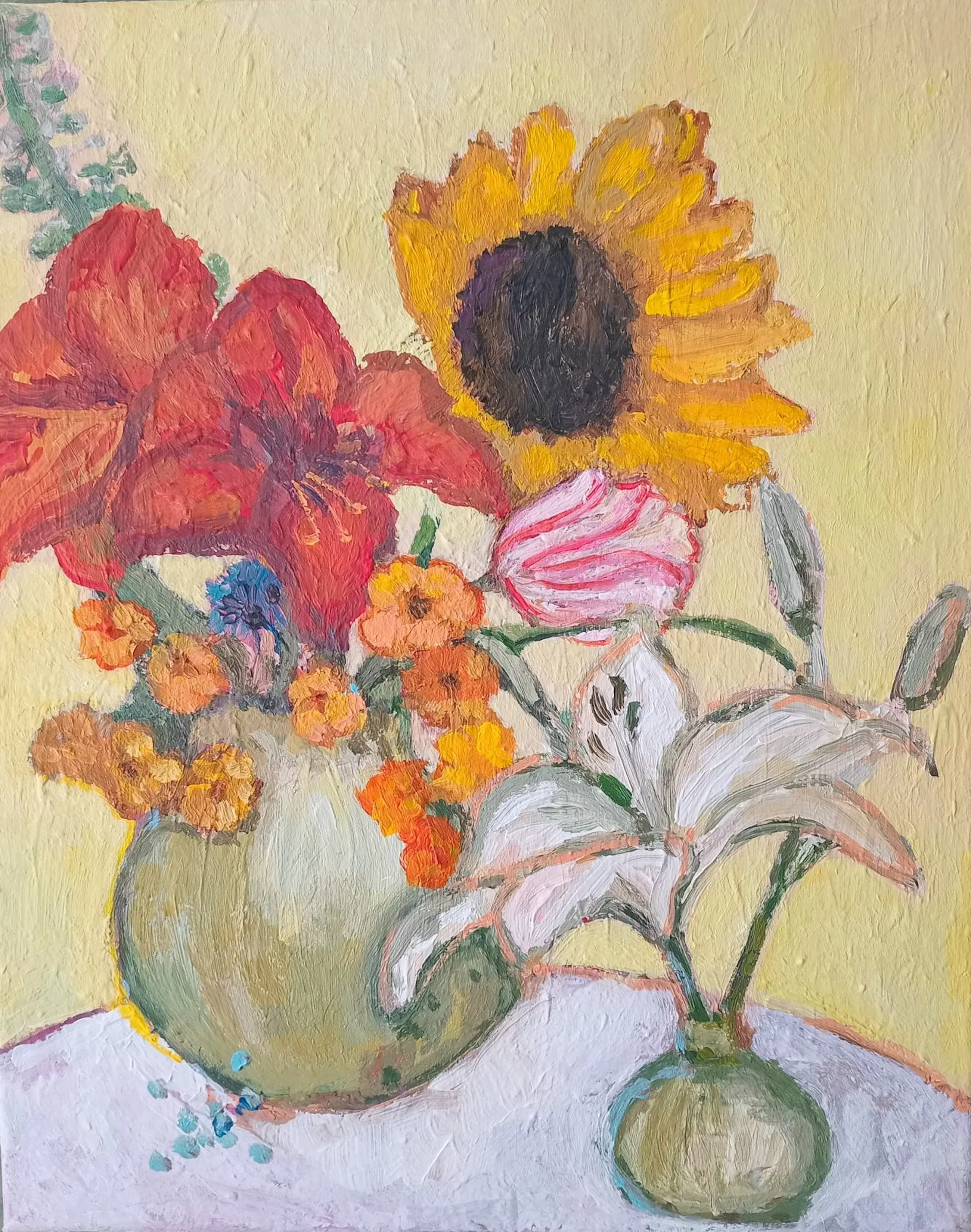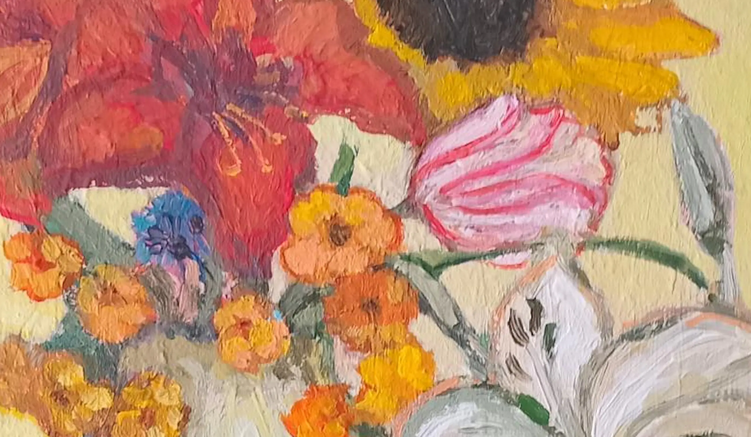 Uit de serie stillevens oranje bloemen van de Nederlandse kunstschilder Tanja Koelemij. Af te halen in Velsen-Zuid of binnen Nederland en Europa aangetekend opgestuurd.