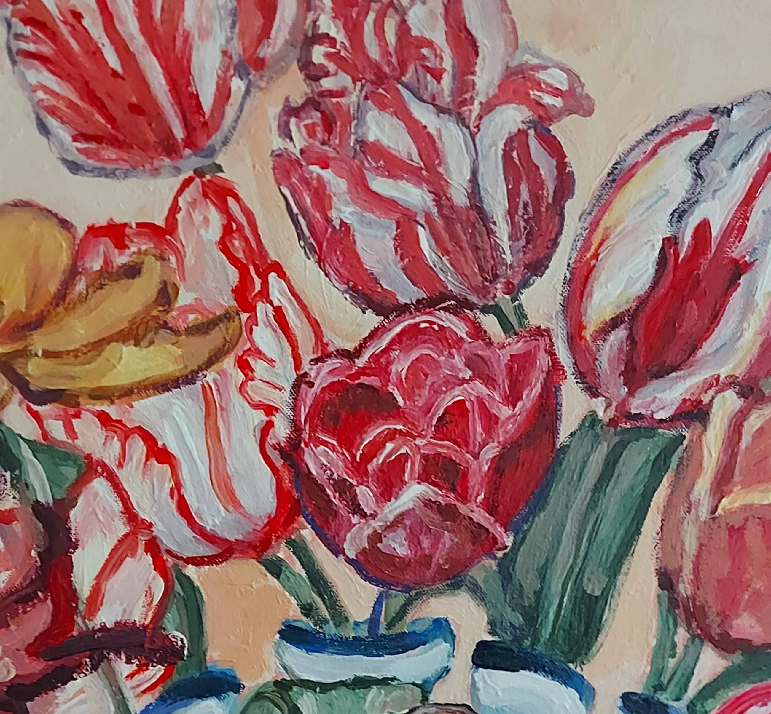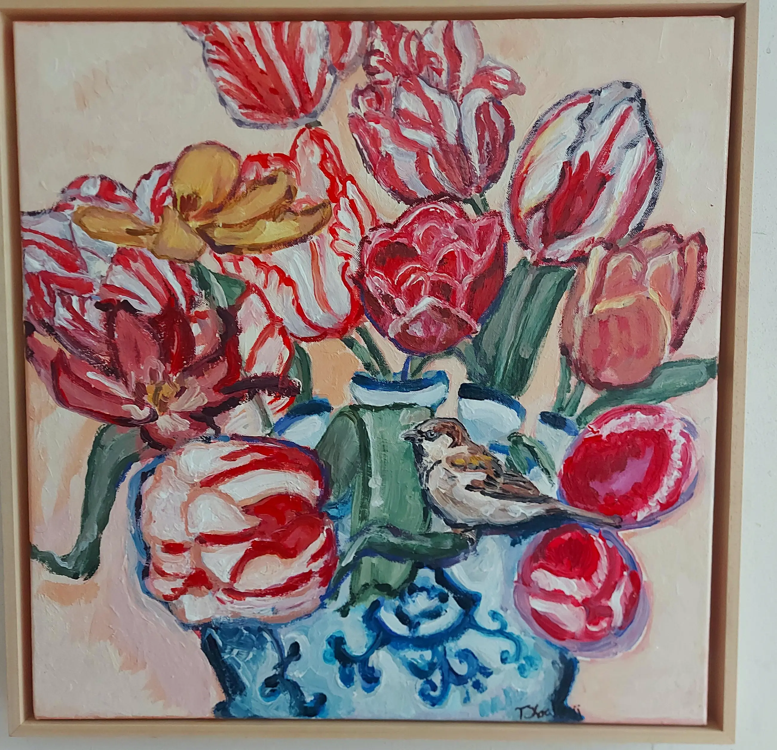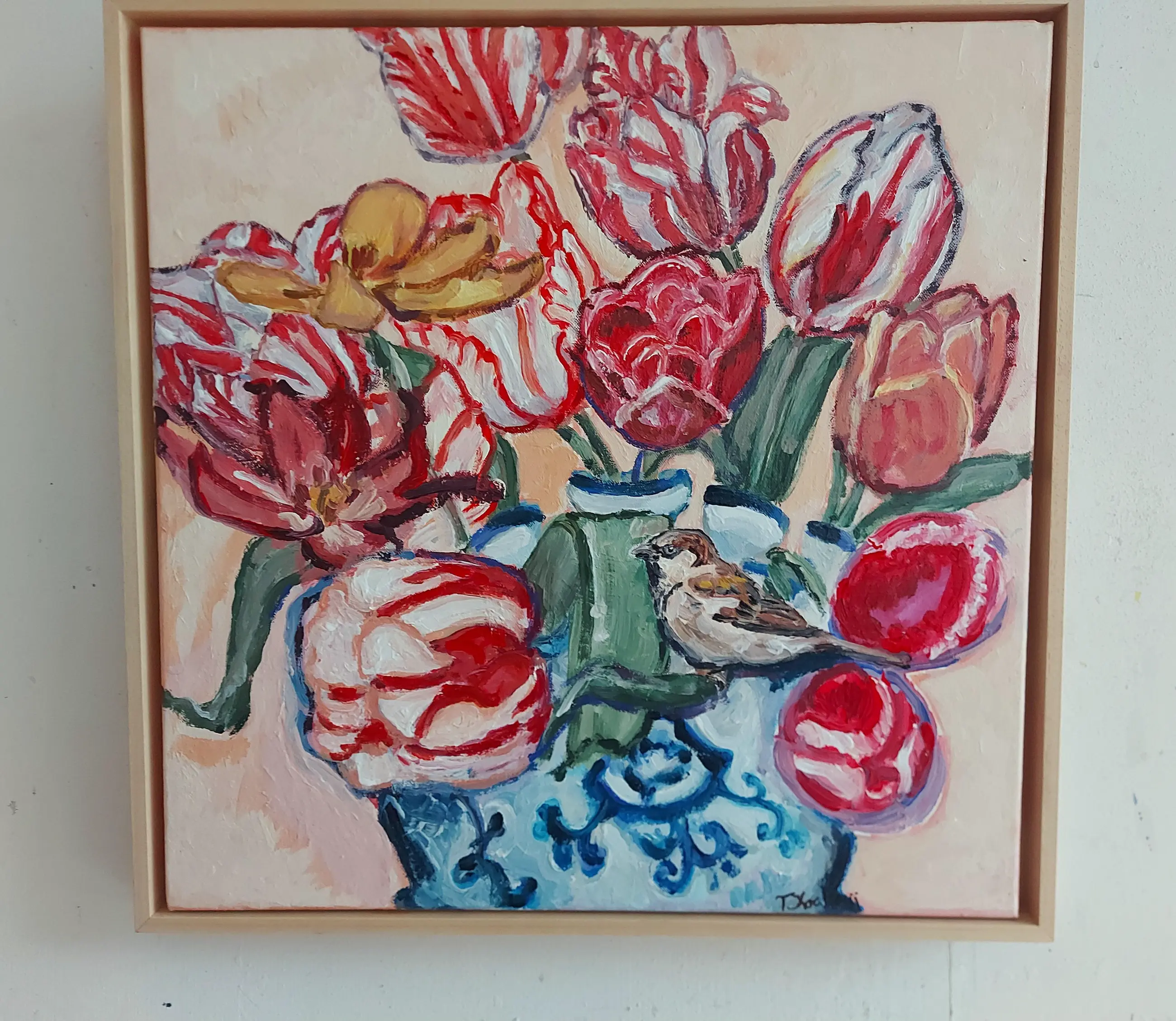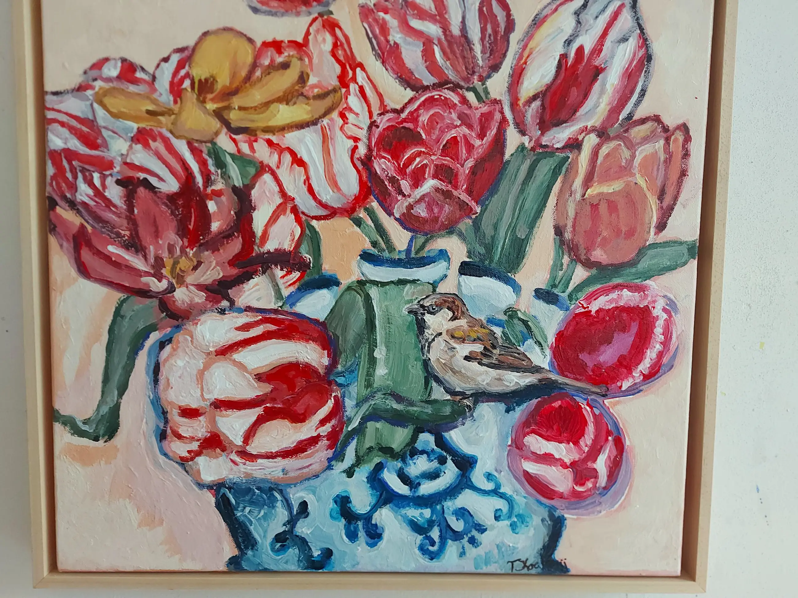 Post-impressionistisch schilderij van een stilleven met tulpen en mus. In de dikkere lagen verf is de kwaststreek goed zichtbaar. Ingelijst verkocht. Studio/atelier bezoek (in Velsen-Zuid, Noord-Holland) mogelijk. www.tanjakoelemij.com