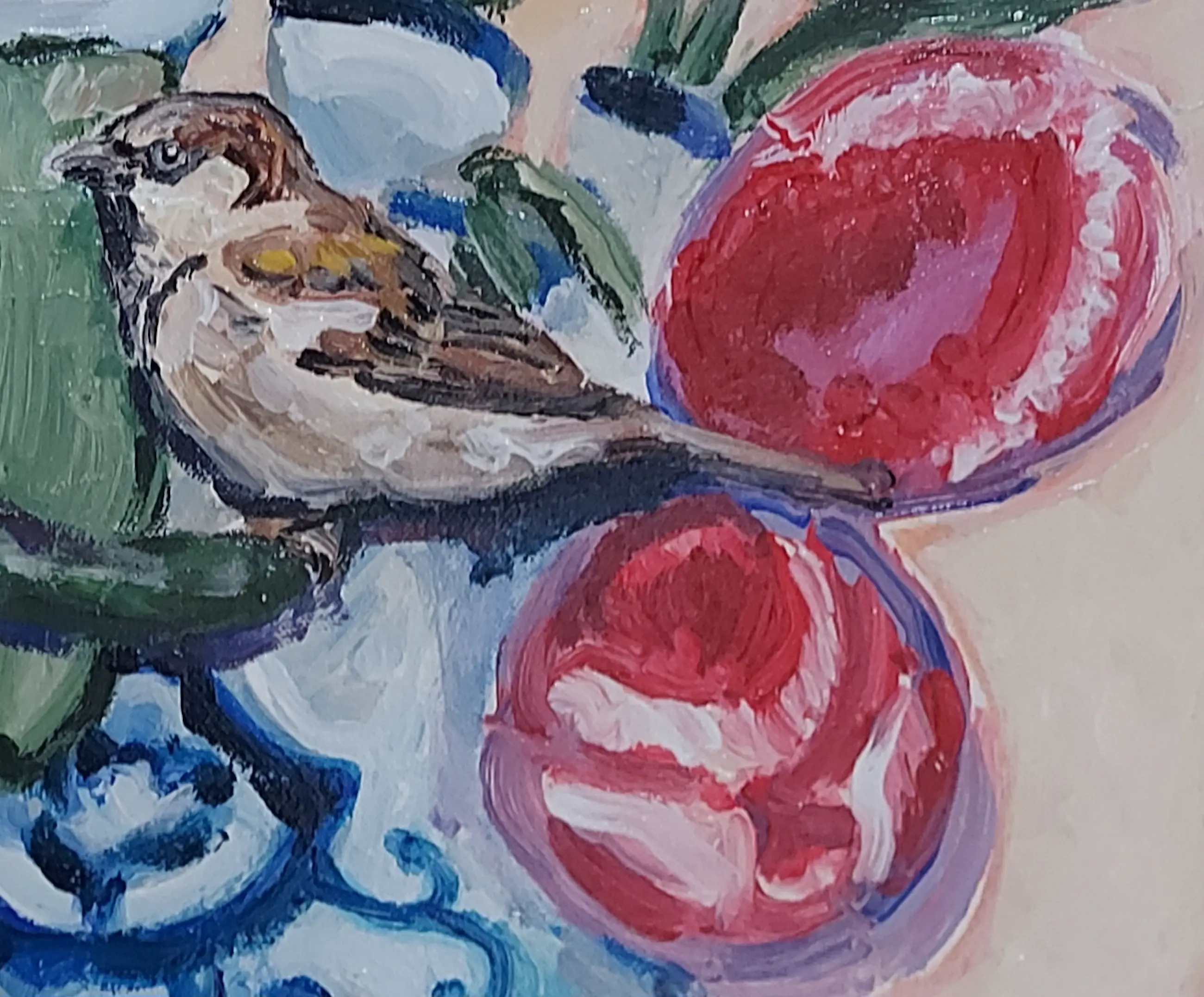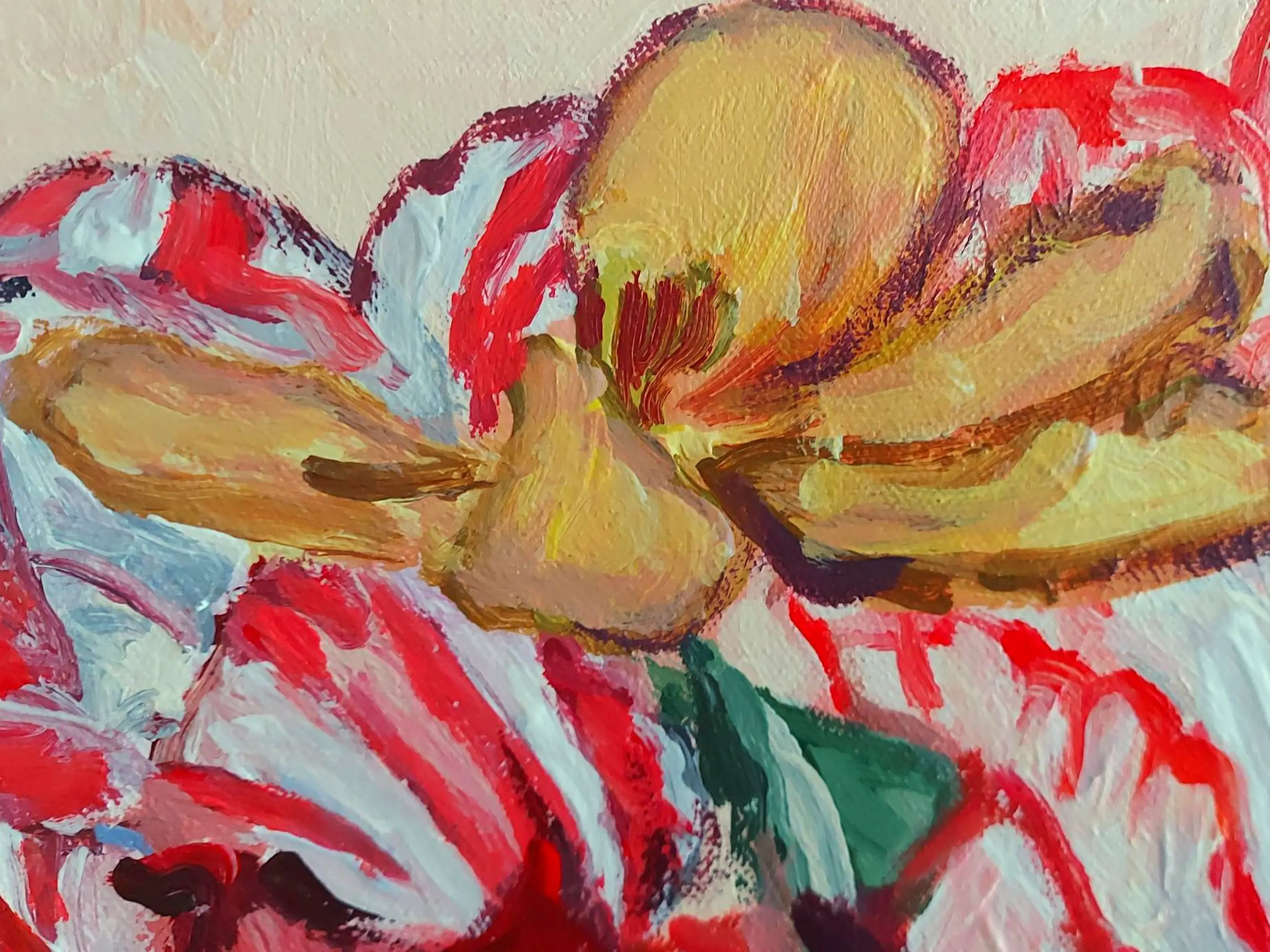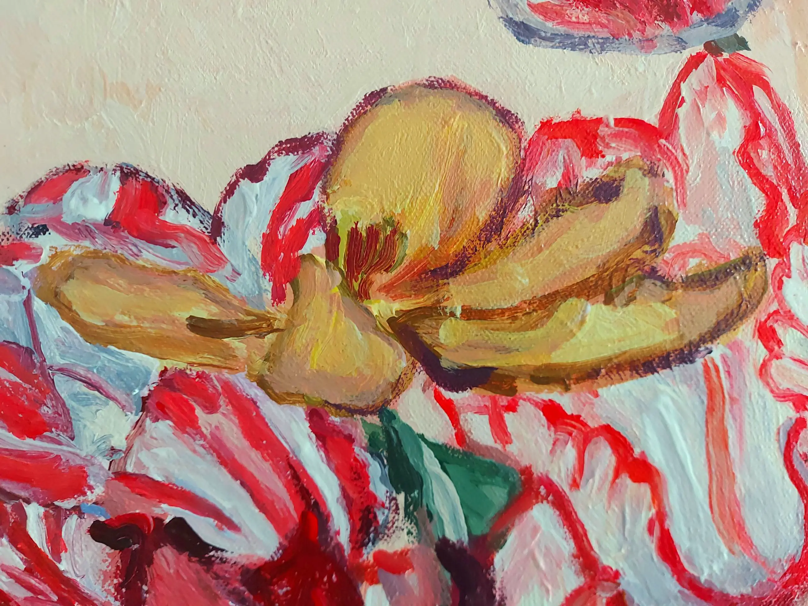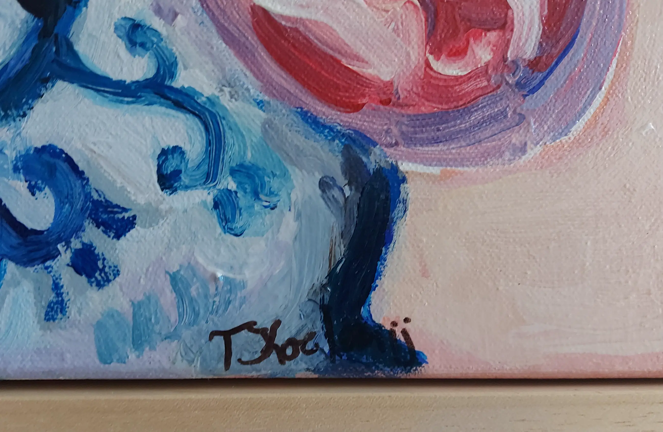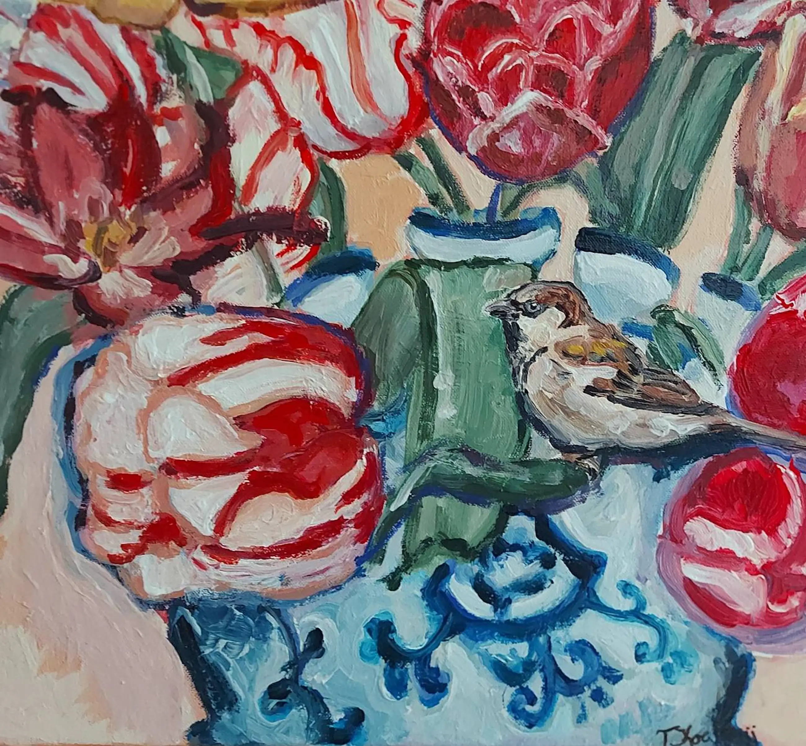Post-impressionistisch schilderij van een stilleven met tulpen en mus. In de dikkere lagen verf is de kwaststreek goed zichtbaar. Ingelijst verkocht. Studio/atelier bezoek (in Velsen-Zuid, Noord-Holland) mogelijk. www.tanjakoelemij.com