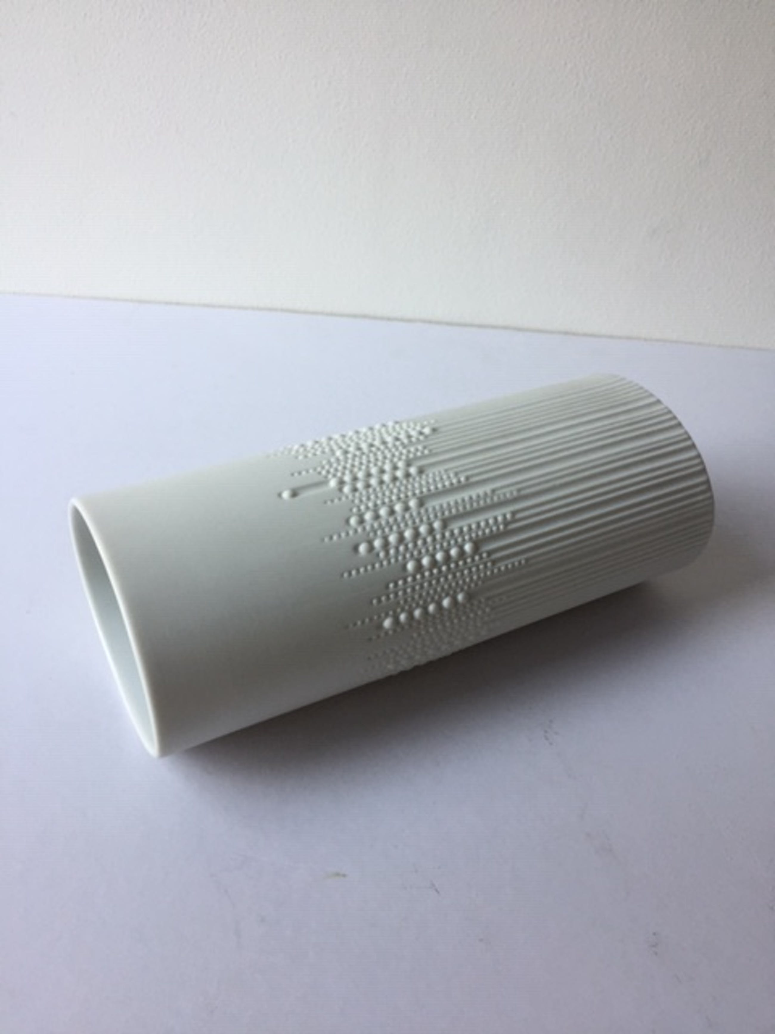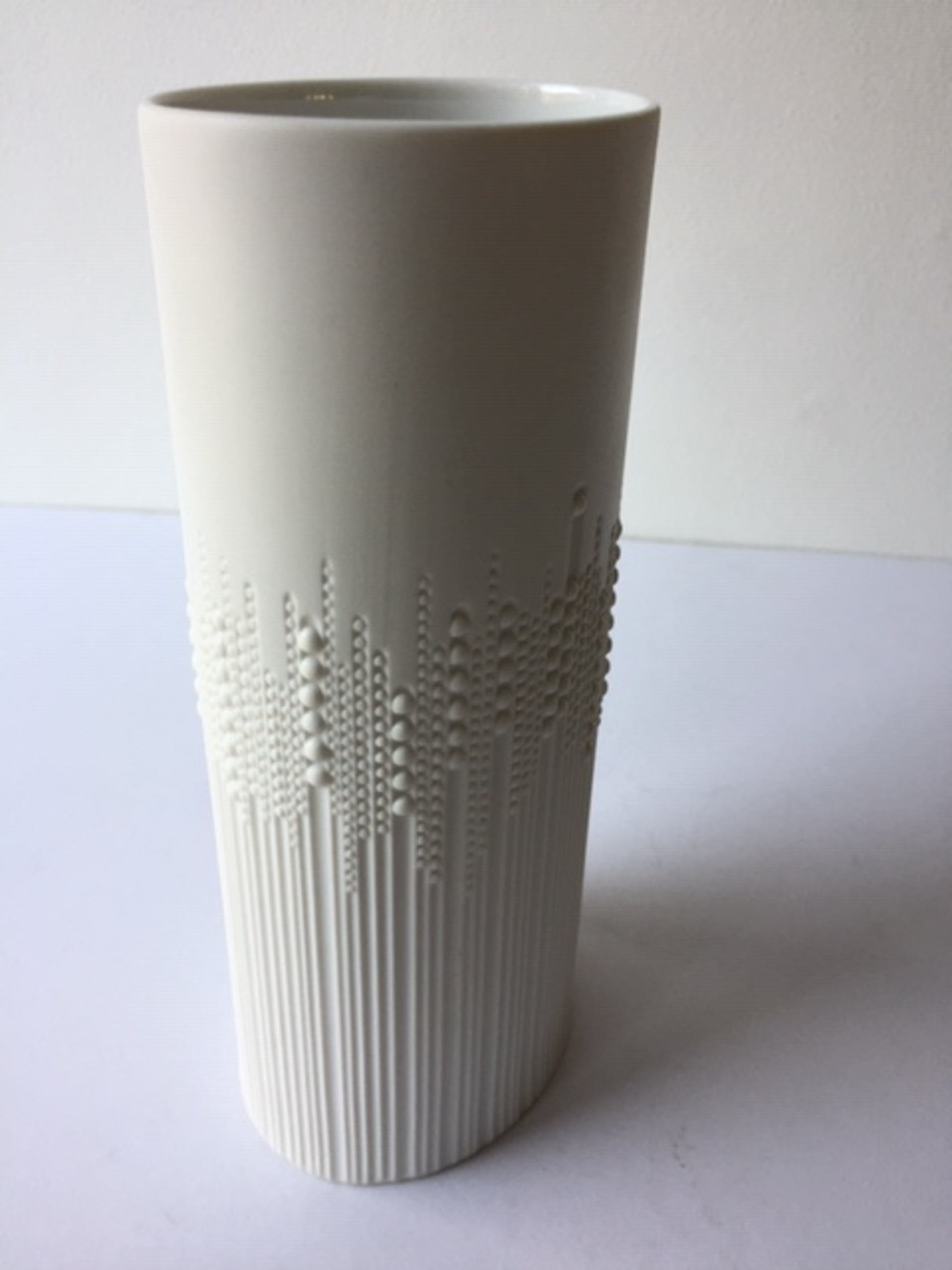 Prachtige, ovalen vaas van Tapio Wirkkala met een reliëf van pareldruppels. Wit, biscuit (mat) porselein met een vleugje lichtgrijs. Ca. 1974. Drukgesigneerd met T. Wirkkala. Een collector's item.