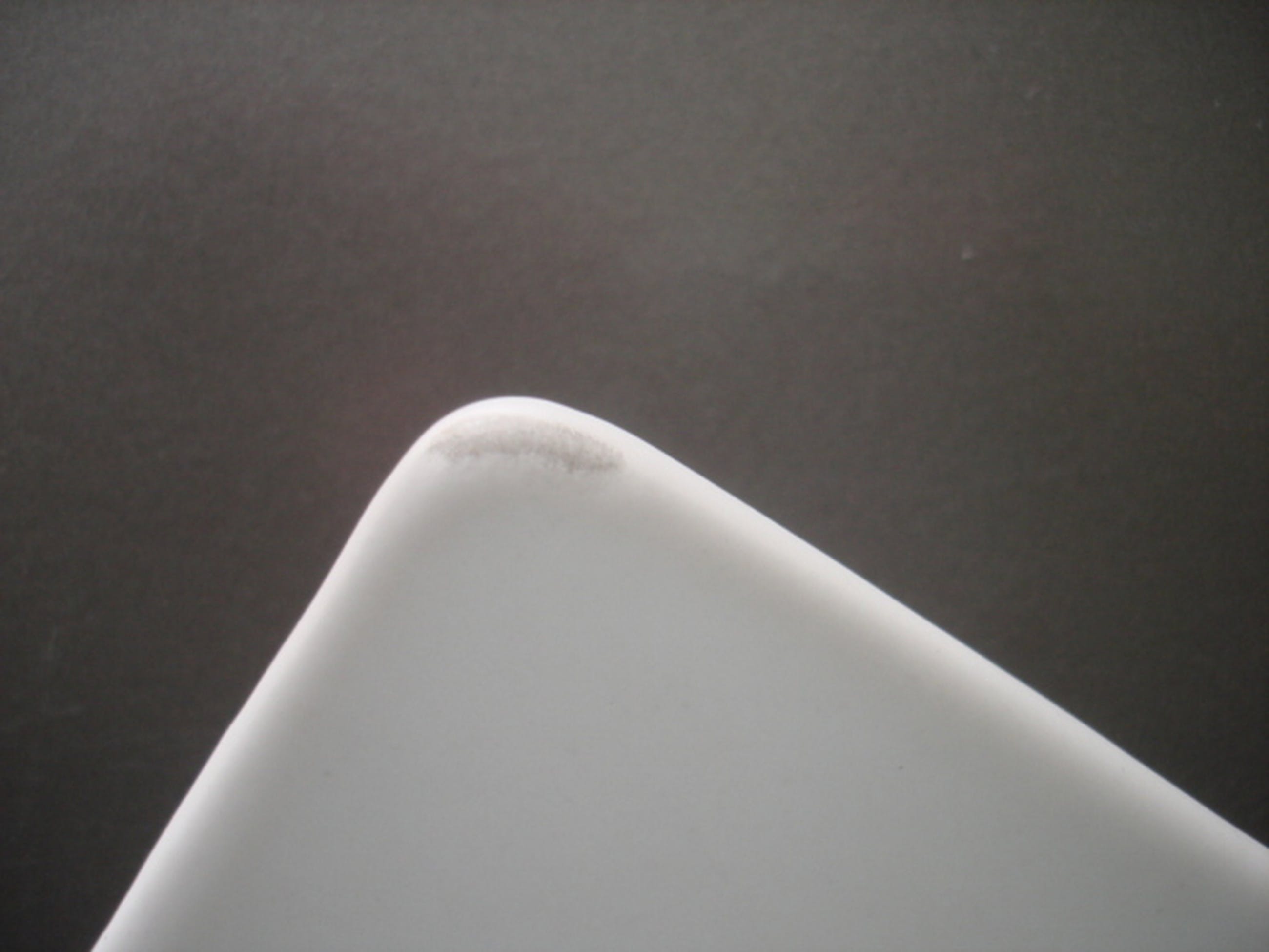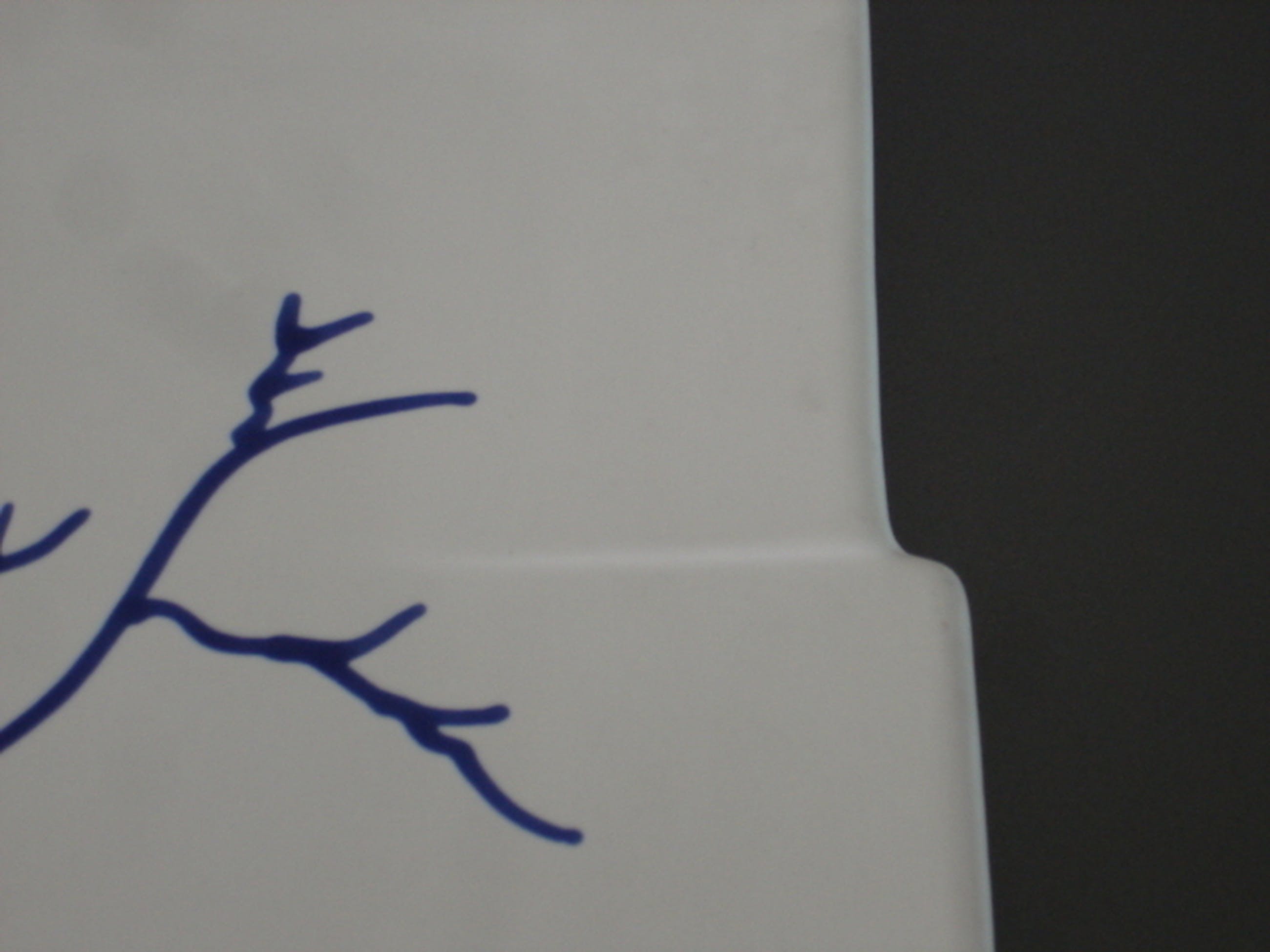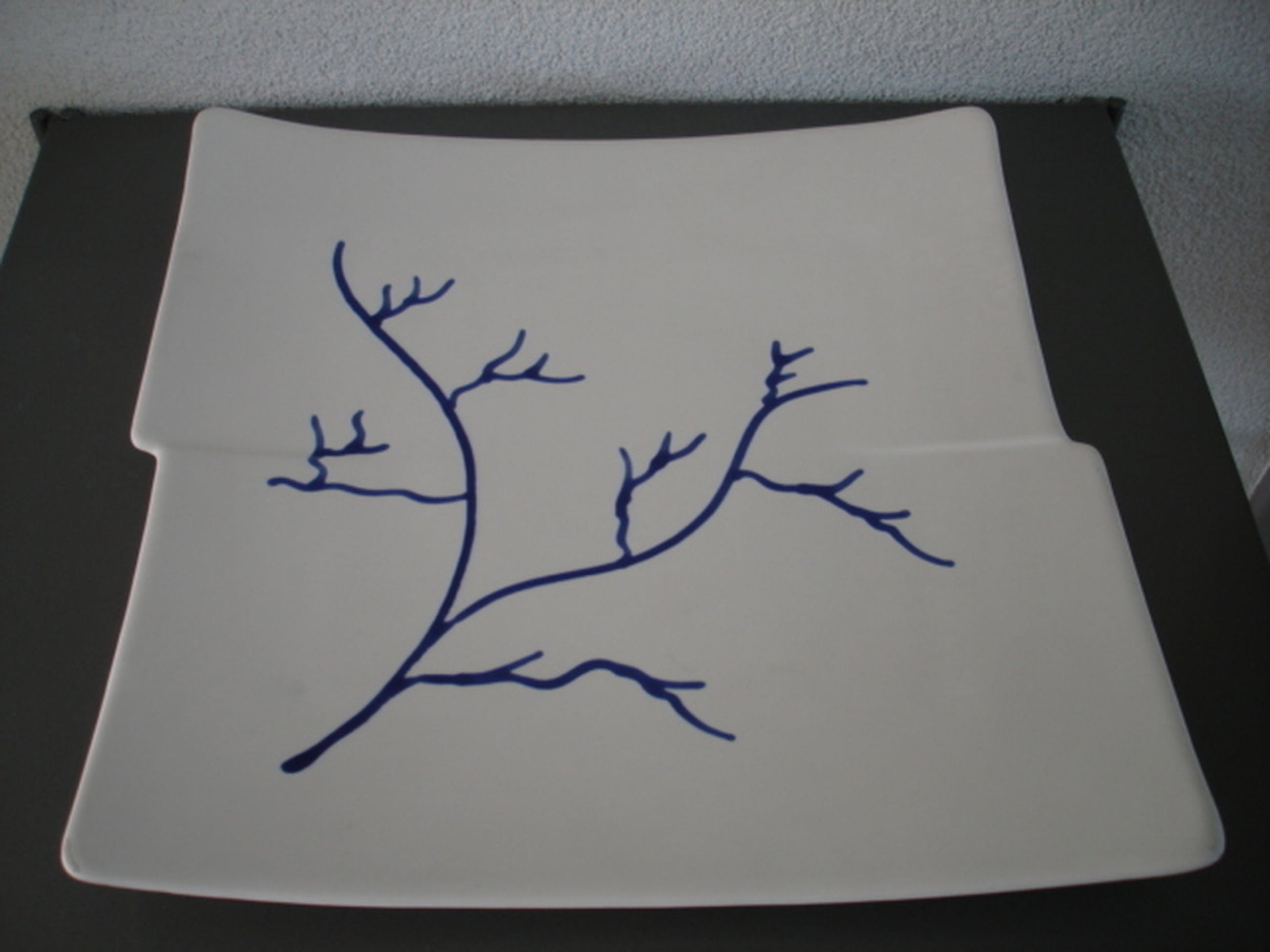 Een mooie schaal met een verrassende verspringing en een decoratie in de vorm van een blauwe tak.