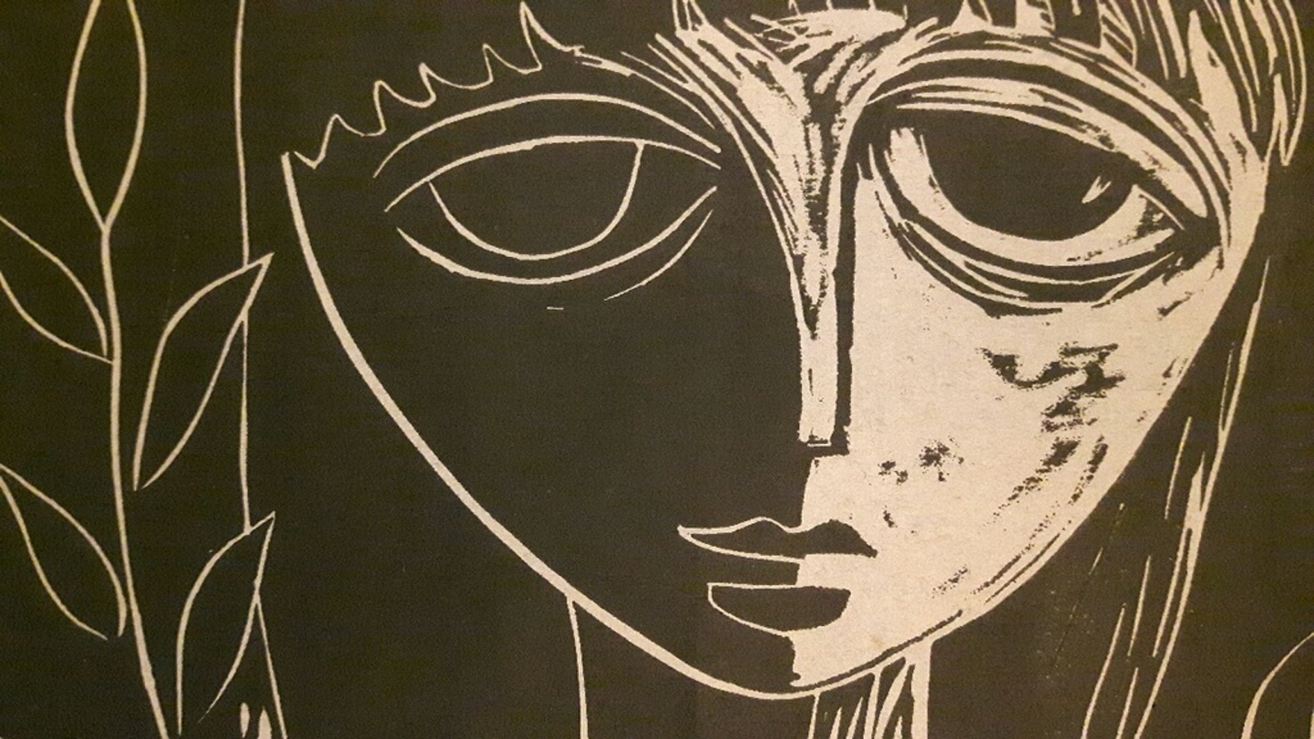 Linosnede, zwart op grijzig papier