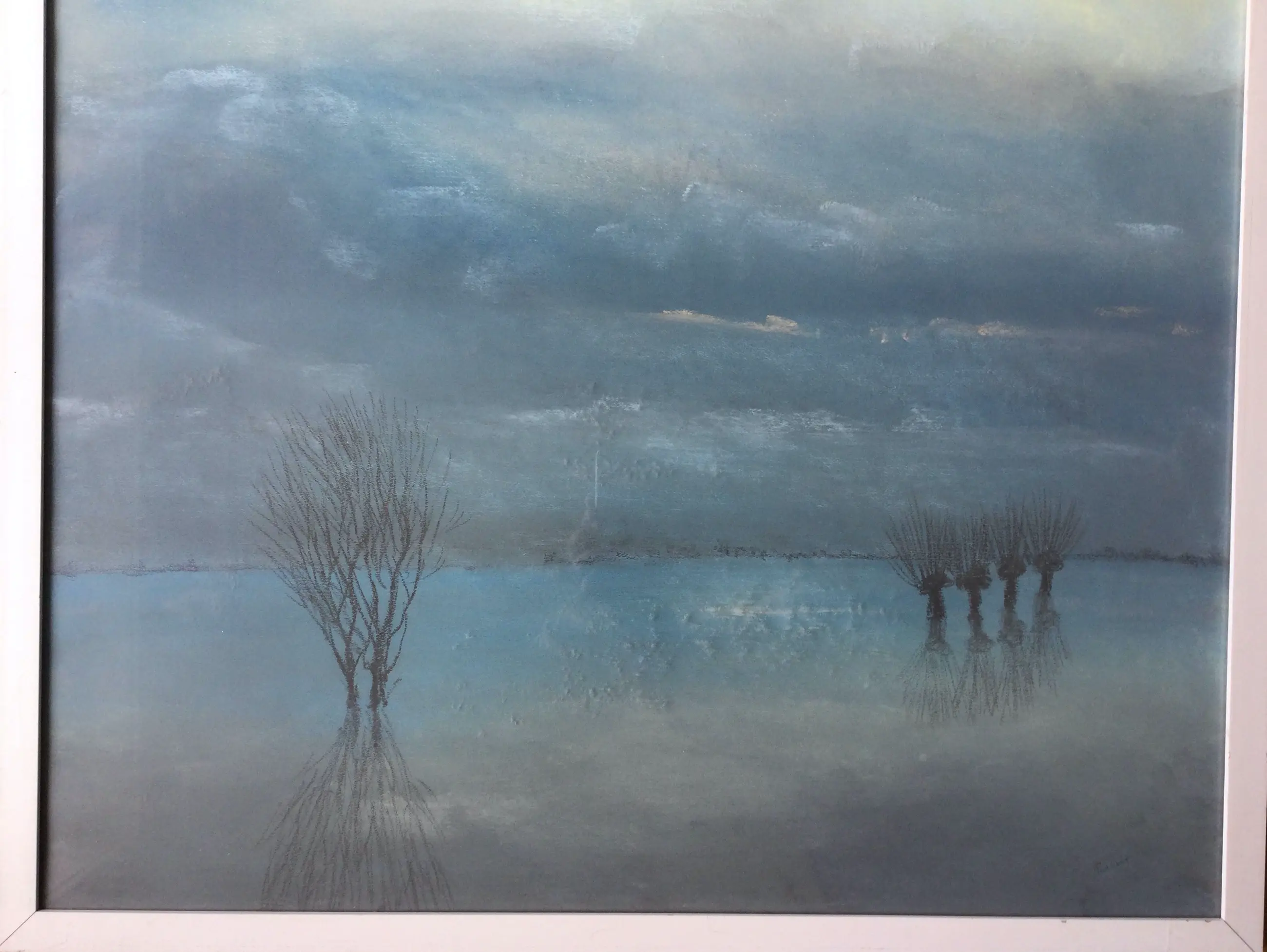 Deze grote en prachtige landschappelijke krijttekening van Ted Licht lijkt welhaast een schilderij! Met de overheersend grijze en blauwe tinten weet de tekenaar alle nuances van het landschap vast te leggen. De luchtpartij is meesterlijk gemaakt. Voorstelling: een overstromend rivierlandschap Met de hand gesigneerd, rechtsonder Het werk is (mogelijk door de kunstenaar zelf) ingelijst in een witte houten lijst. Het verkeert in een mooie staat, met de kanttekening dat onderin wat vlekjes van krijt achter het glas zichtbaar zijn. Voorzien van ophang faciliteit, kan zo aan de muur! Foto's maken deel uit van de beschrijving.