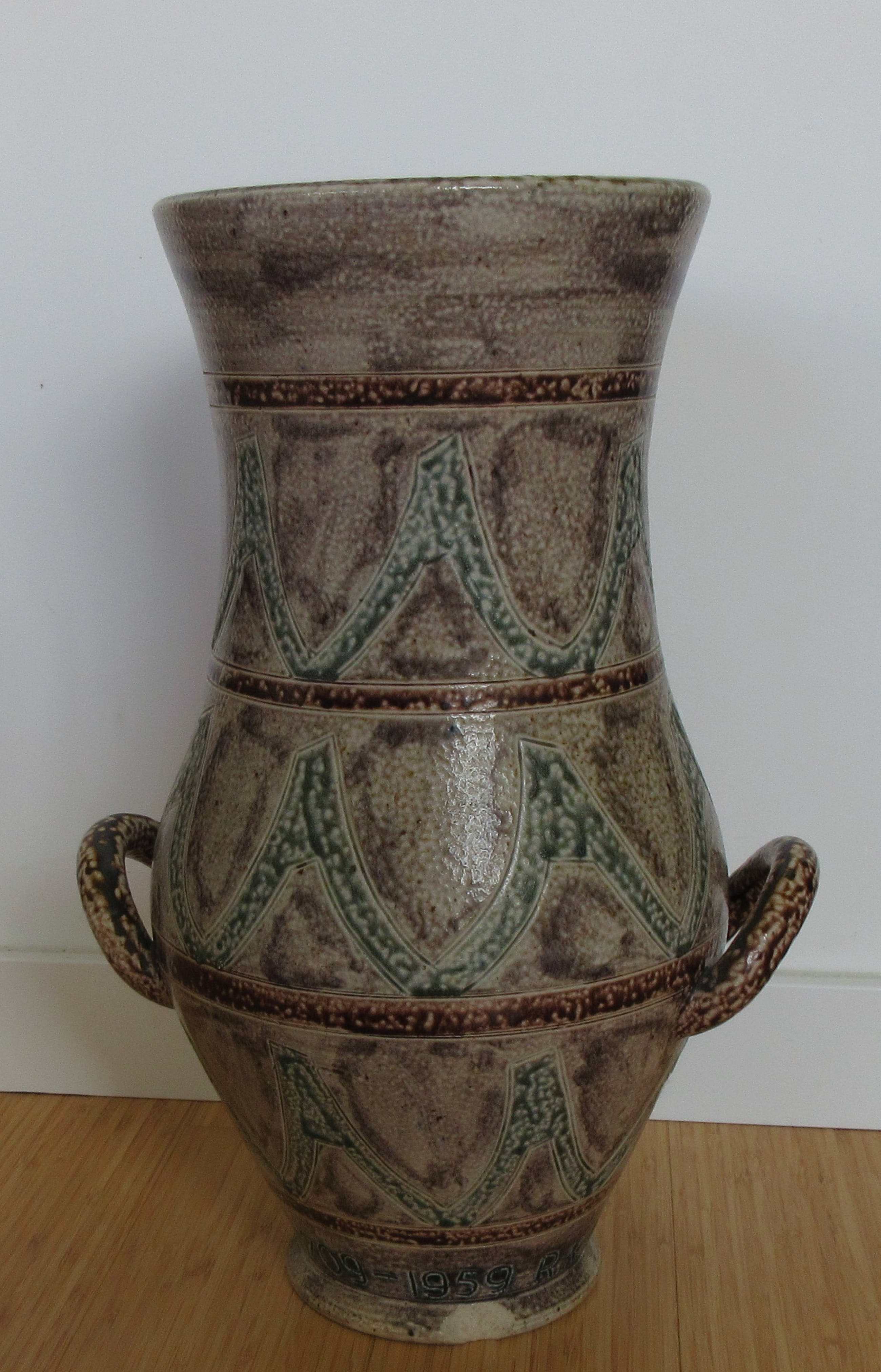 Monumentale unica amfoor vaas gemaakt ter ere van het 250 jarig bestaan van de bibliotheek in Oudewater (1709-1959) in 1959. Uitgevoerd bij steengoed fabriek St. Joris Terraco Draak uit Beesel. Ontwerp en uitvoering Joep Thissen. In goede conditie, heeft alleen een grote chip op de voet van de vaas. Volledig gemerkt met ingedrukte merken op de achterzijde en voorzien van de signatuur van Joep Thissen; JTh. Voorkeur binnen Nederland is afhalen in verband met het formaat en de kwetsbaarheid van de vaas.