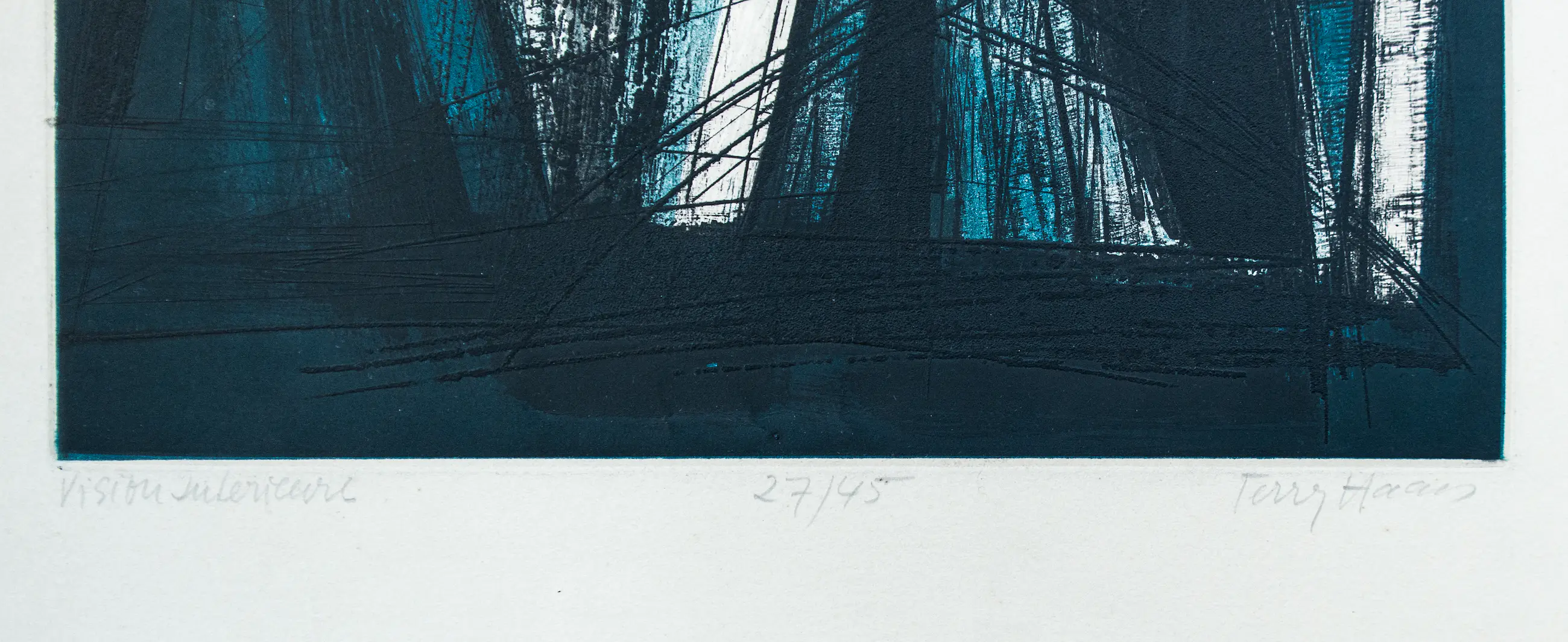 Twee kleuretsen op Arches, handgesigneerd, genummerd en getiteld. Vision Interieure: Formaat afbeelding 49 x 32,50 cm, formaat papier 67 x 50 cm. Oplage 27/45. Monte Cinto: Formaat afbeelding 32 x 42 cm, formaat papier 50 x 66 cm. Oplage 18/50.