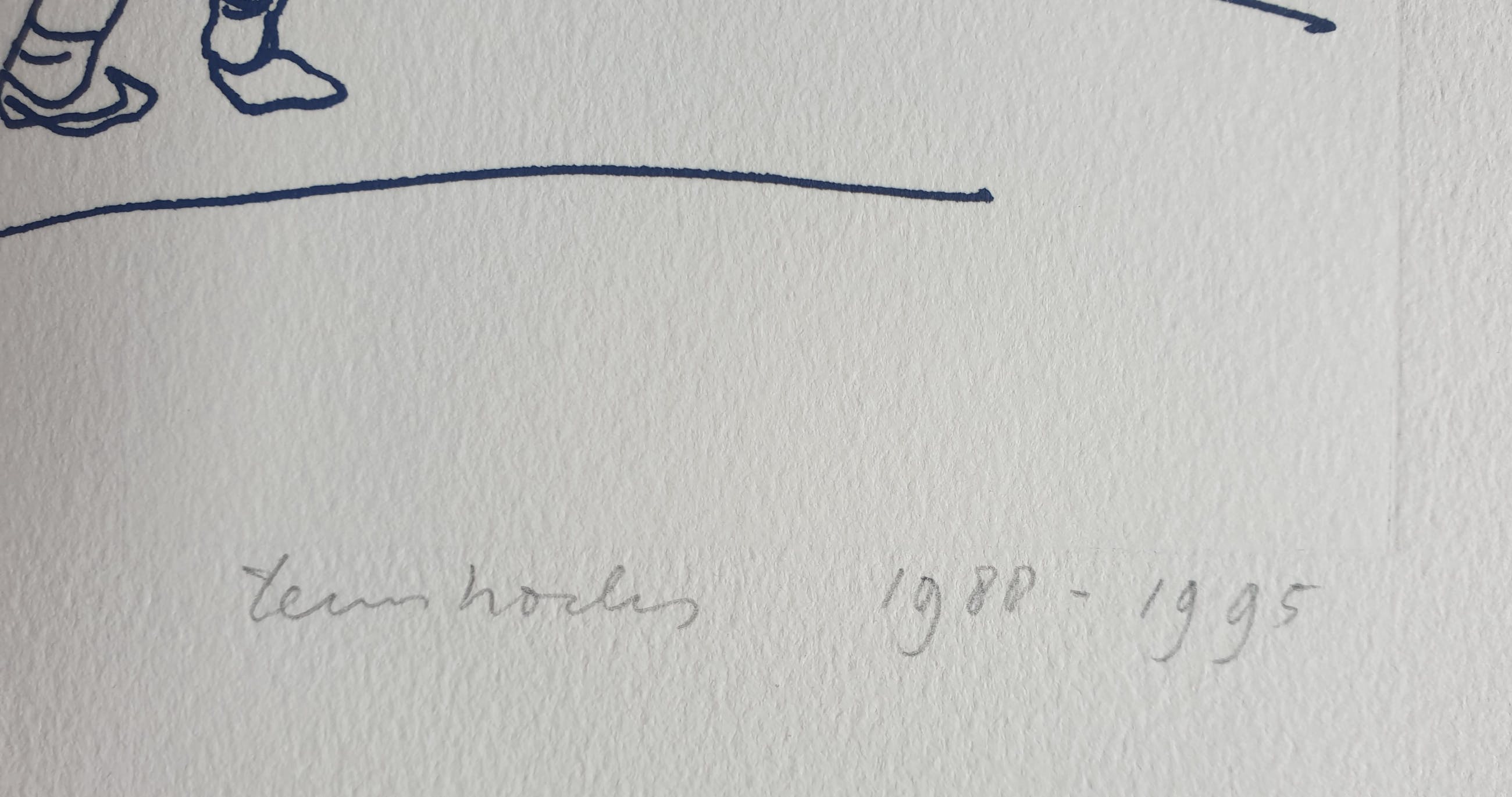 Ets van Teun Hocks. Man met huis op zijn rug. De ets is gedrukt op Arches papier en komt uit 1988/1995. Nummer 3/125. Formaat 23 x 31 cm.