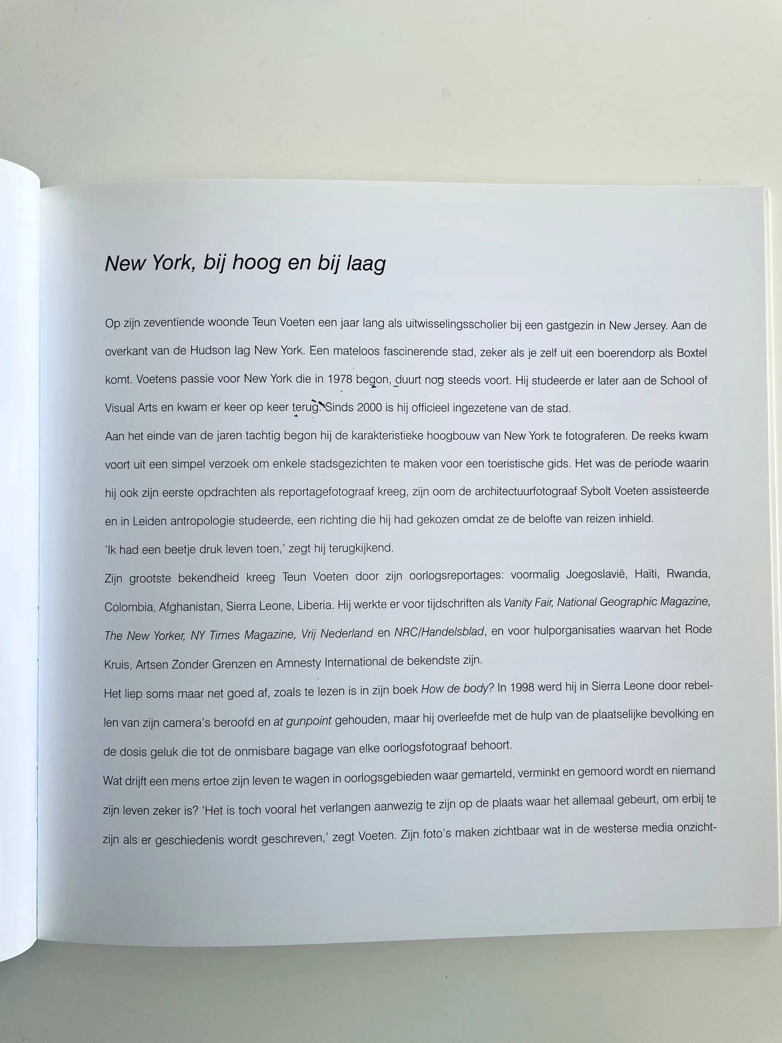 Gesigneerde uitgave van New York New York van fotograaf Teun Voeten. Uitgave van VIPs Gallery Rotterdam, 2005, Engels/Nederlandstalig. Pagina's: 40. Met introductie door Pieter van Oudheusden. Gelimiteerde oplage van 400. Nr. 236.