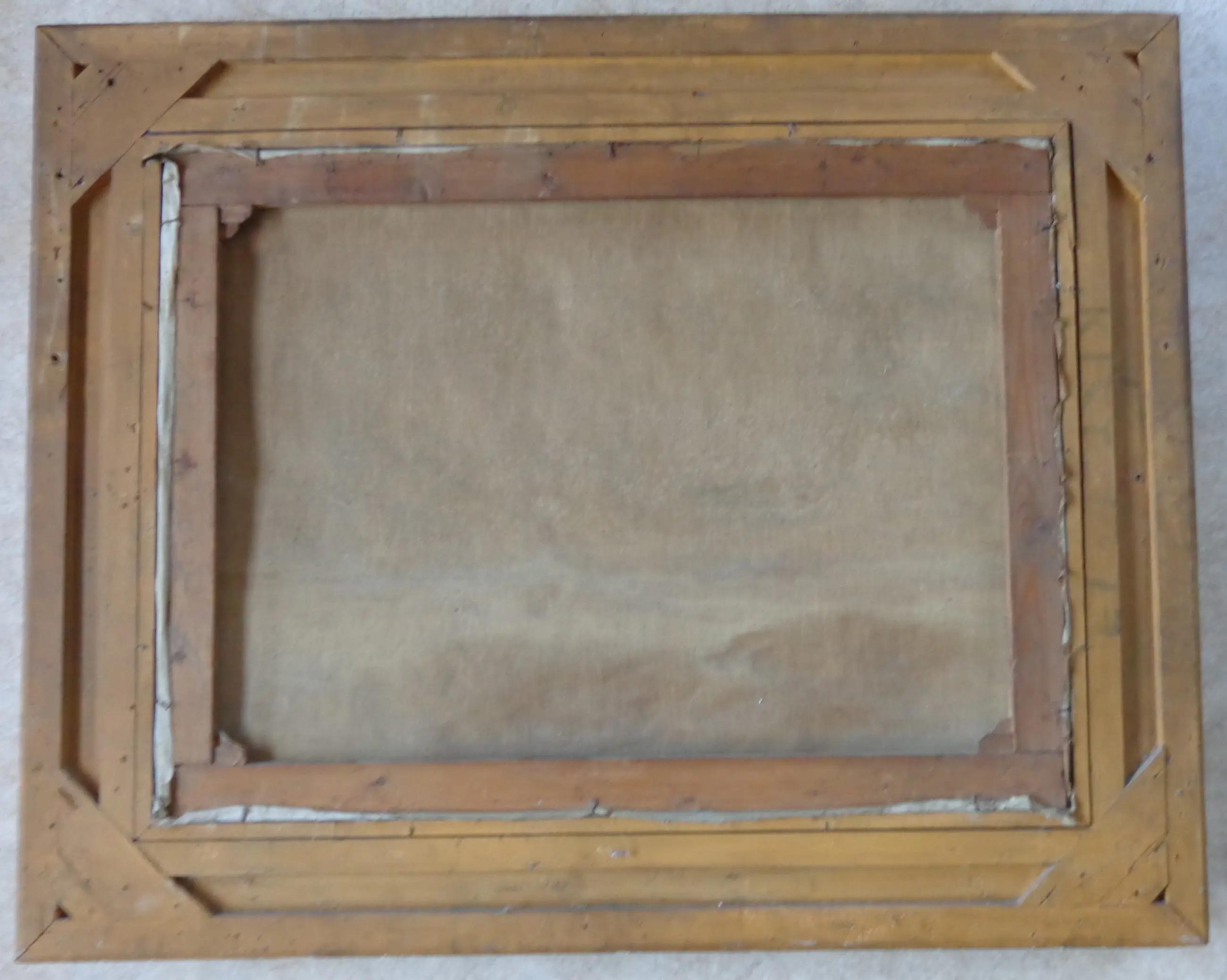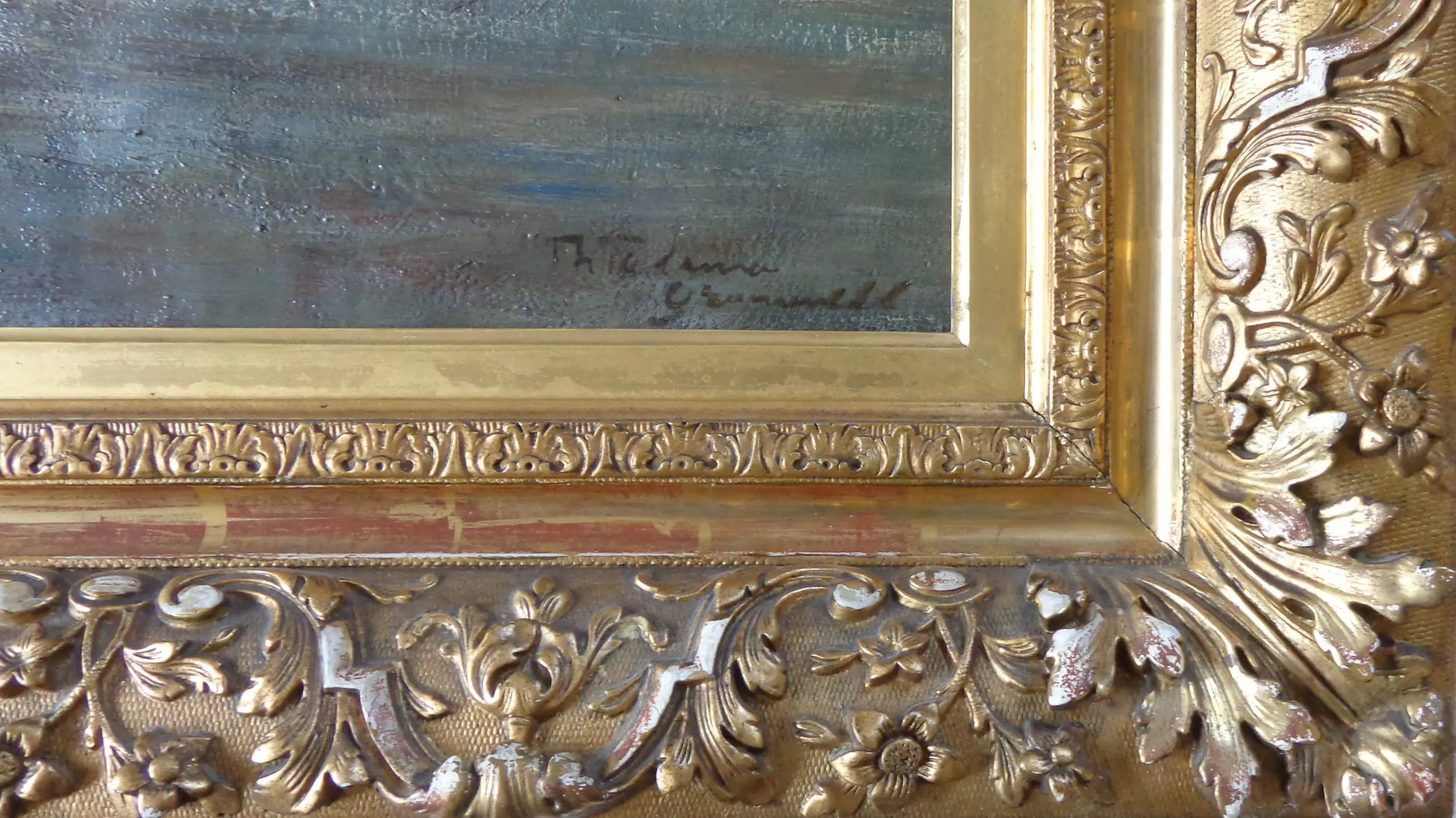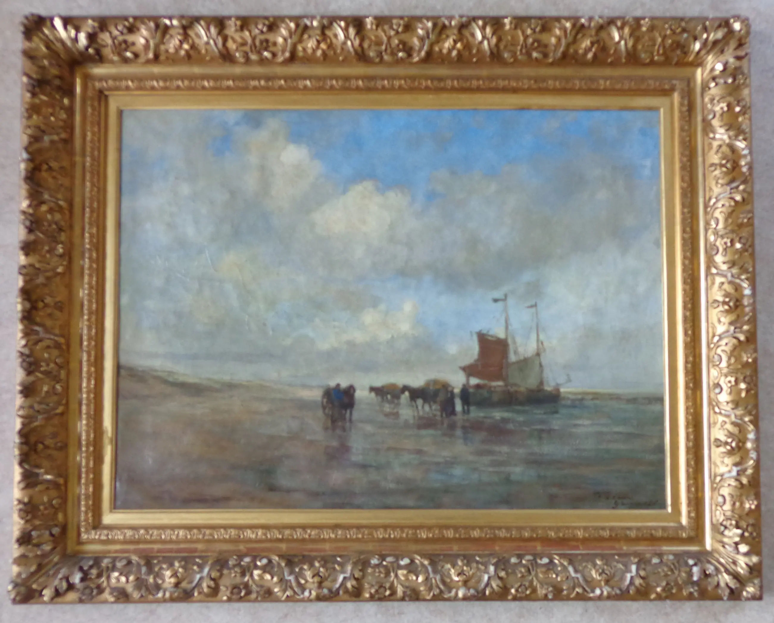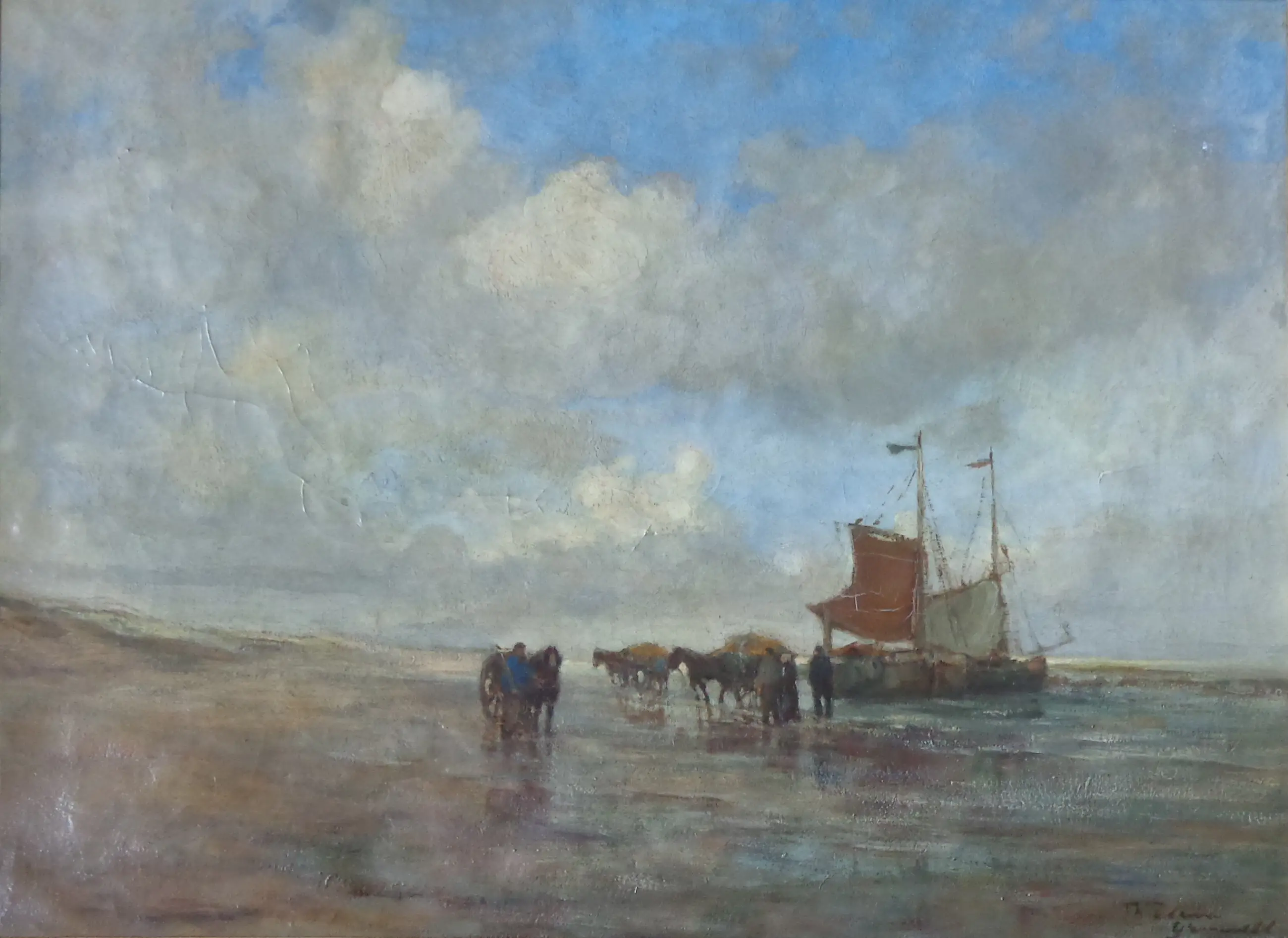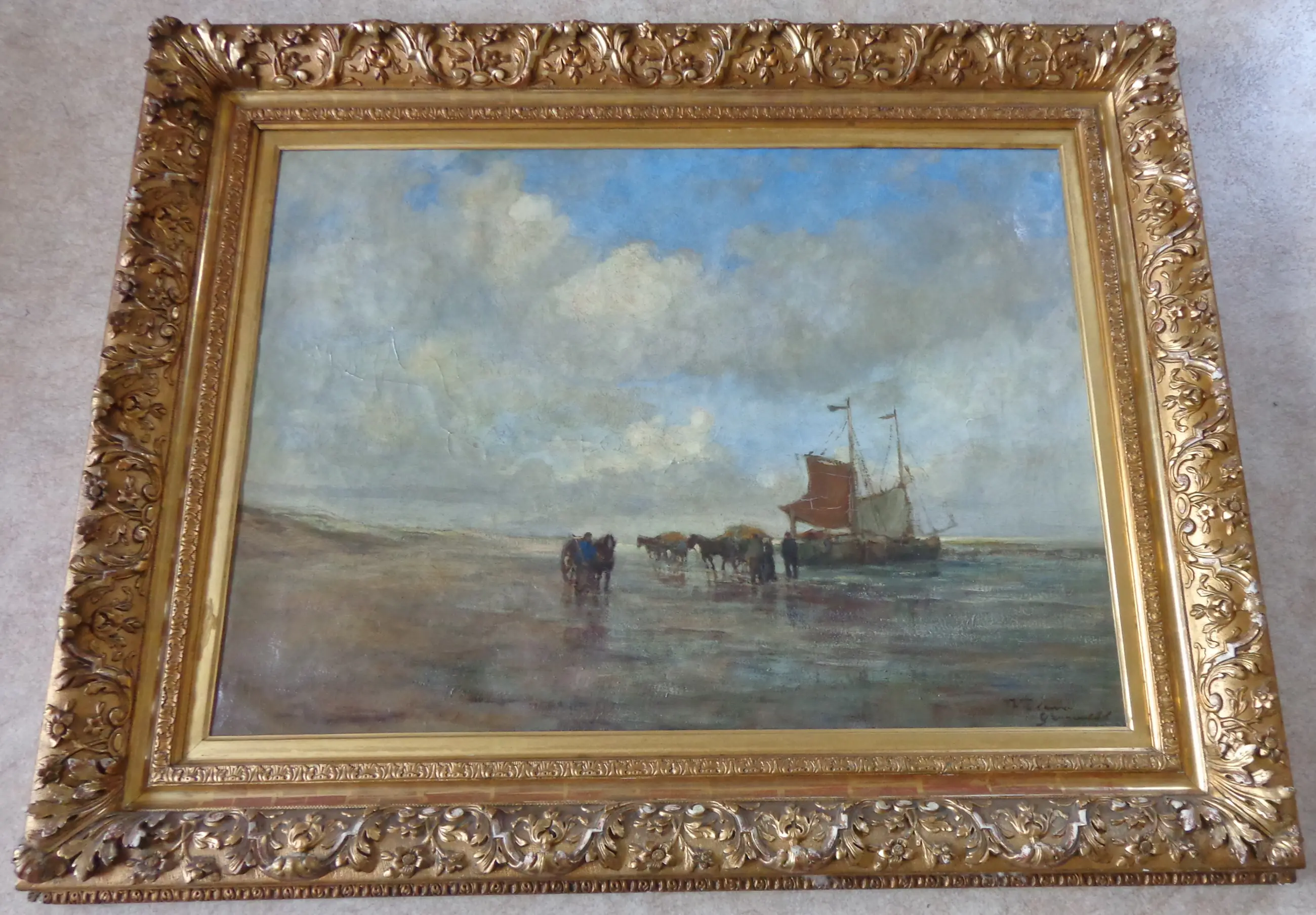 Thamina Tadama-Groeneveld (1871-1938). Vissers aan het strand. Olieverf op doek. Gesigneerd. Doek: 78x102cm. Gesculpteerde kader: 106x133x10cm. Craquelures in het doek. Golving onderaan het doek.