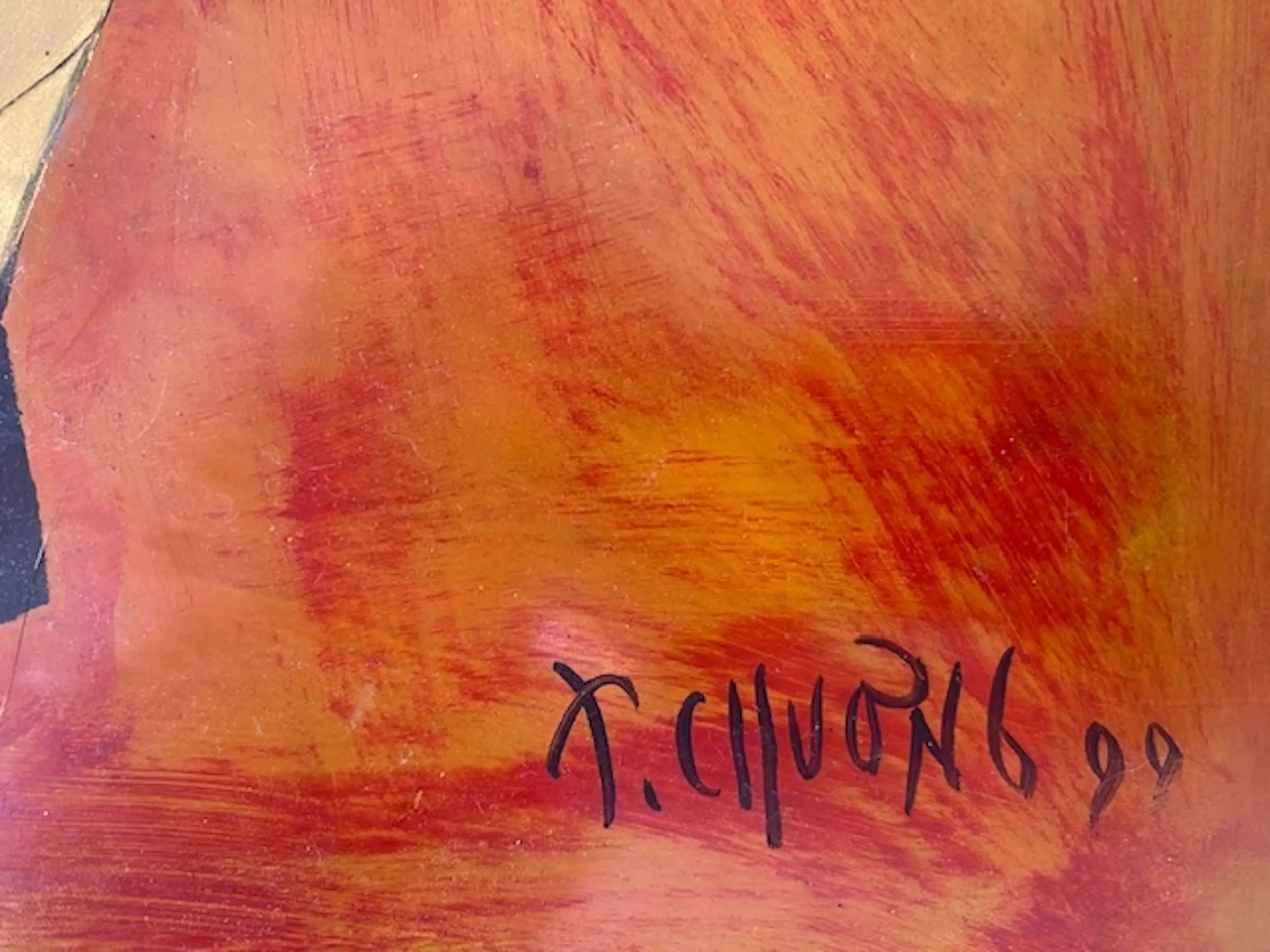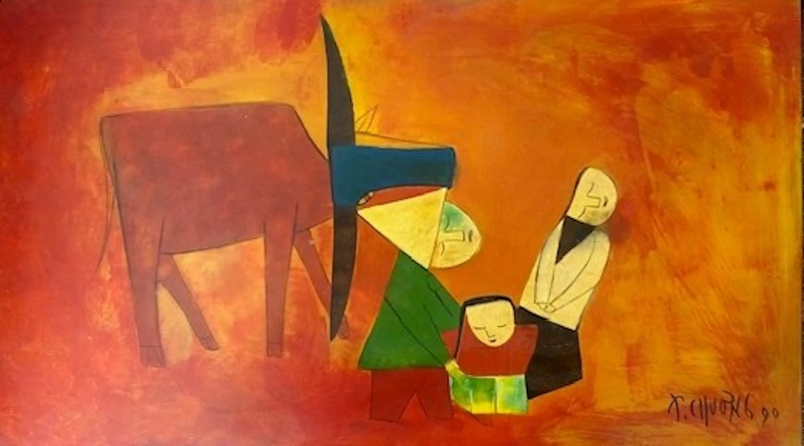 Dit opvallende schilderij van 65 x 32 cm van de beroemde Vietnamese kunstenaar Thanh Chương uit 1990 is een voorbeeld van zijn kenmerkende stijl, die modernistische abstractie combineert met traditionele Vietnamese thema's. De compositie toont vereenvoudigde, bijna geometrische menselijke en dierlijke vormen, weergegeven in warme, aardse tinten rood, oranje en oker. In het midden staat een groep gestileerde figuren – mogelijk een familie – verzameld onder een hoge, hoekige constructie, die mogelijk een woning of cultureel motief symboliseert. Links staat het silhouet van een os of buffel, een blijvend symbool van het plattelandsleven in Vietnam.