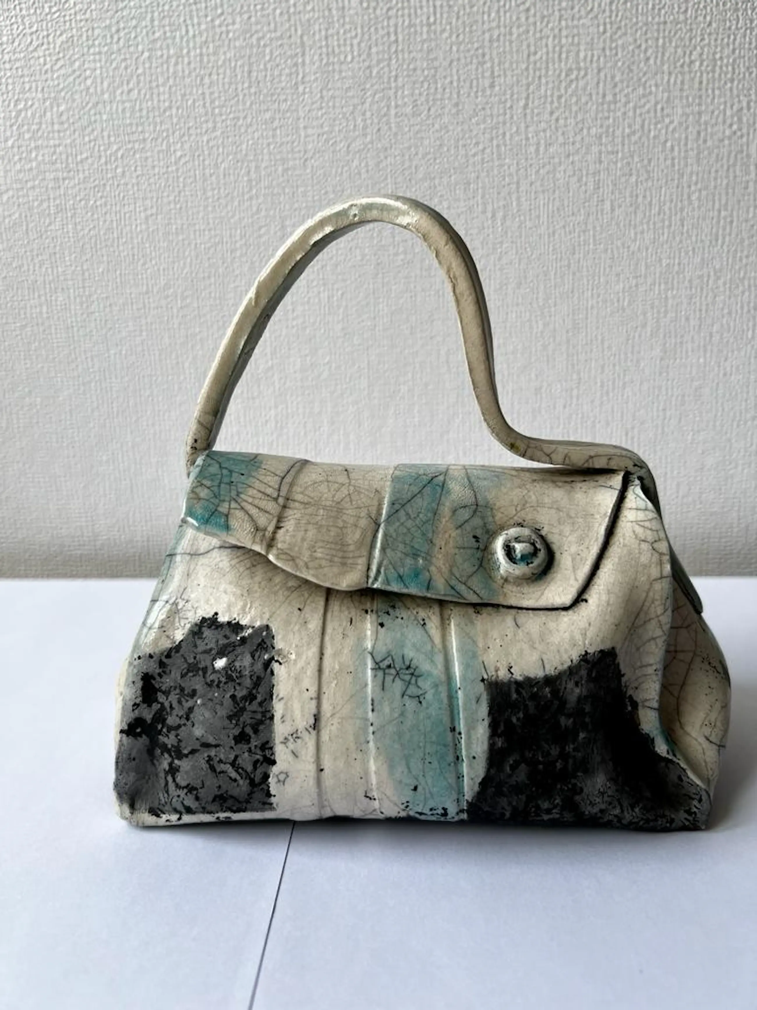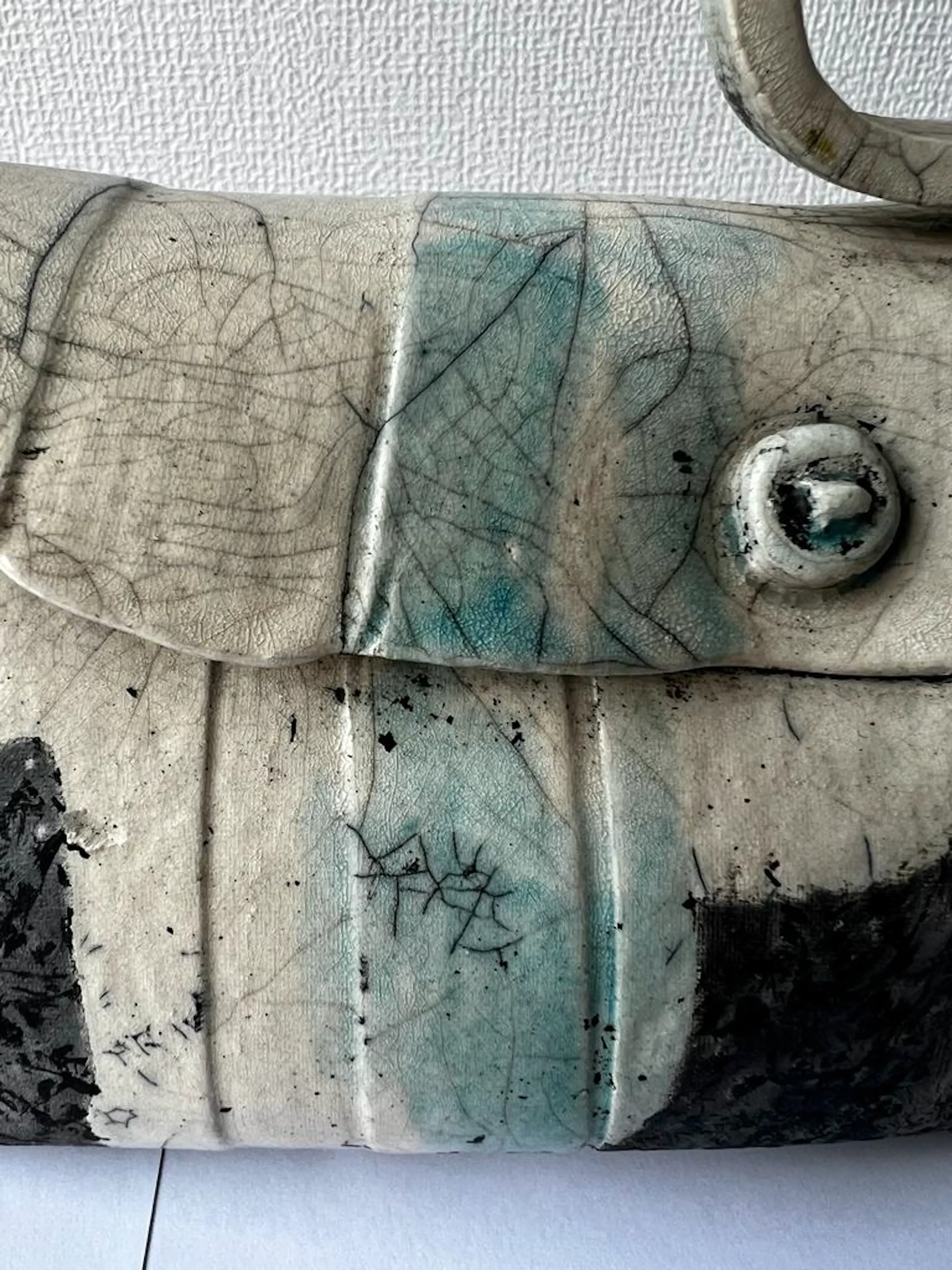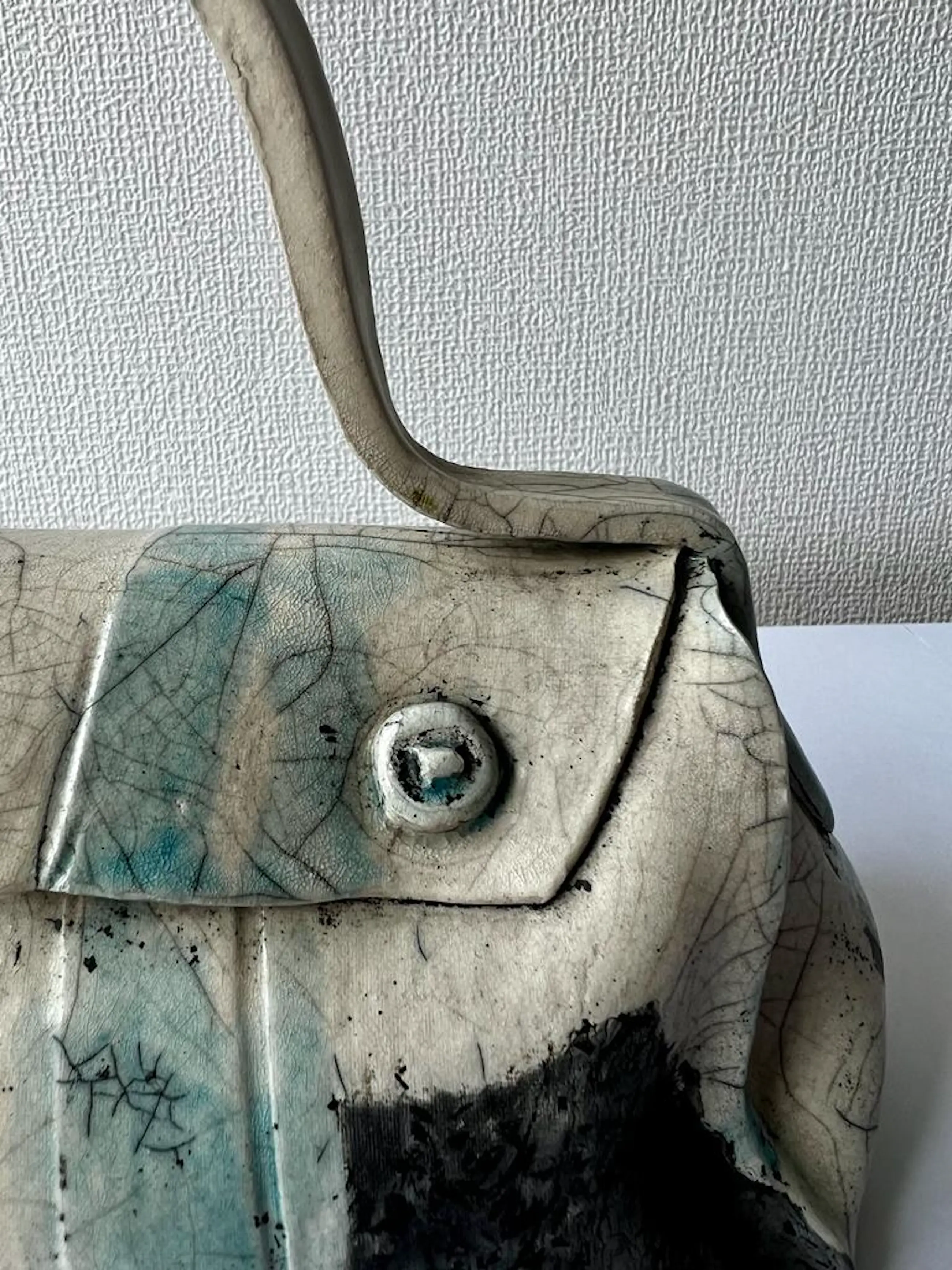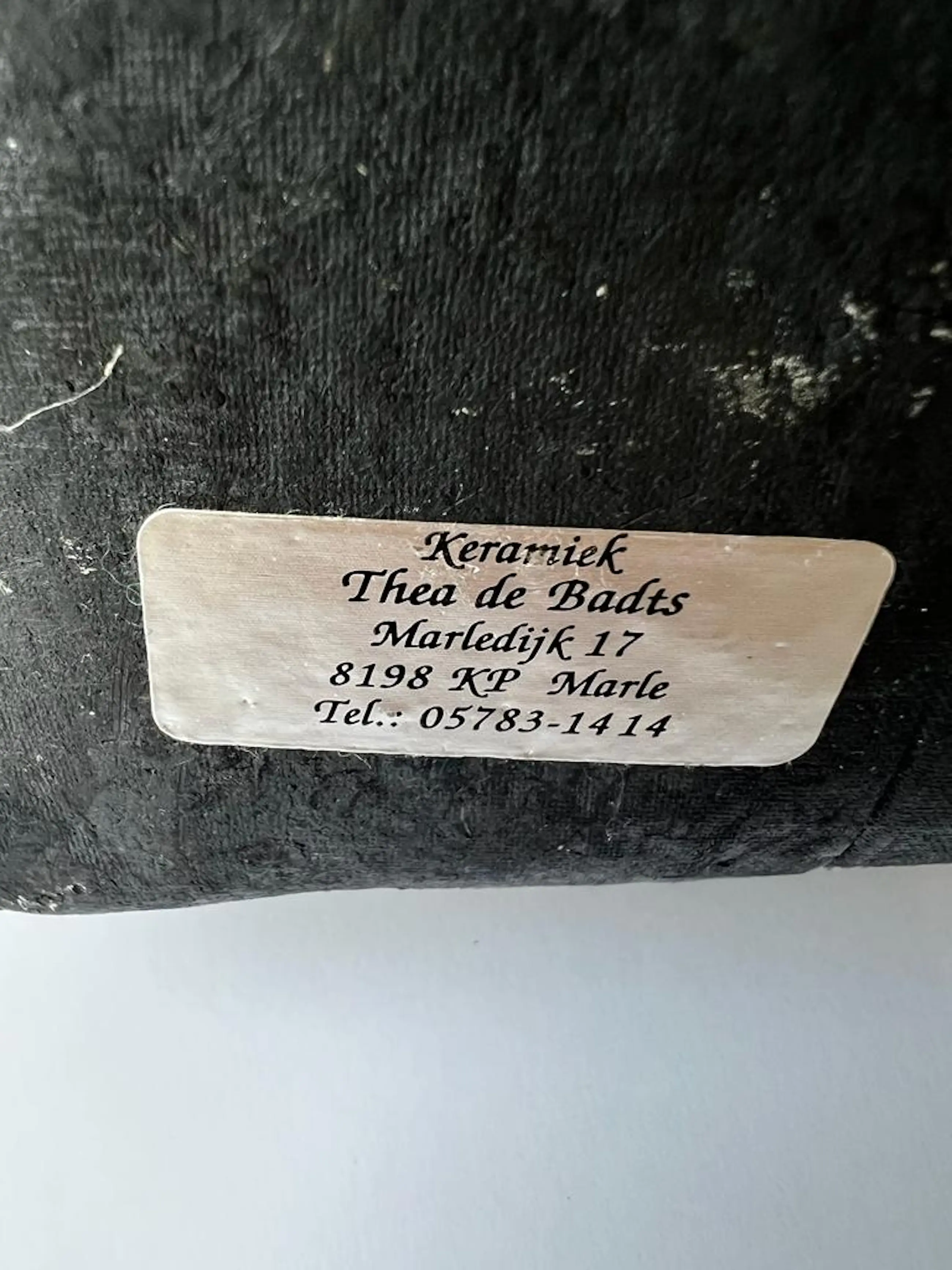 Schitterend handtasje keramiek vervaardigd/ gemaakt door keramist Thea de Badts (1944). Het object verkeerd in perfecte staat. Is onder het tasje gesigneerd door deze beeldhouwster. Afmetingen zijn: 16 cm. Breed - 9 cm. Hoog (Zonder handvat) met handvat 16 cm.