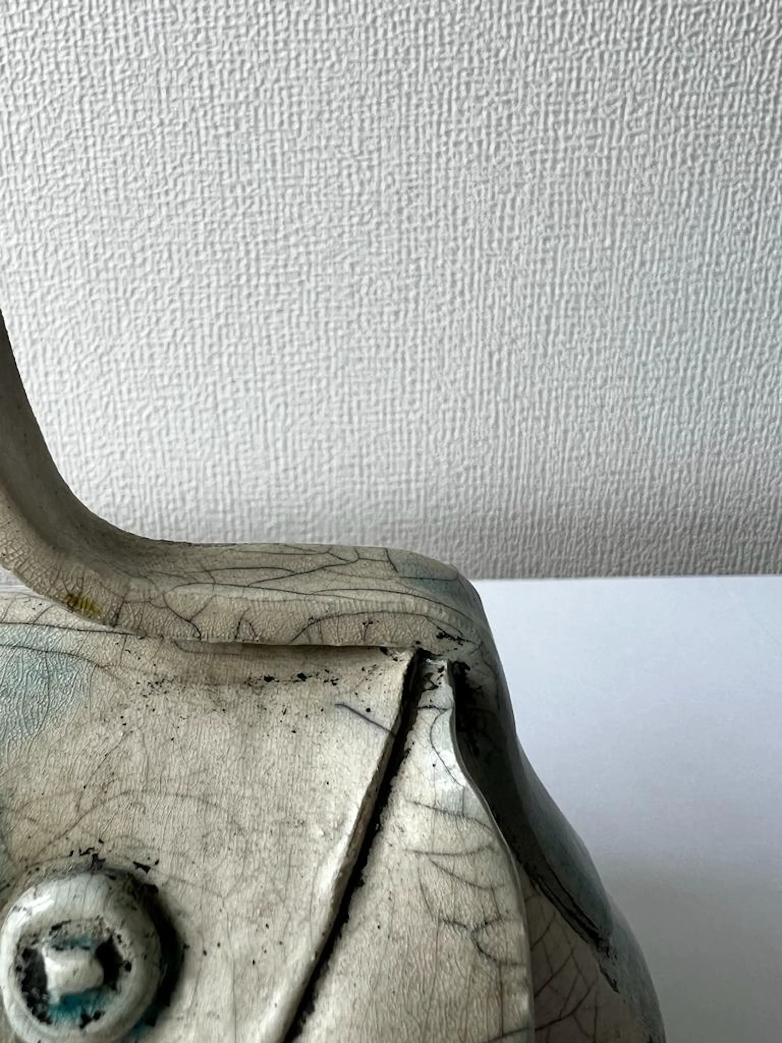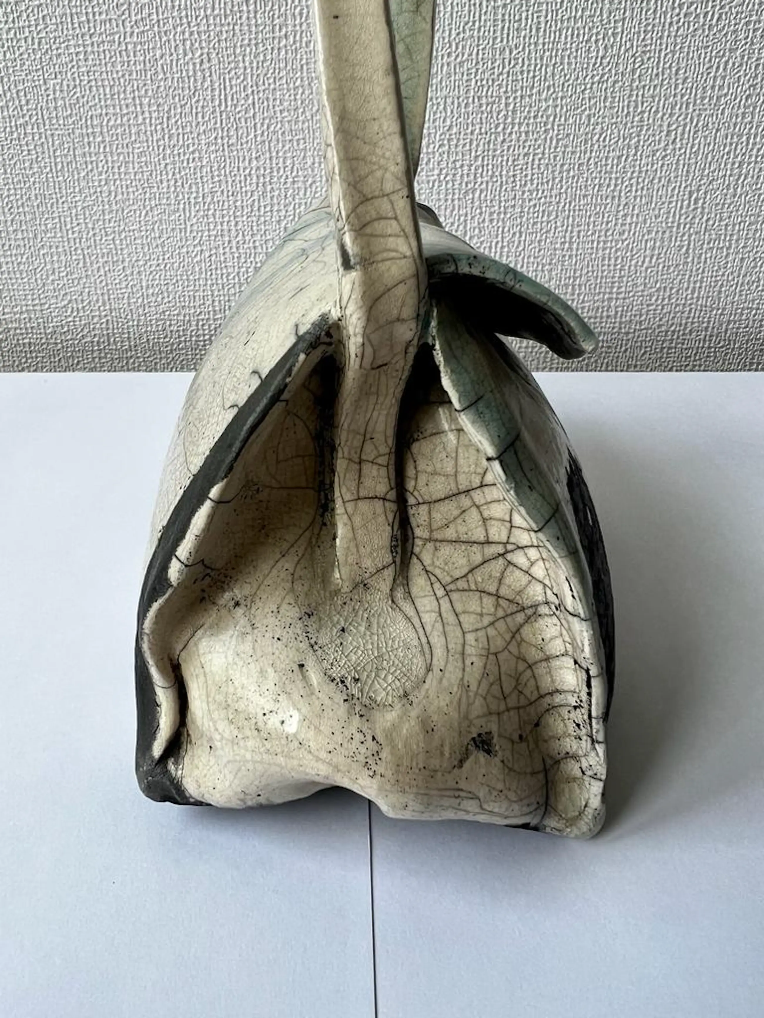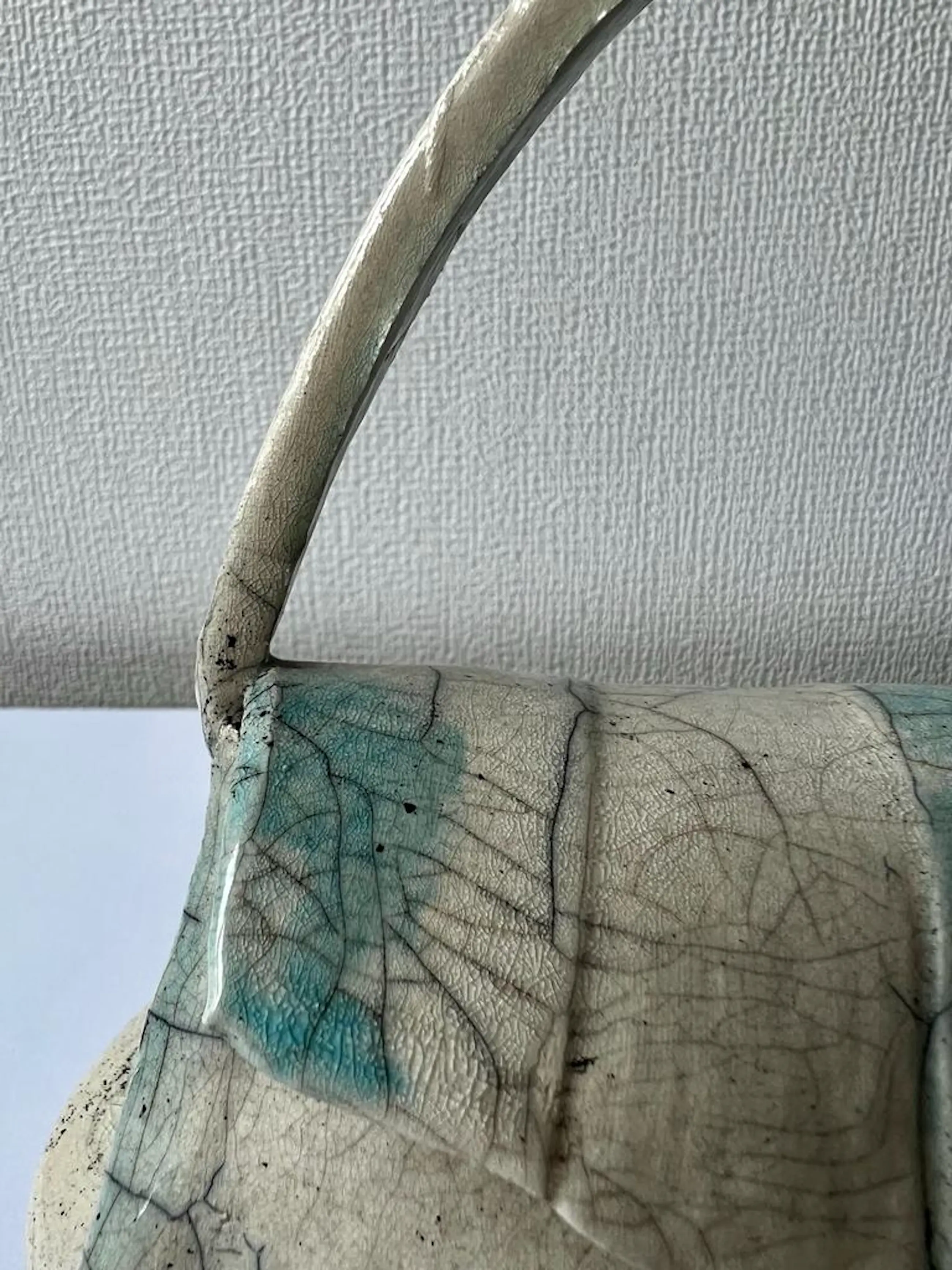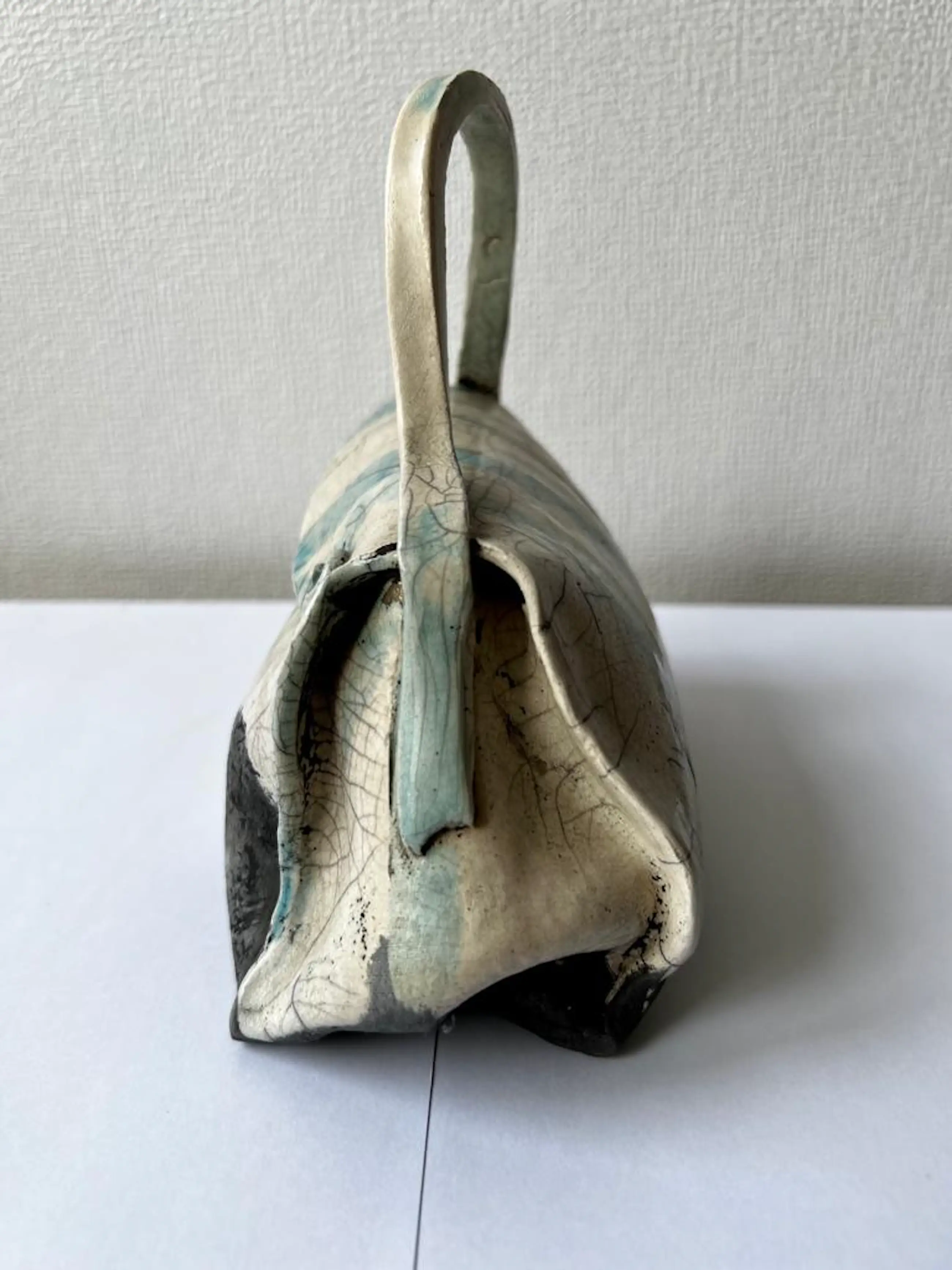 Schitterend handtasje keramiek vervaardigd/ gemaakt door keramist Thea de Badts (1944). Het object verkeerd in perfecte staat. Is onder het tasje gesigneerd door deze beeldhouwster. Afmetingen zijn: 16 cm. Breed - 9 cm. Hoog (Zonder handvat) met handvat 16 cm.