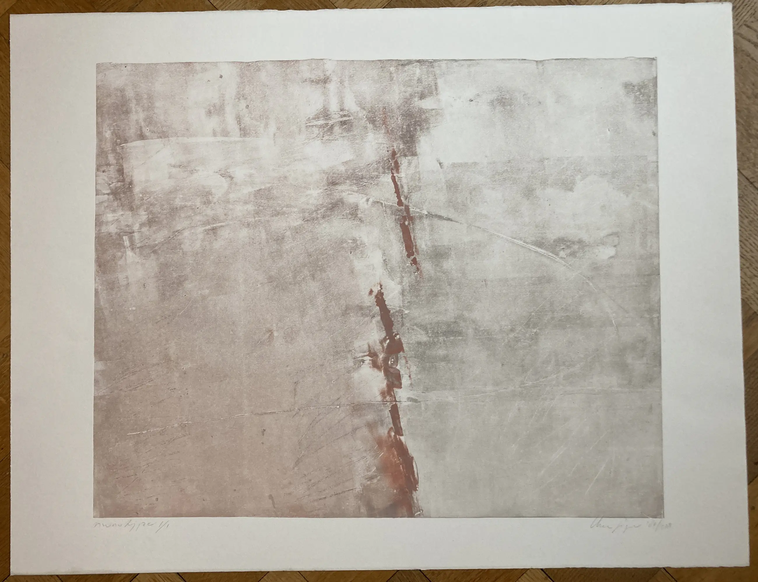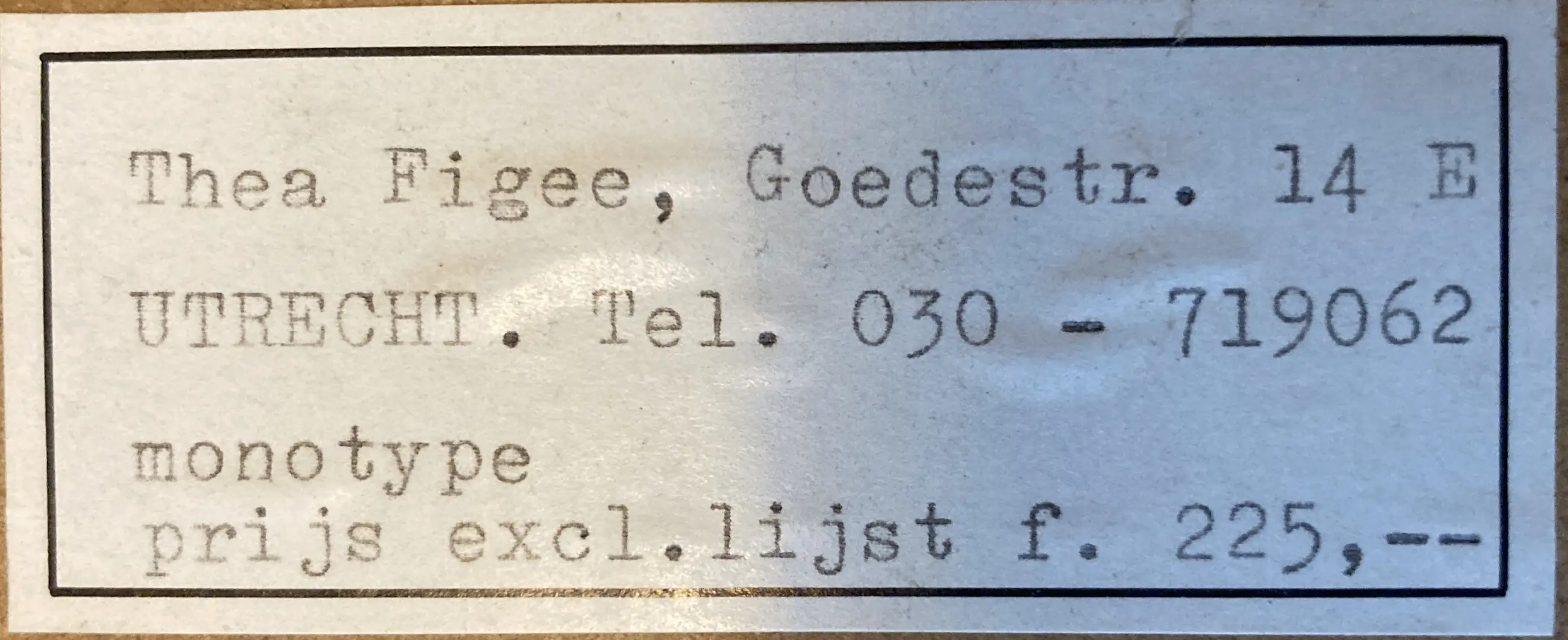 Mooie monotype van de hand van Thea Figee. Blad: 50 x 65 cm; beeld: 41 x 50 cm. Door de kunstenares gesigneerd en gedateerd met potlood. Het werk verkeert in zeer goede staat.