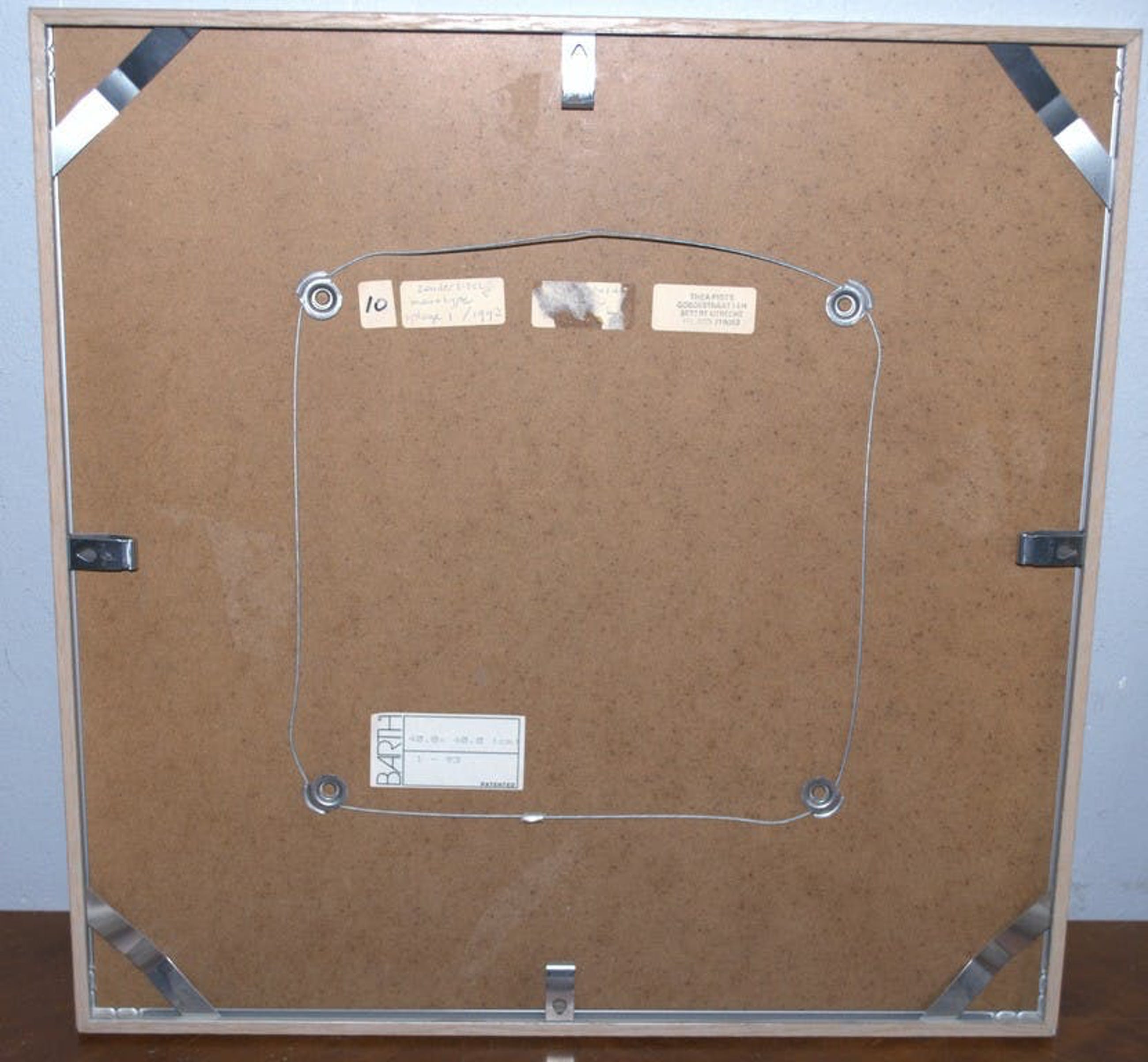 Achter glas en passepartout, in een fraaie houten lijst, 41.5 x 41.5 cm.