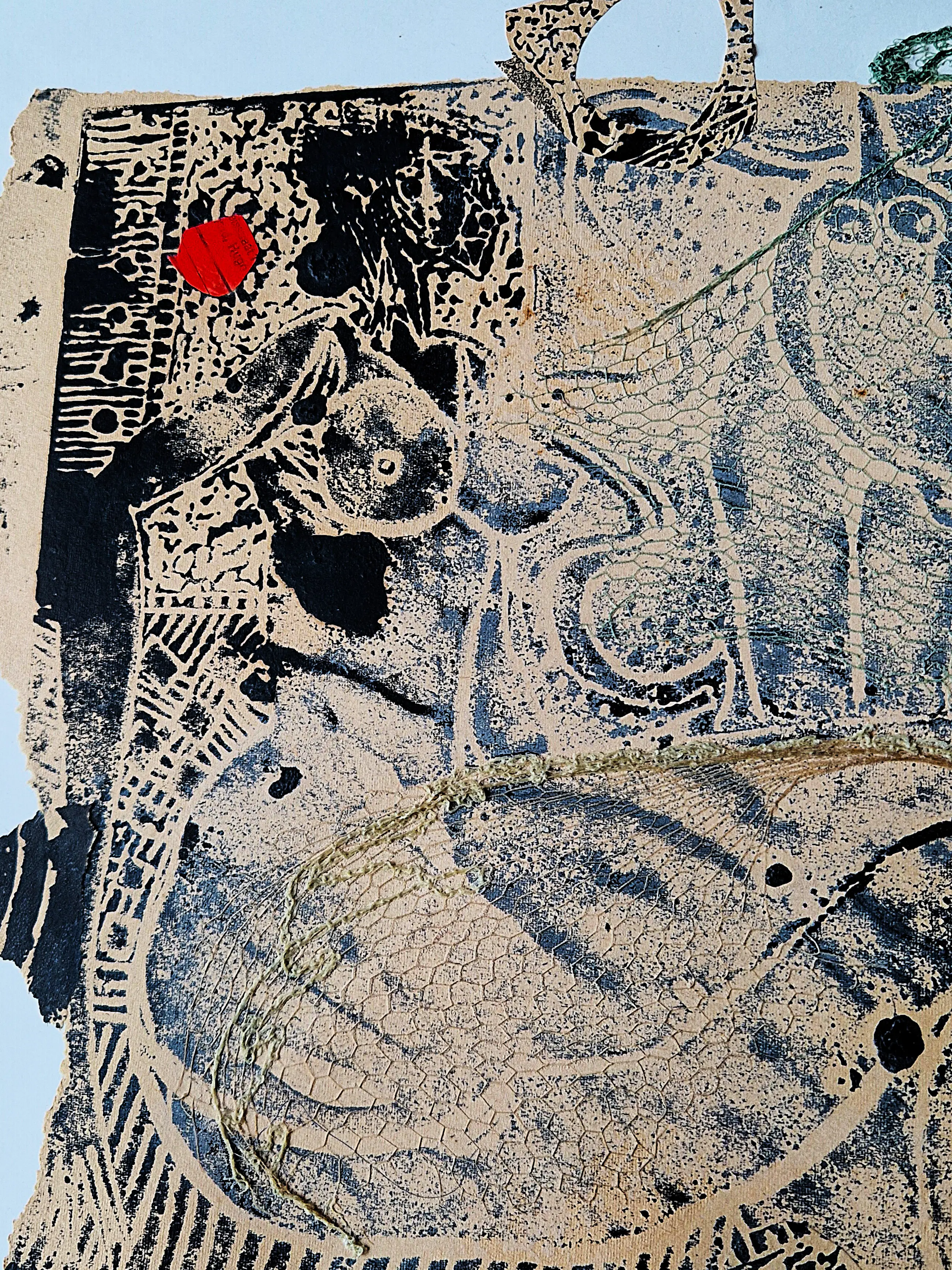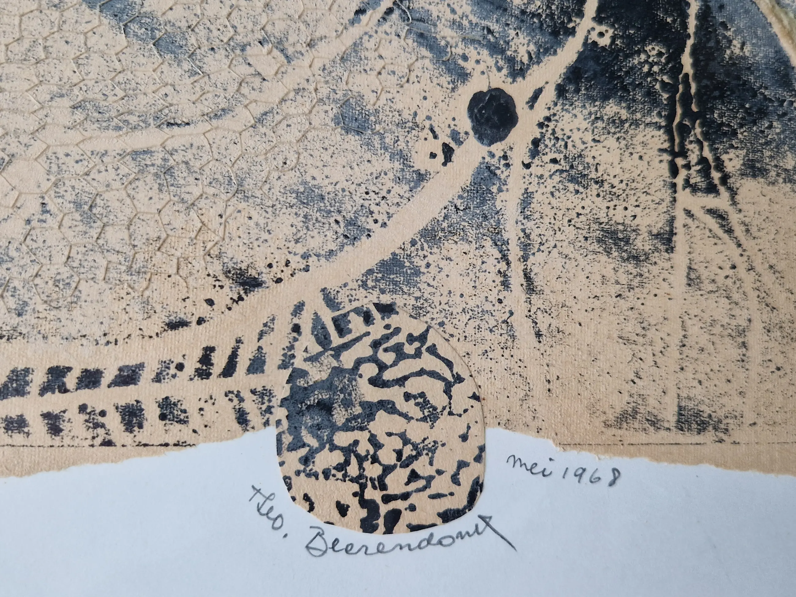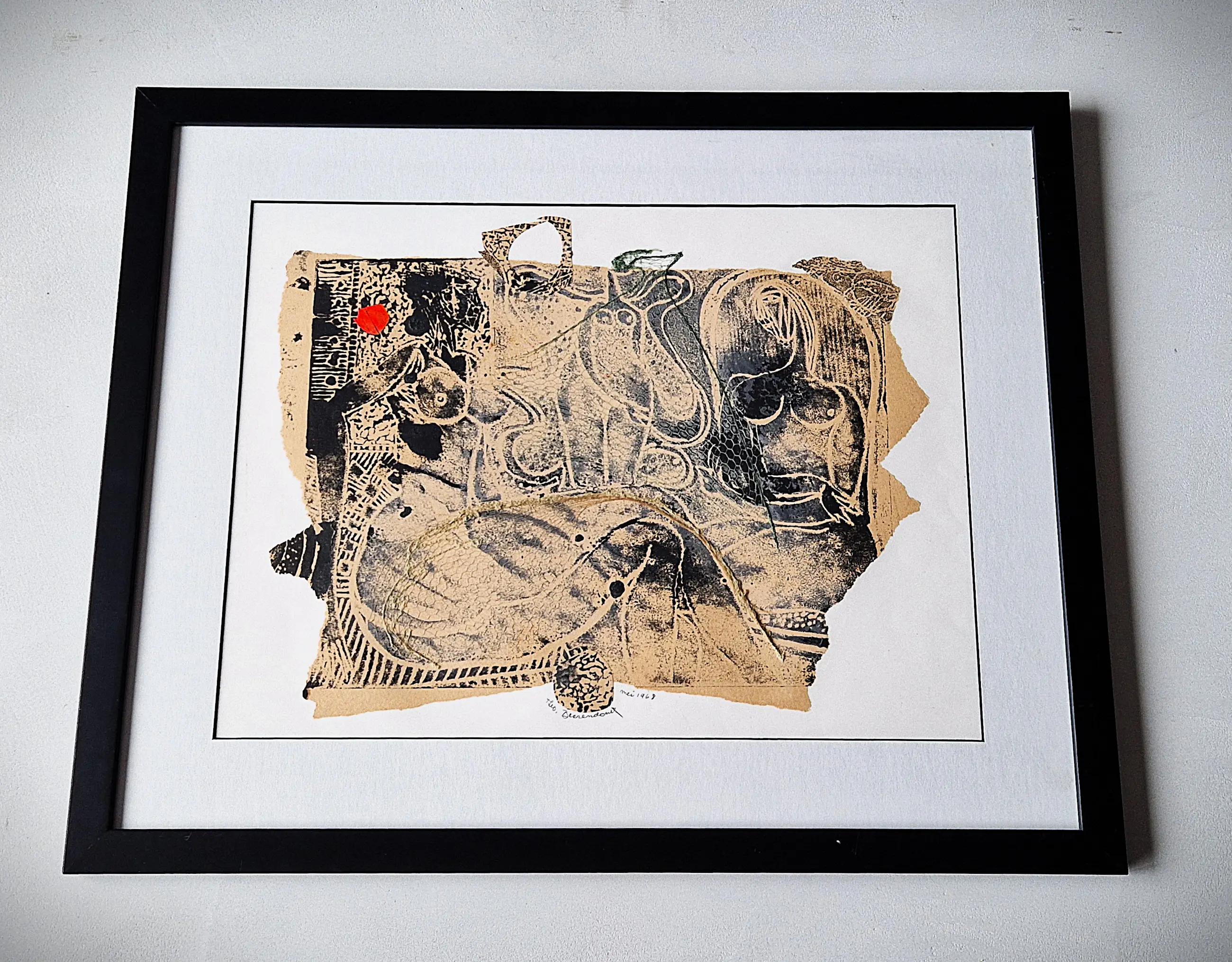 - Bijzondere jaren 60 (1968) gemengde techniek (papiercollage, rode verf, gouache, visnet) "vrouwelijk naakt met rood" van de veelzijdige beeldend kunstenaar Theo Beerendonk. Betreft een uniek exemplaar, dus niet in oplage vervaardigd. Verkeert in zeer goede conditie - professioneel ingelijst