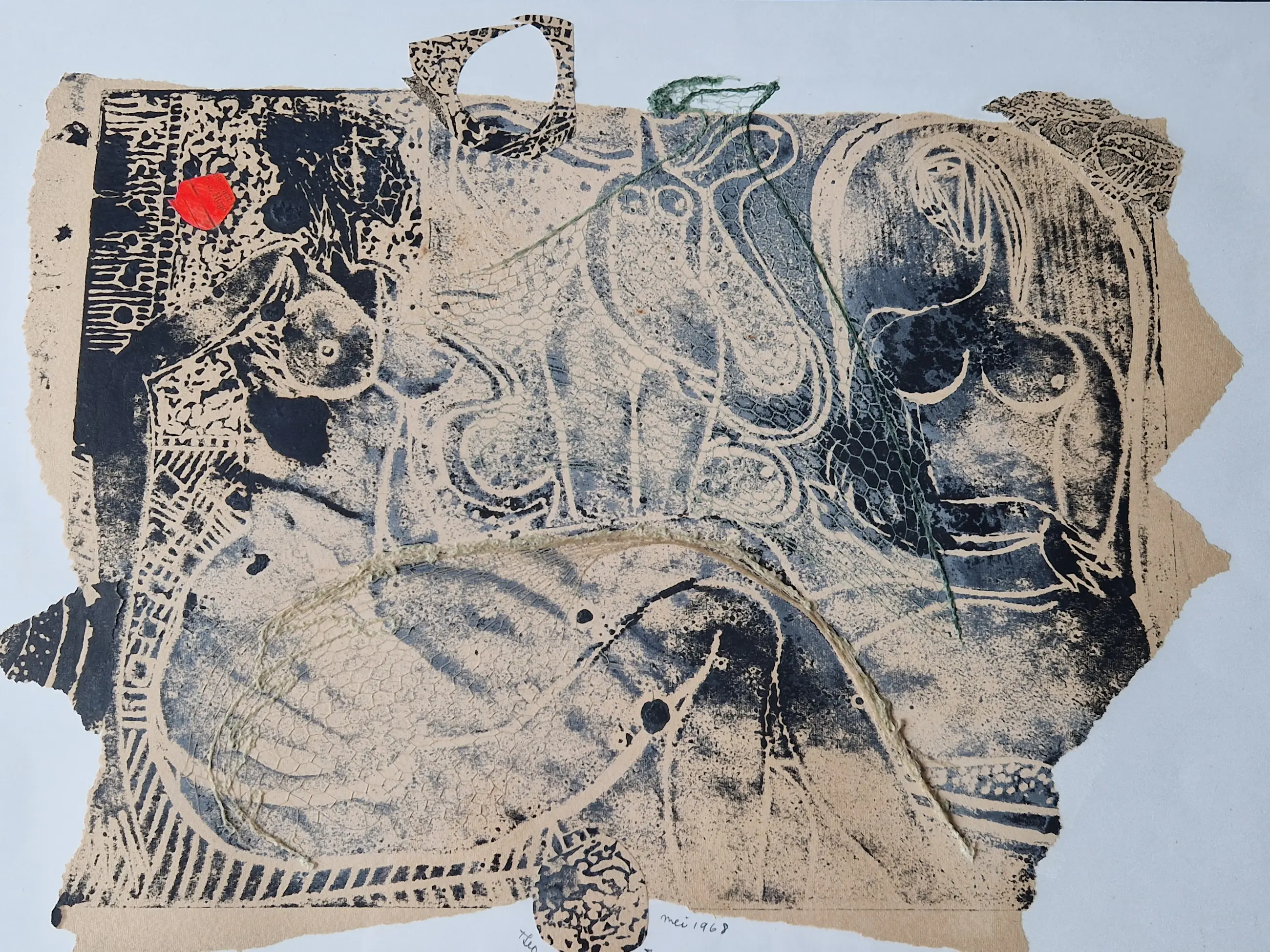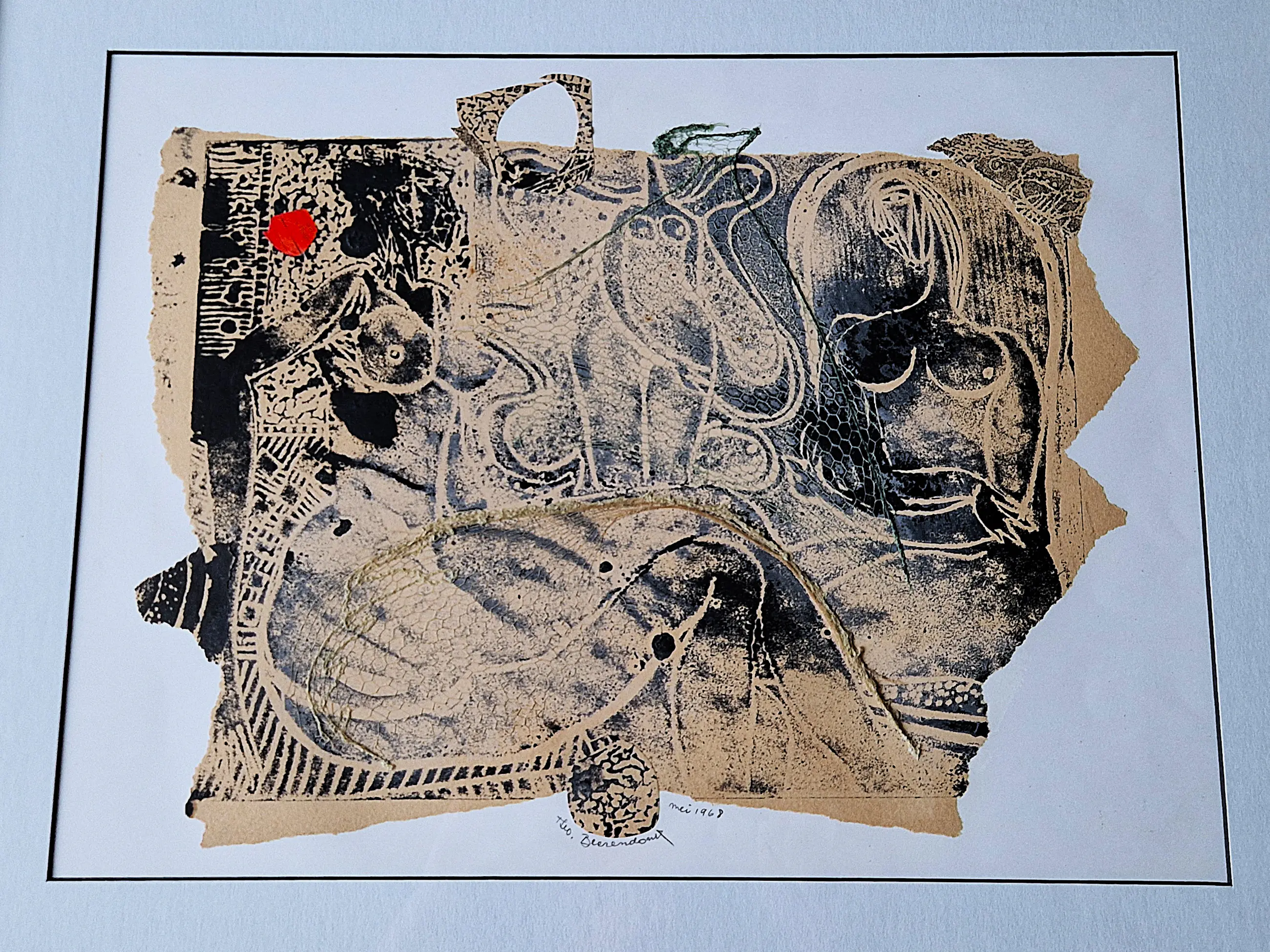 Beerendonk, Theo (1905-1979) "Naakten met rood" Gemengde technieken, collage van stukjes papier (met linoleumsnede van vrouwelijke naakten in zwart), gouache en een klein (groen) net, 30x40 cm, gesigneerd "Theo Beerendonk" en "mei 1968" in potlood, professioneel ingelijst.