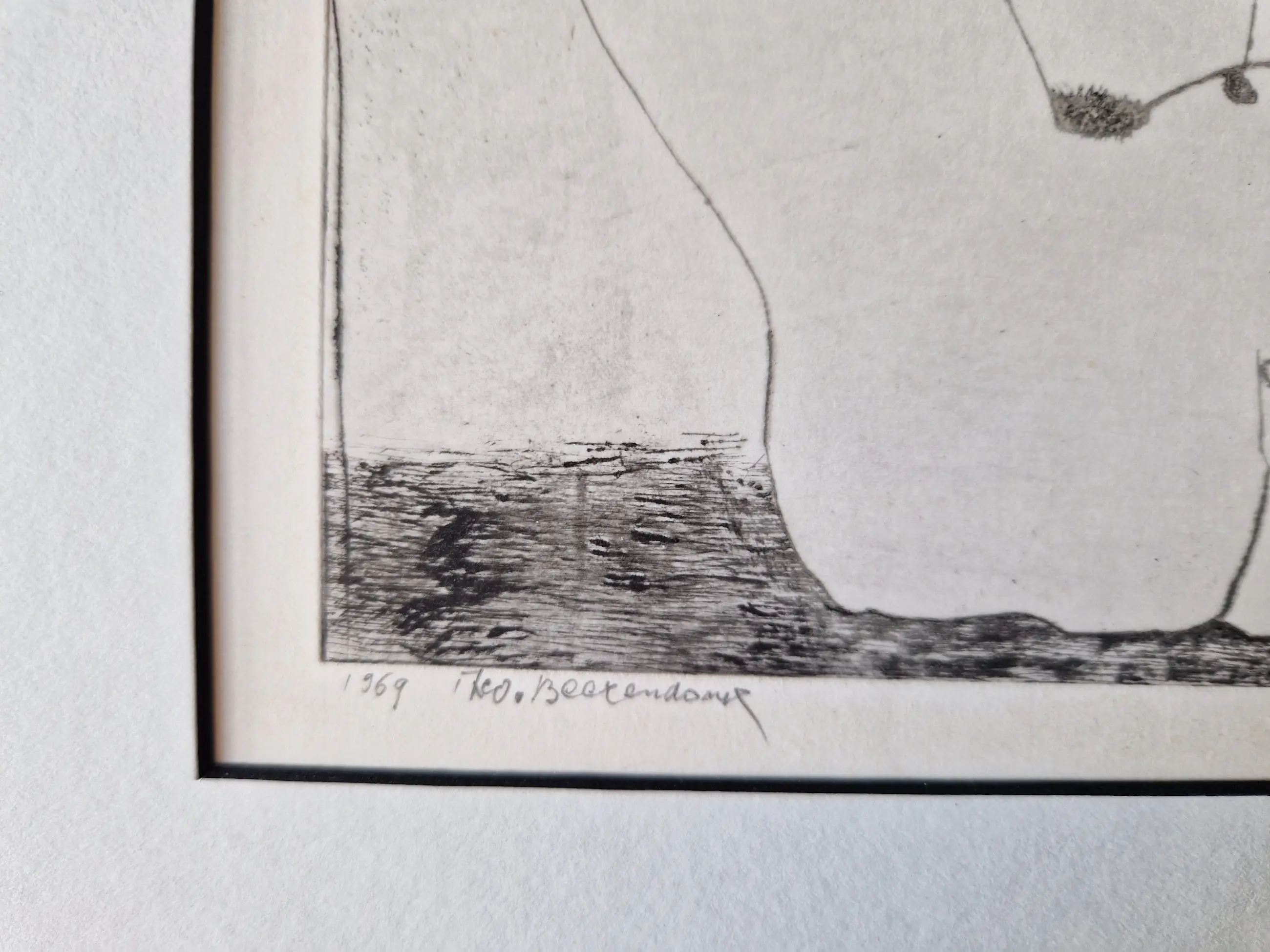 - Karakteristieke jaren 60 potlood op papier tekening van de Amsterdamse multi-disciplinaire kunstenaar theo Beerendonk (1905-1979). De tekening verkeert in zeer goede conditie en is linksonder gesigneerd en gedateerd. In exclusief verdiept passe partout - niet ingelijst.