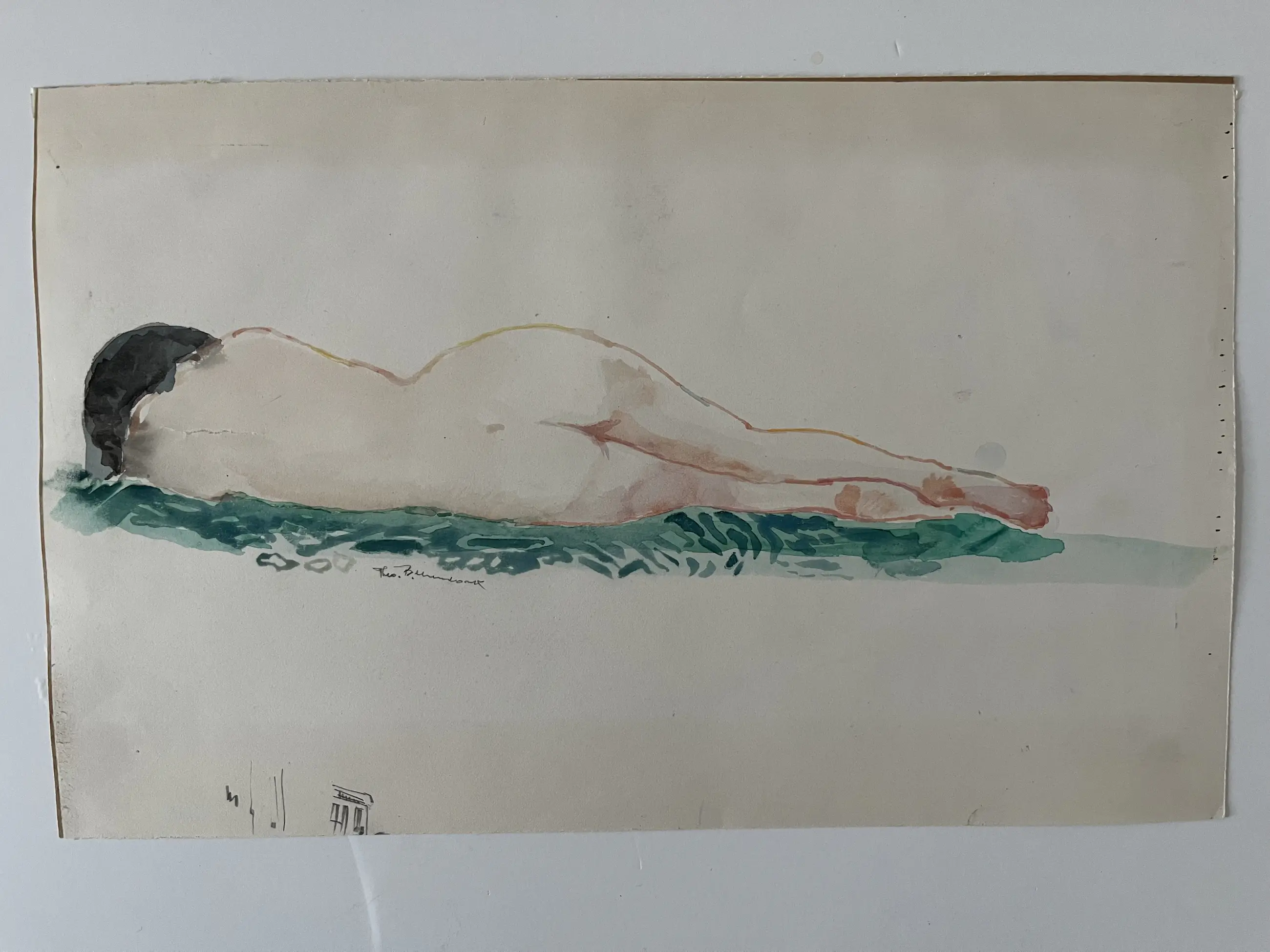 Aquarel liggend naakt van Theo Beerendonk beschadiging onder linjer schouderblad, echter professioneel gerestaureerd en nagenoeg niet zichtbaar.