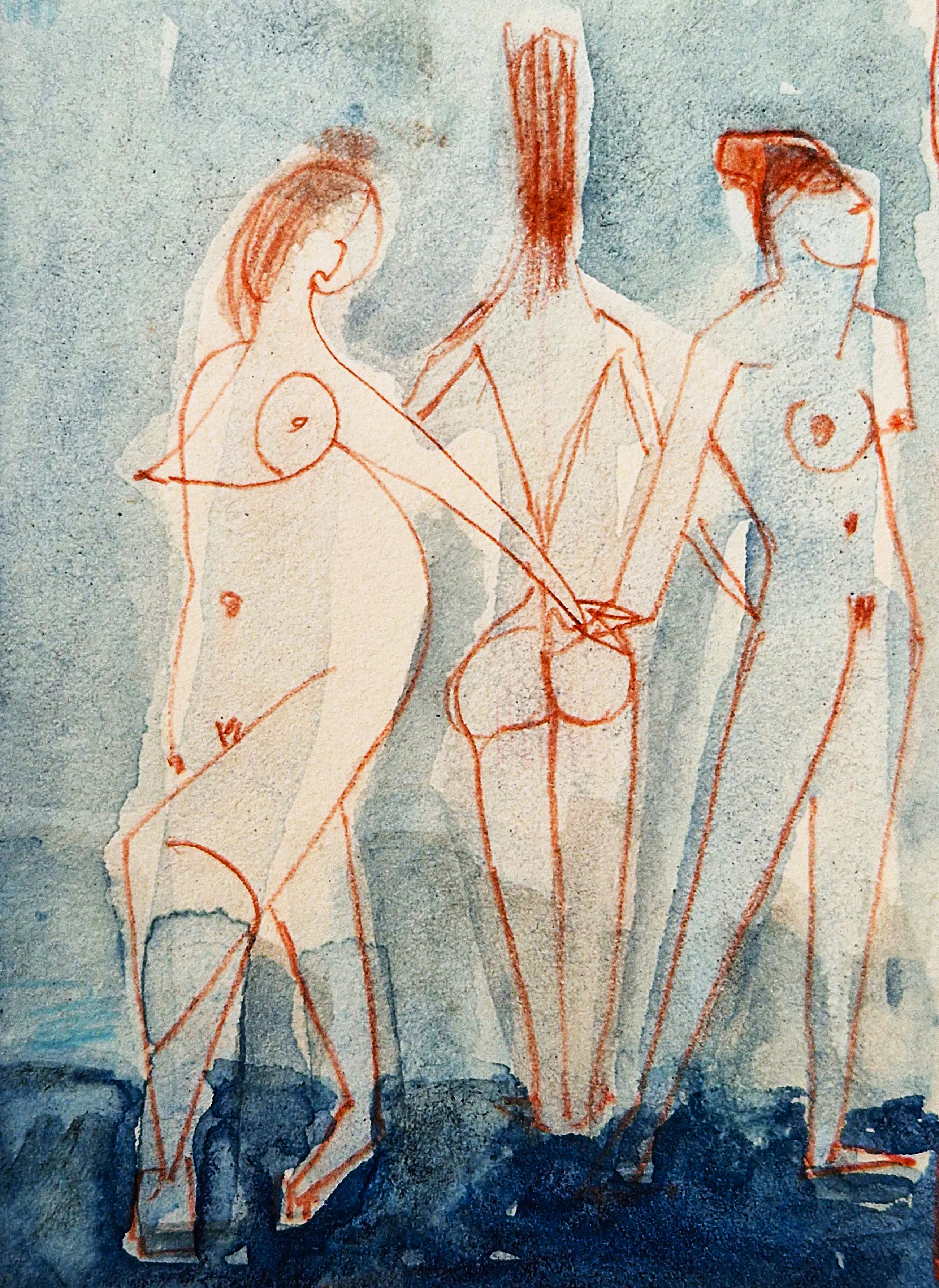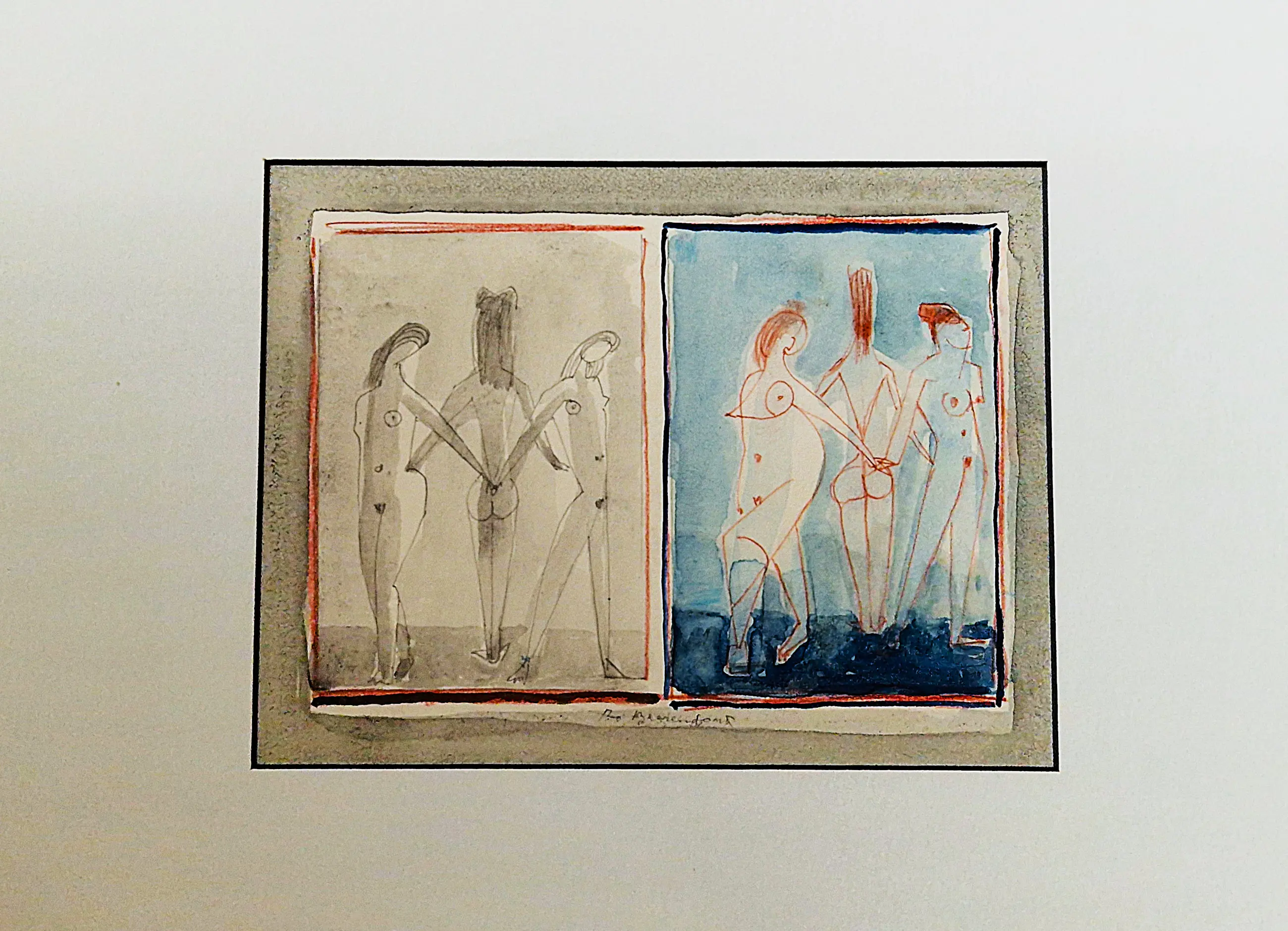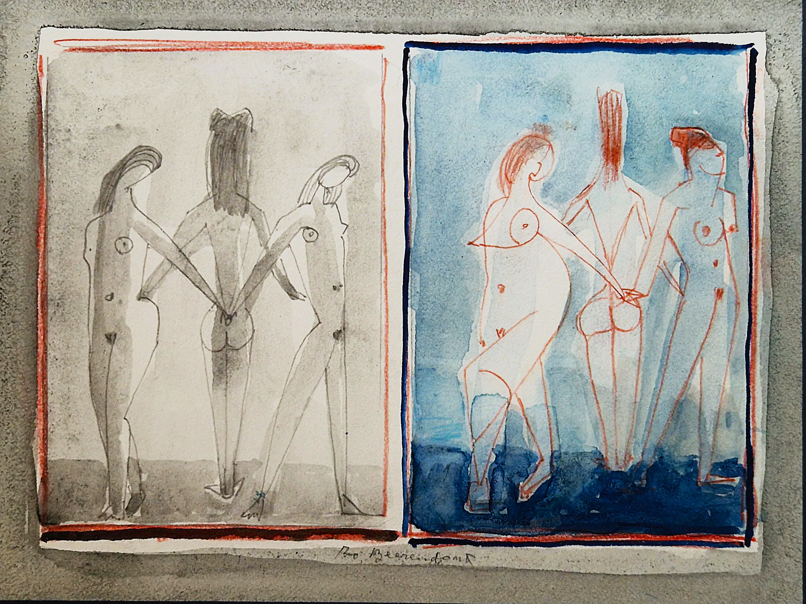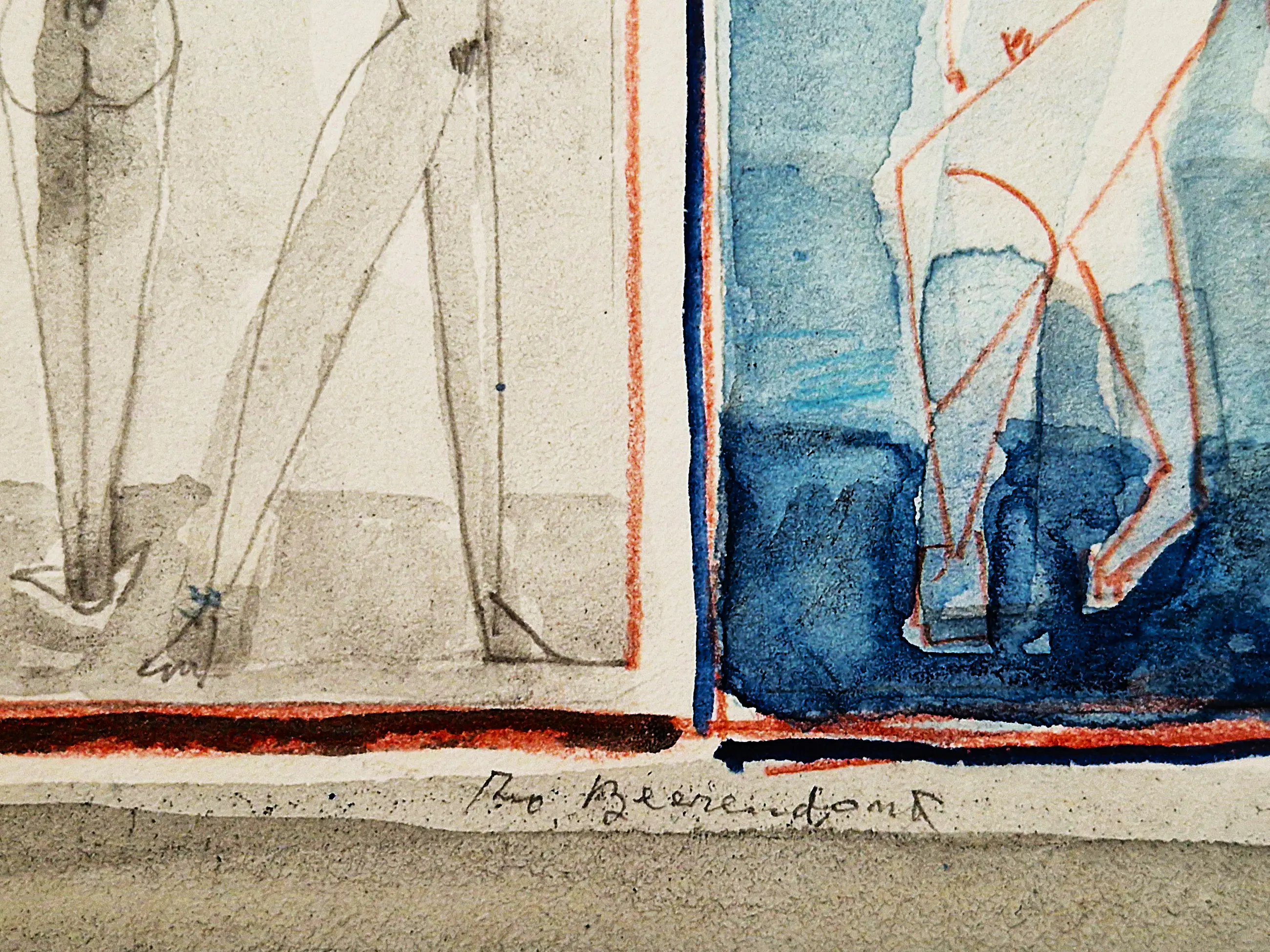 - Een erg mooie jaren 60 gemengde techniek (rode inkt, aquarel, sepia) op papier tekening van de Amsterdamse multi-disciplinaire kunstenaar theo Beerendonk (1905-1979). De tekening verkeert in zeer goede conditie en is midden-onder gesigneerd. In fraaie, verdiepte passe partout.
