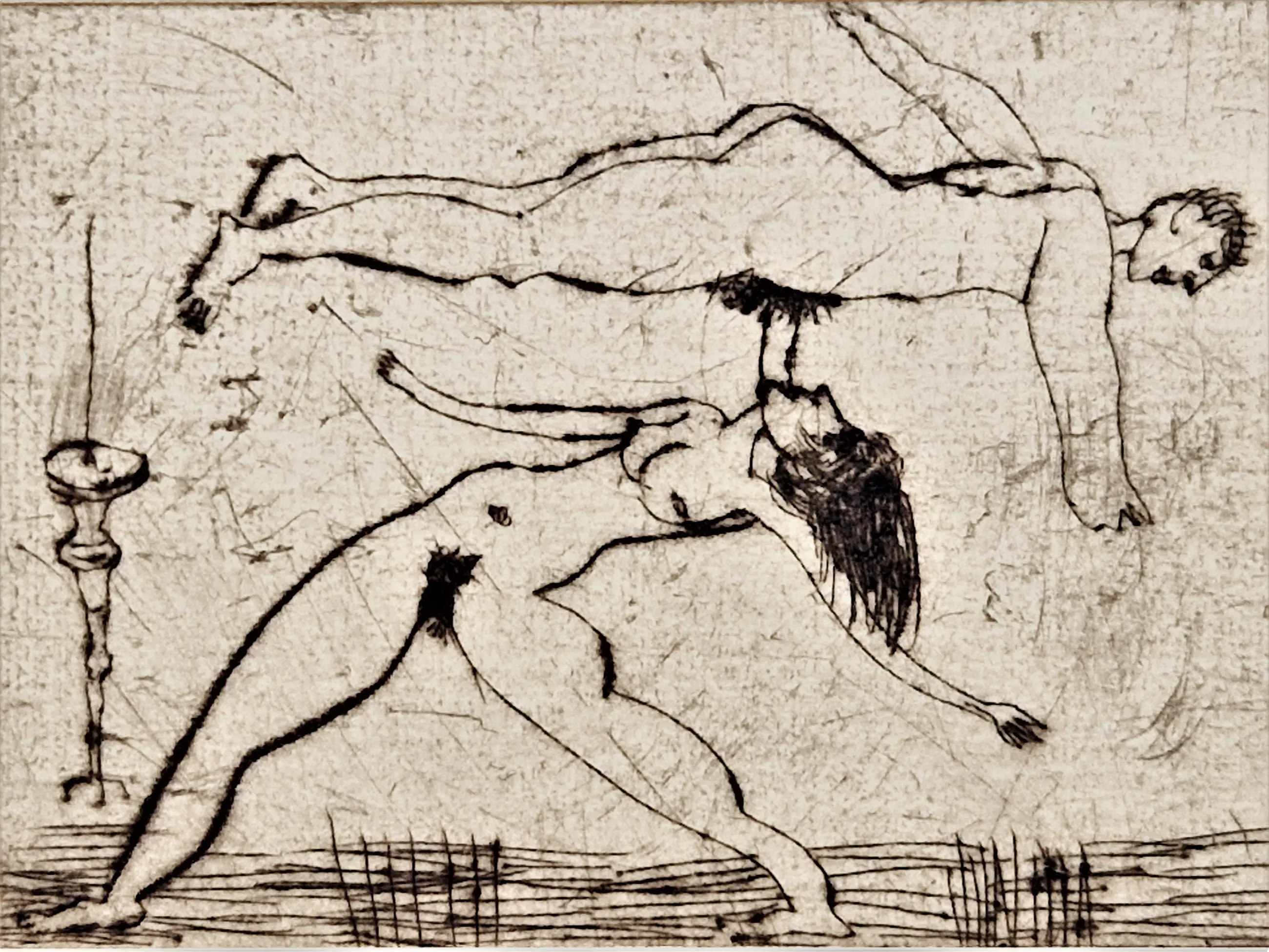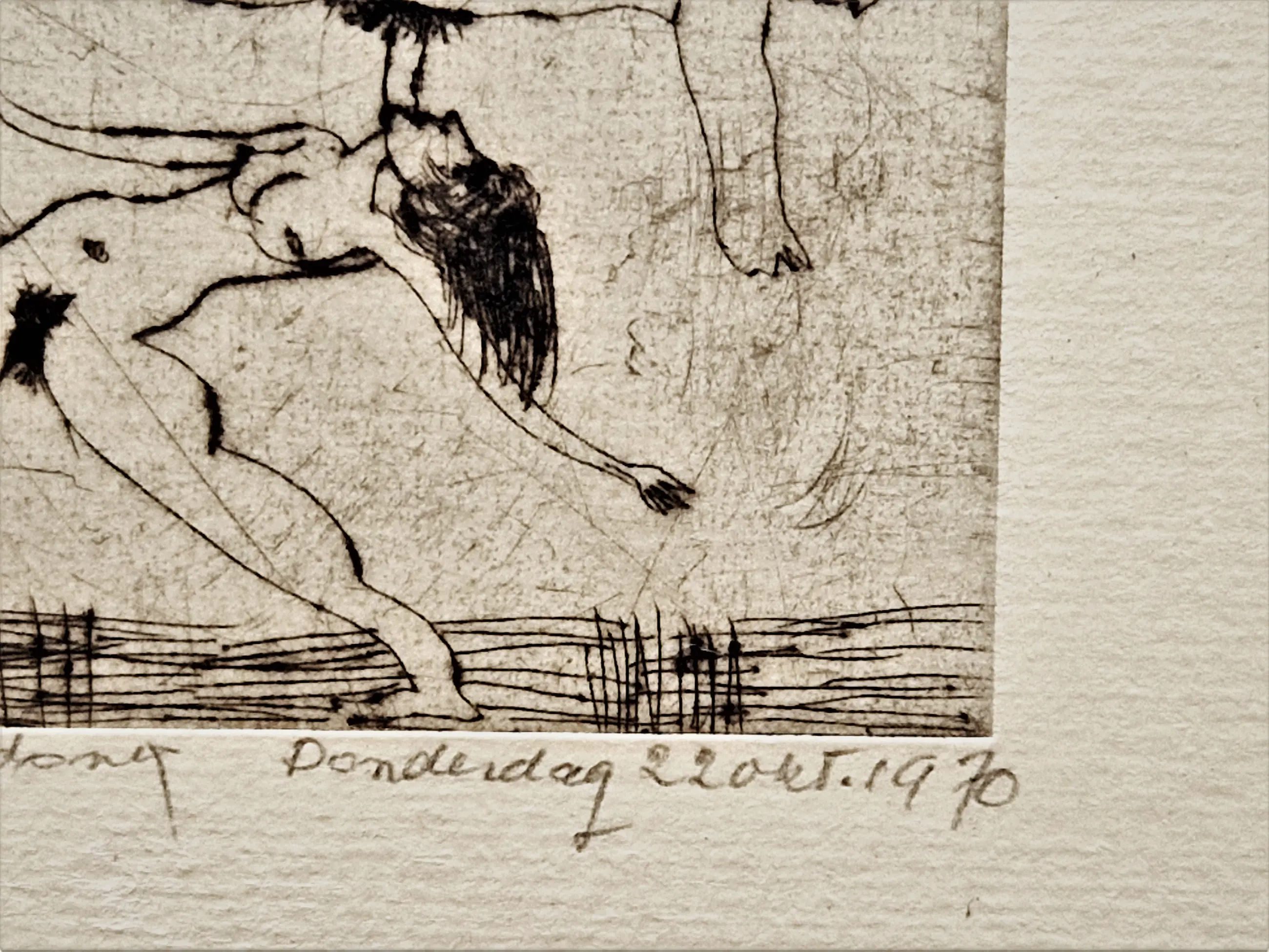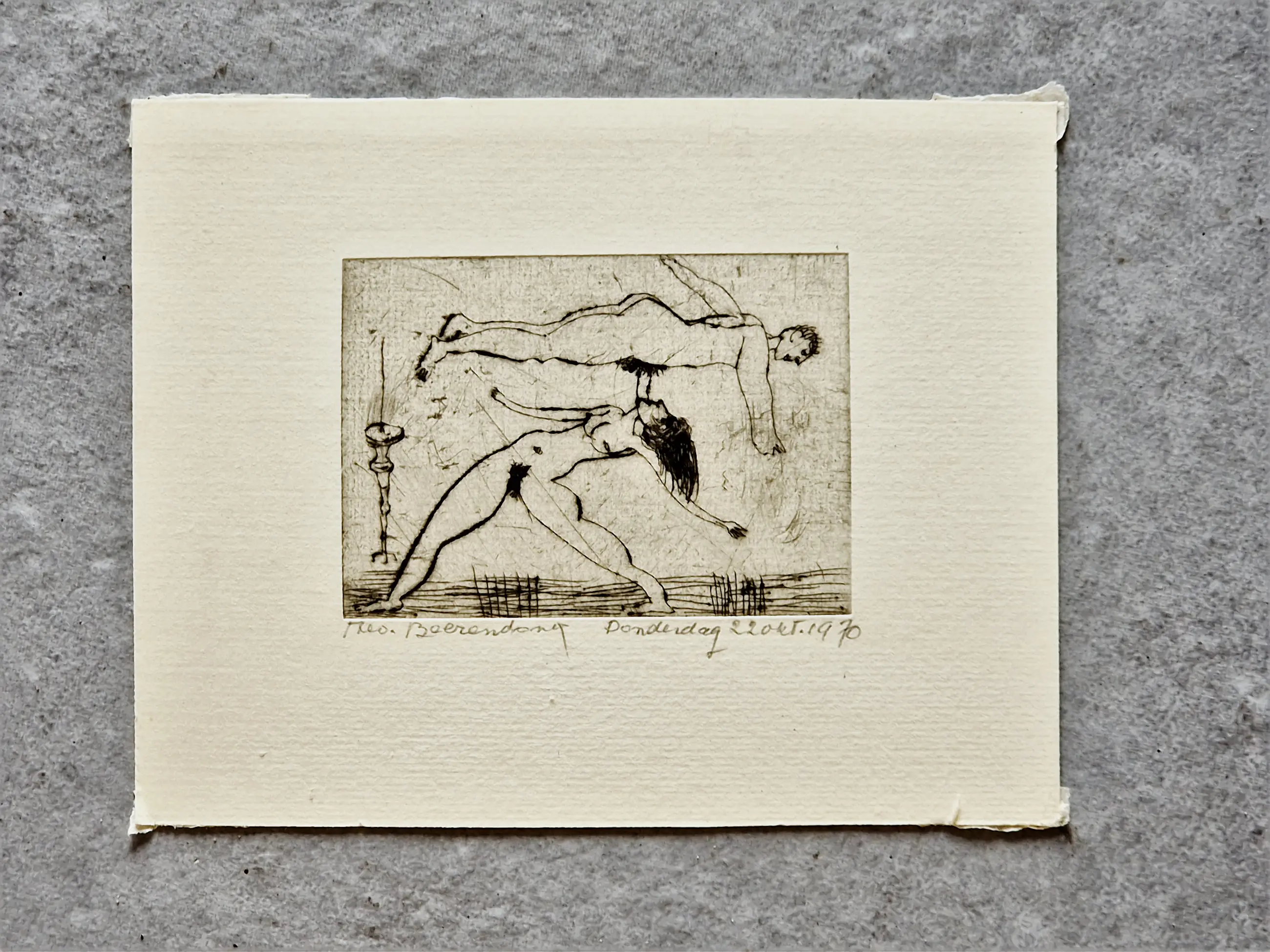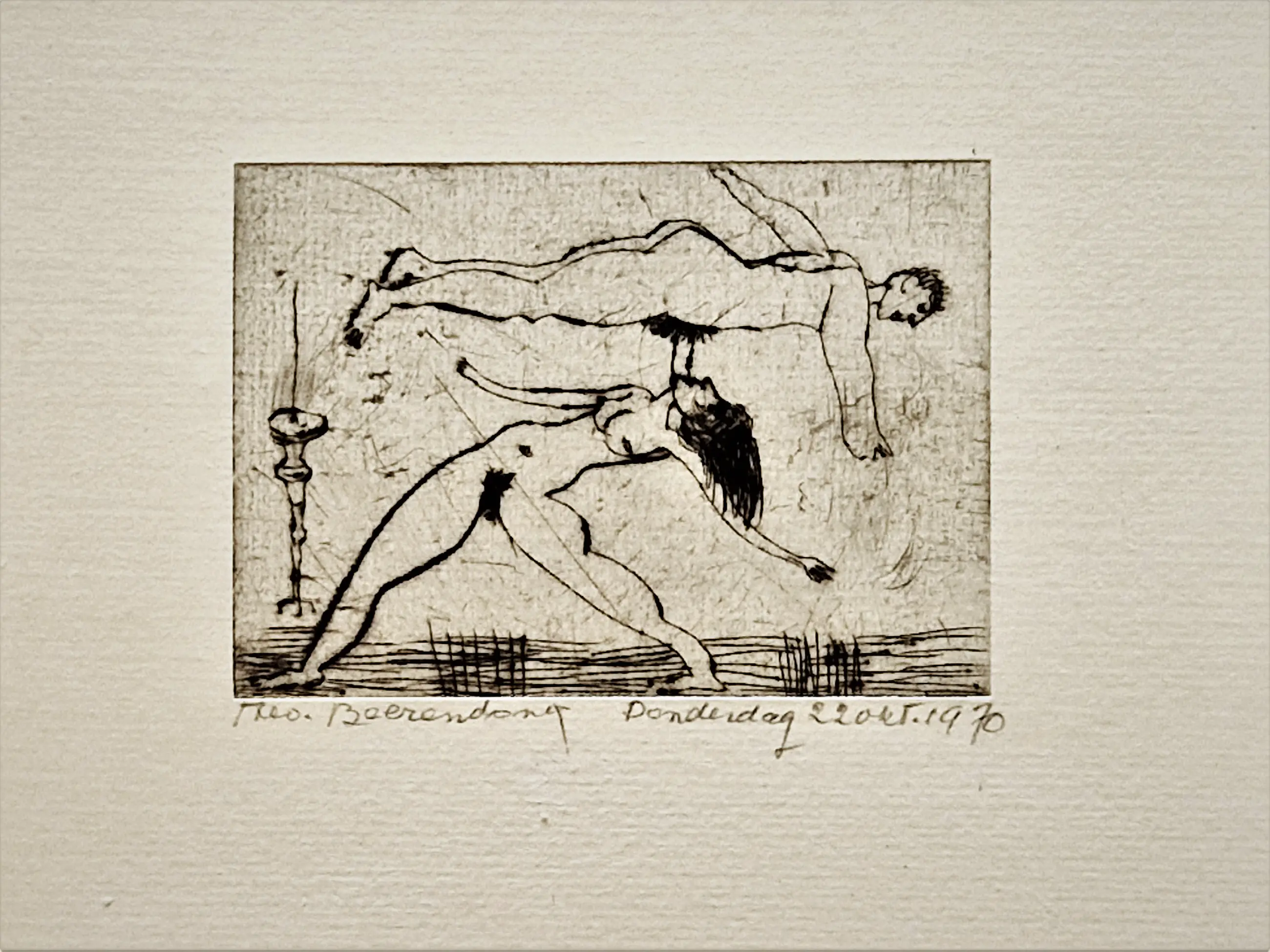 - Karakteristieke en expliciete droge naald ets op geschept papier van de Amsterdamse multi-disciplinaire kunstenaar theo Beerendonk (1905-1979). Hij heeft deze ets gemaakt op donderdag 22 oktober 1970. De ets verkeert in absoluut goede conditie en is met potlood gesigneerd en gedateerd. - niet ingelijst. Bladmaat ets 10x14cm.