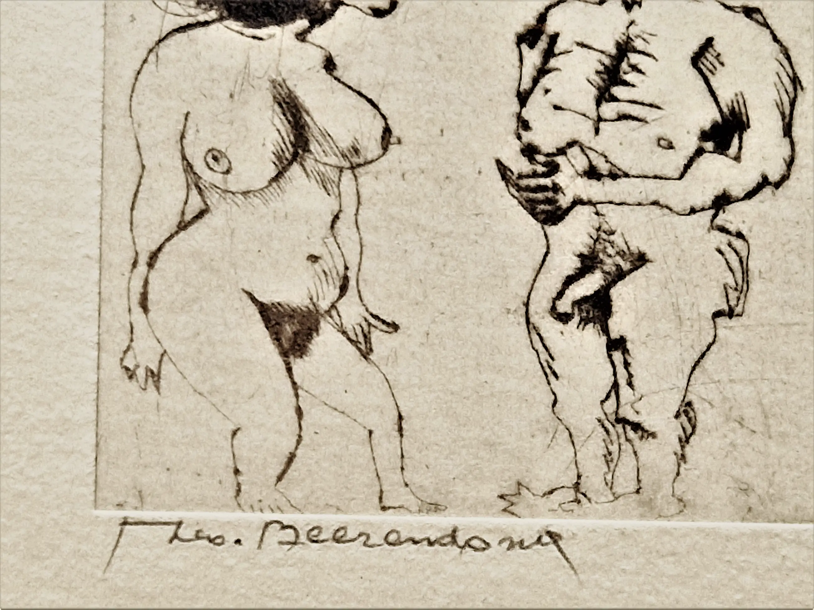 - Karakteristieke en expliciete droge naald ets op geschept papier van de Amsterdamse multi-disciplinaire kunstenaar theo Beerendonk (1905-1979). Hij heeft deze ets gemaakt op zaterdag 5 september 1970. De ets verkeert in absoluut goede conditie en is met potlood gesigneerd en gedateerd. - niet ingelijst. Bladmaat ets 12x16cm.