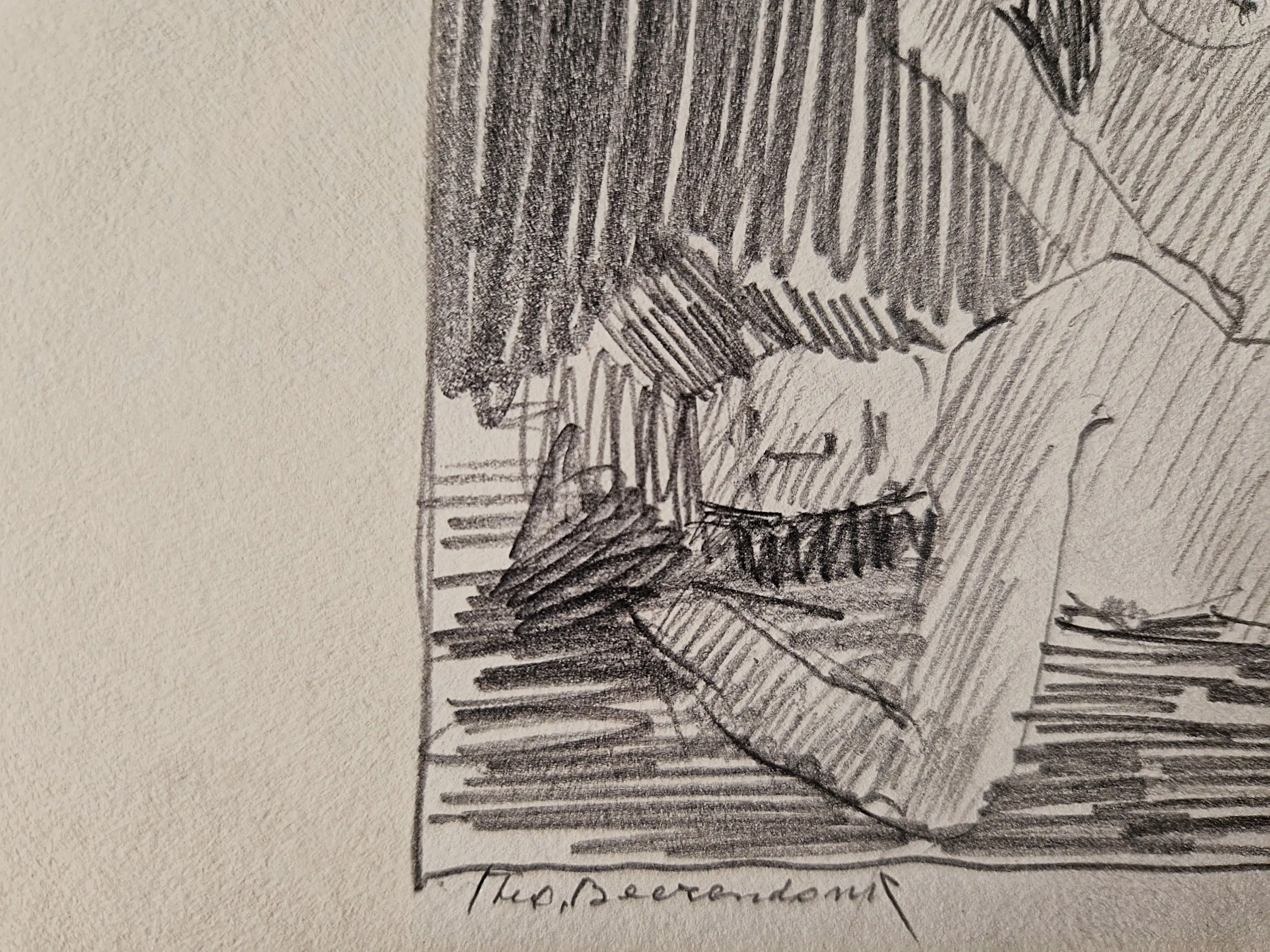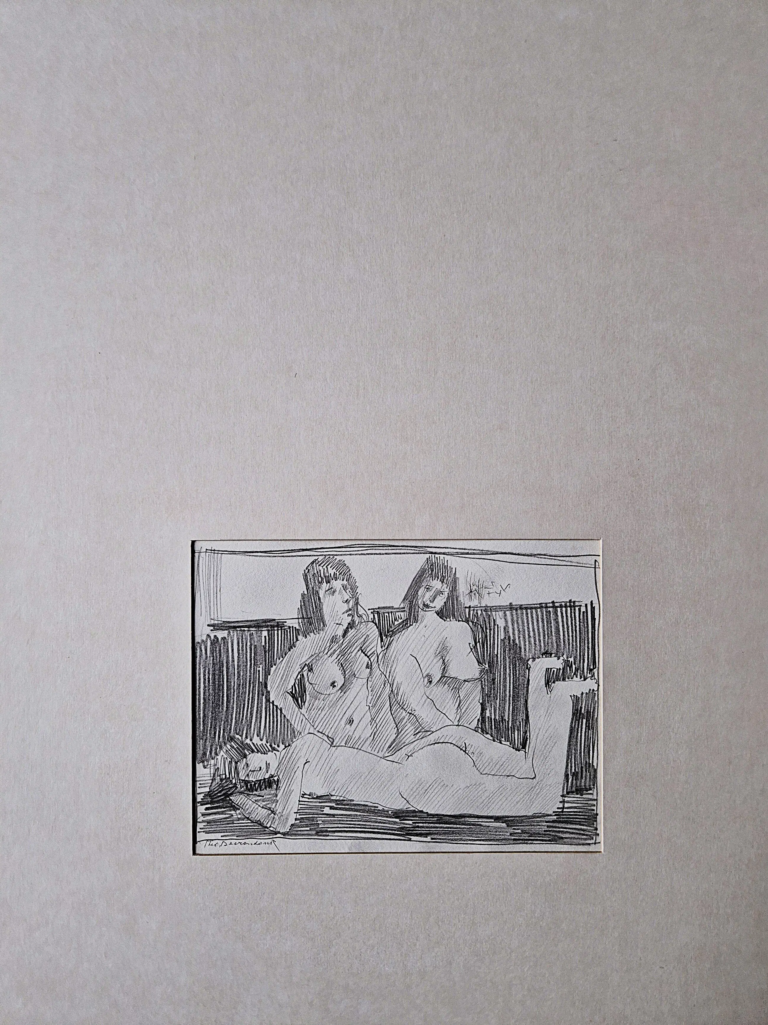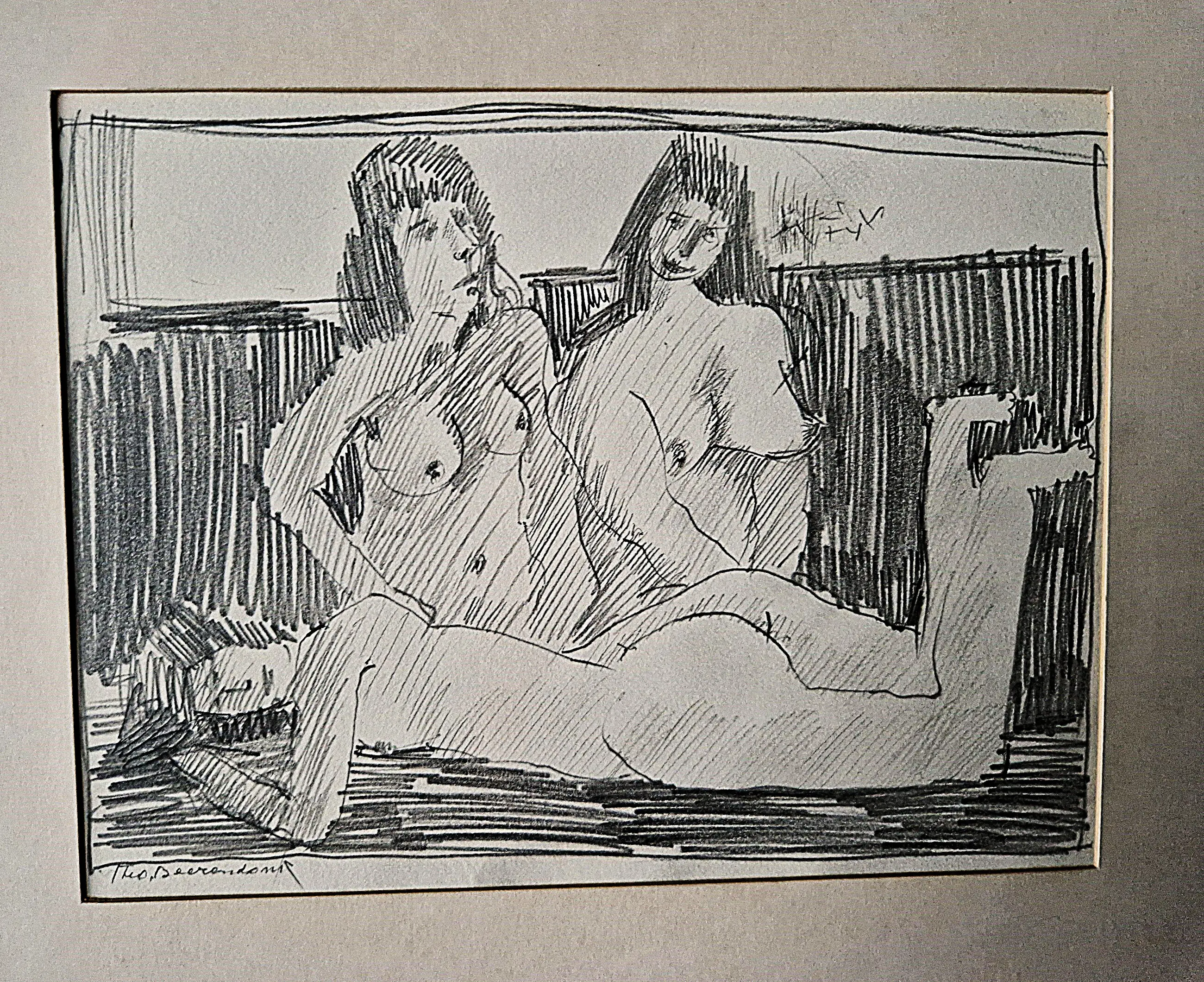 - Pikante jaren 50 potlood op papier tekening van de Amsterdamse multi-disciplinaire kunstenaar theo Beerendonk (1905-1979). De tekening verkeert in goede conditie en is linksonder gesigneerd. In (iets vergeeld) passe partout - niet ingelijst. Bladmaat 21x18cm.