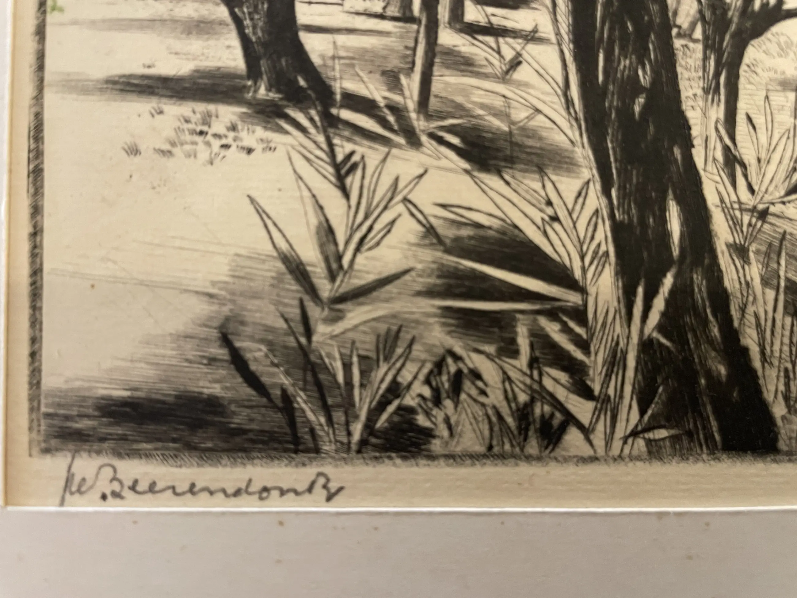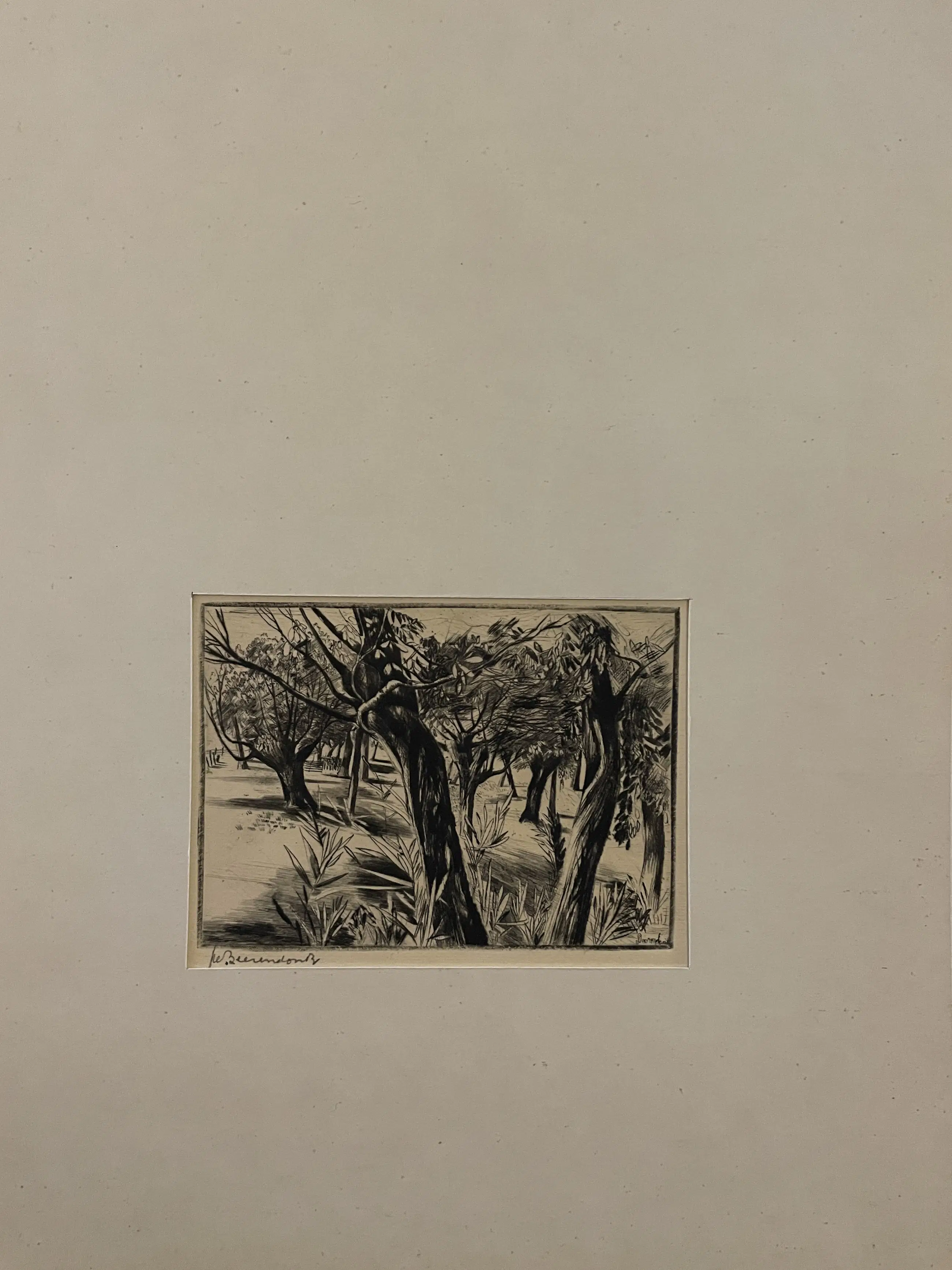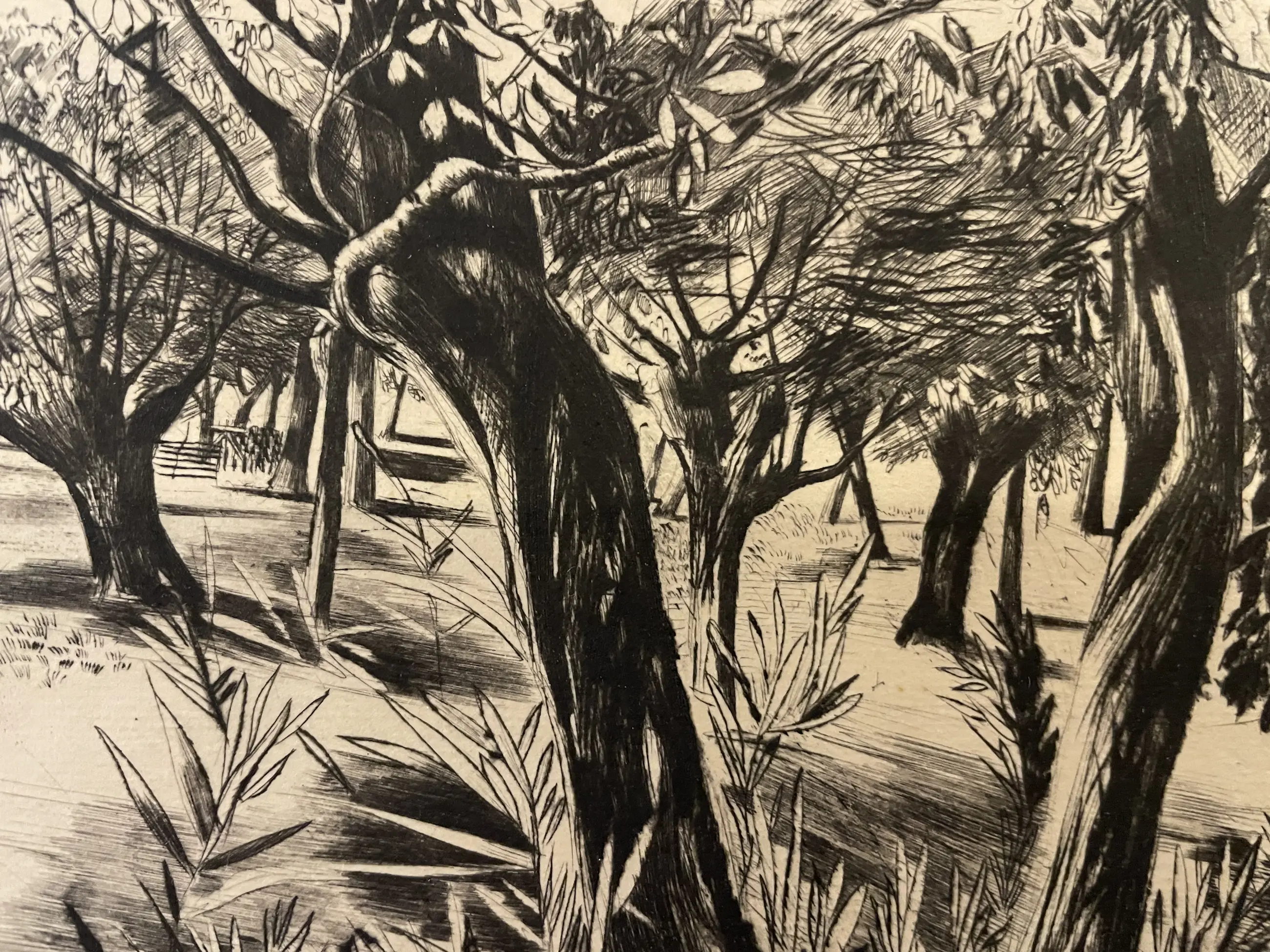 Schitterende ets van knotwilgen in een grote passe-partout in perfecte staat
