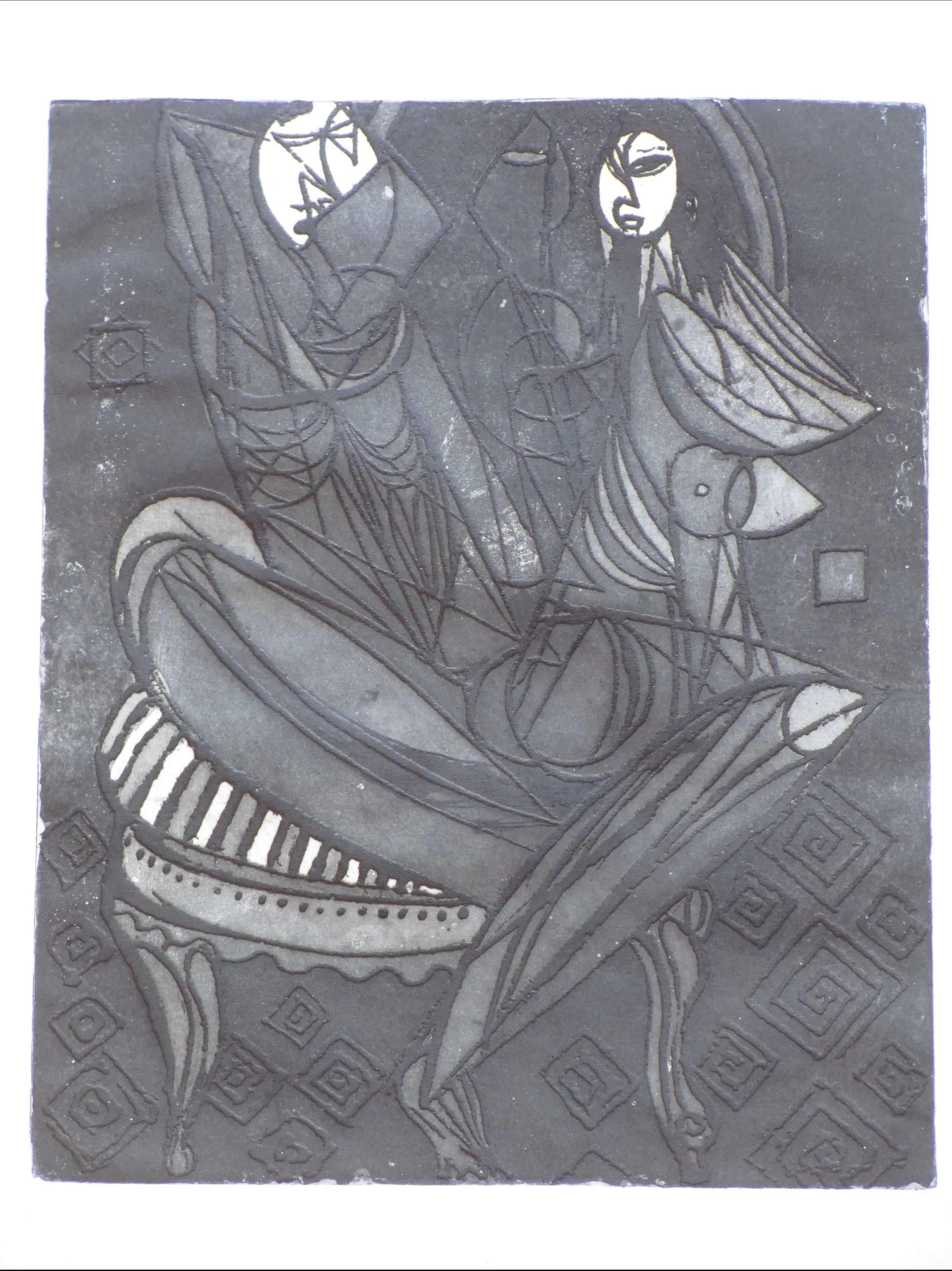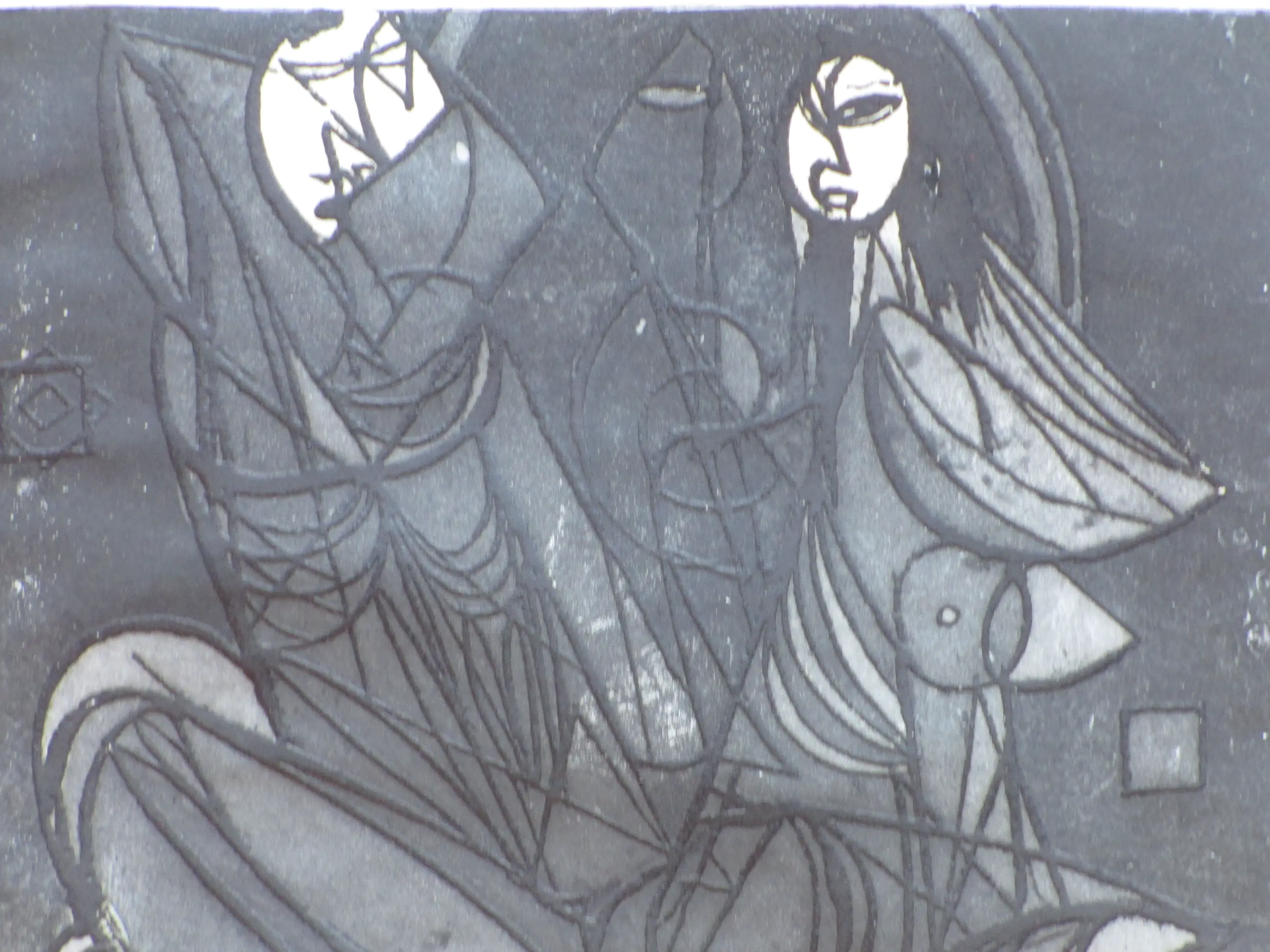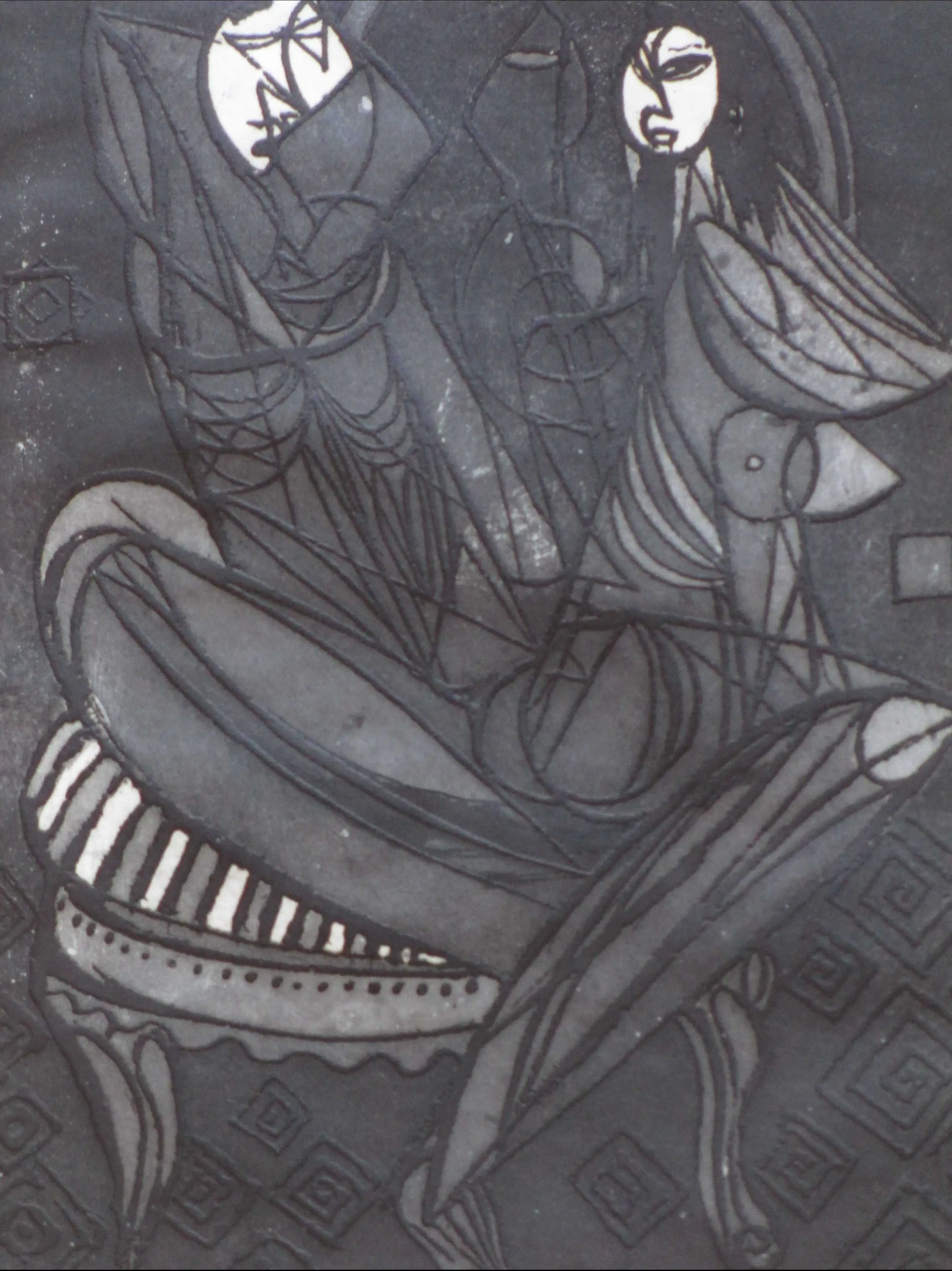 Ets in diepdruk door Theo Beerendonk Voorstelling van een kubistisch koppel op een stoel Losbladig, beeldmaat 30x24.5, bladmaat 45x43 Niet gesigneerd Proefdruk Authenticiteit volledig gegarandeerd