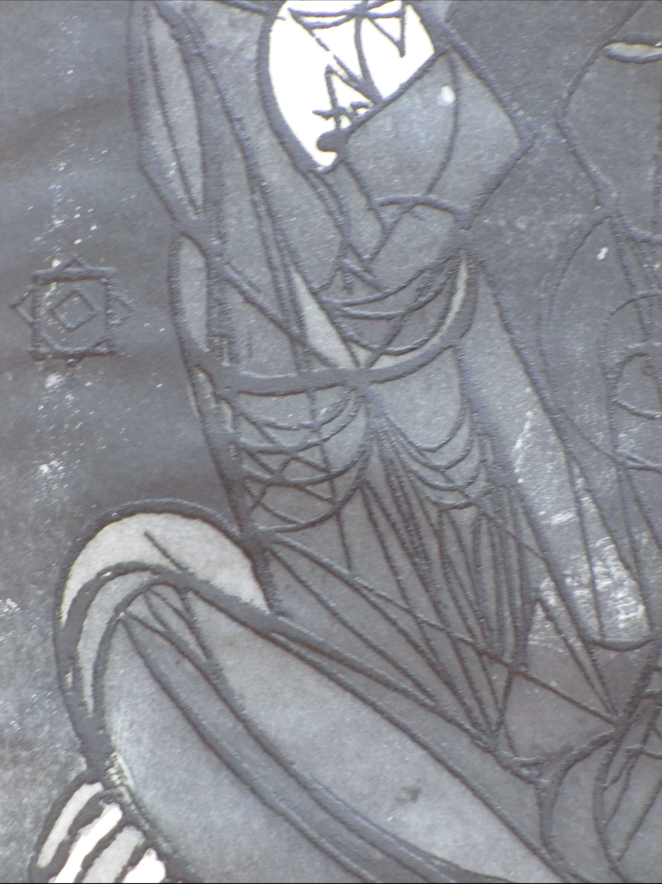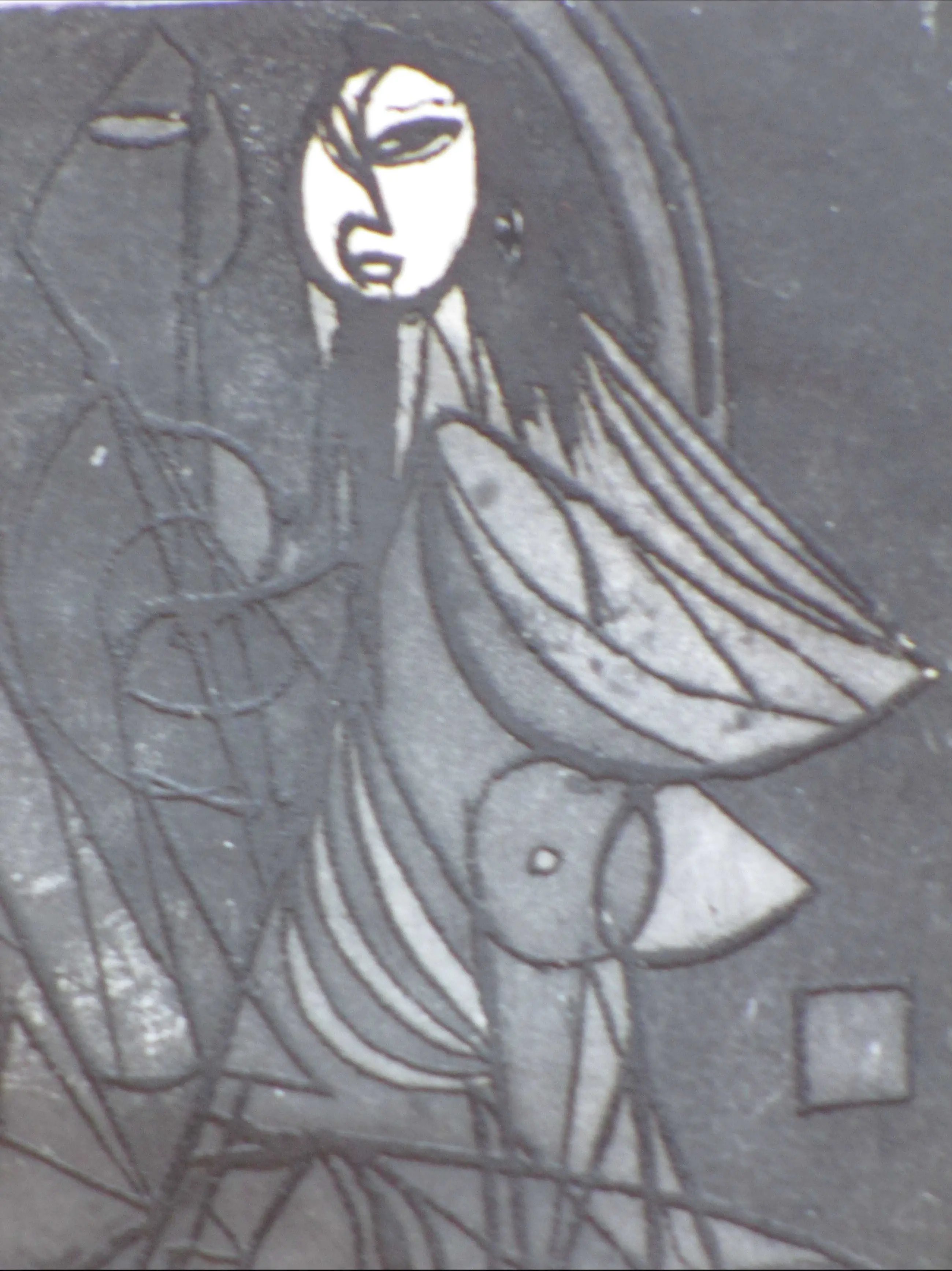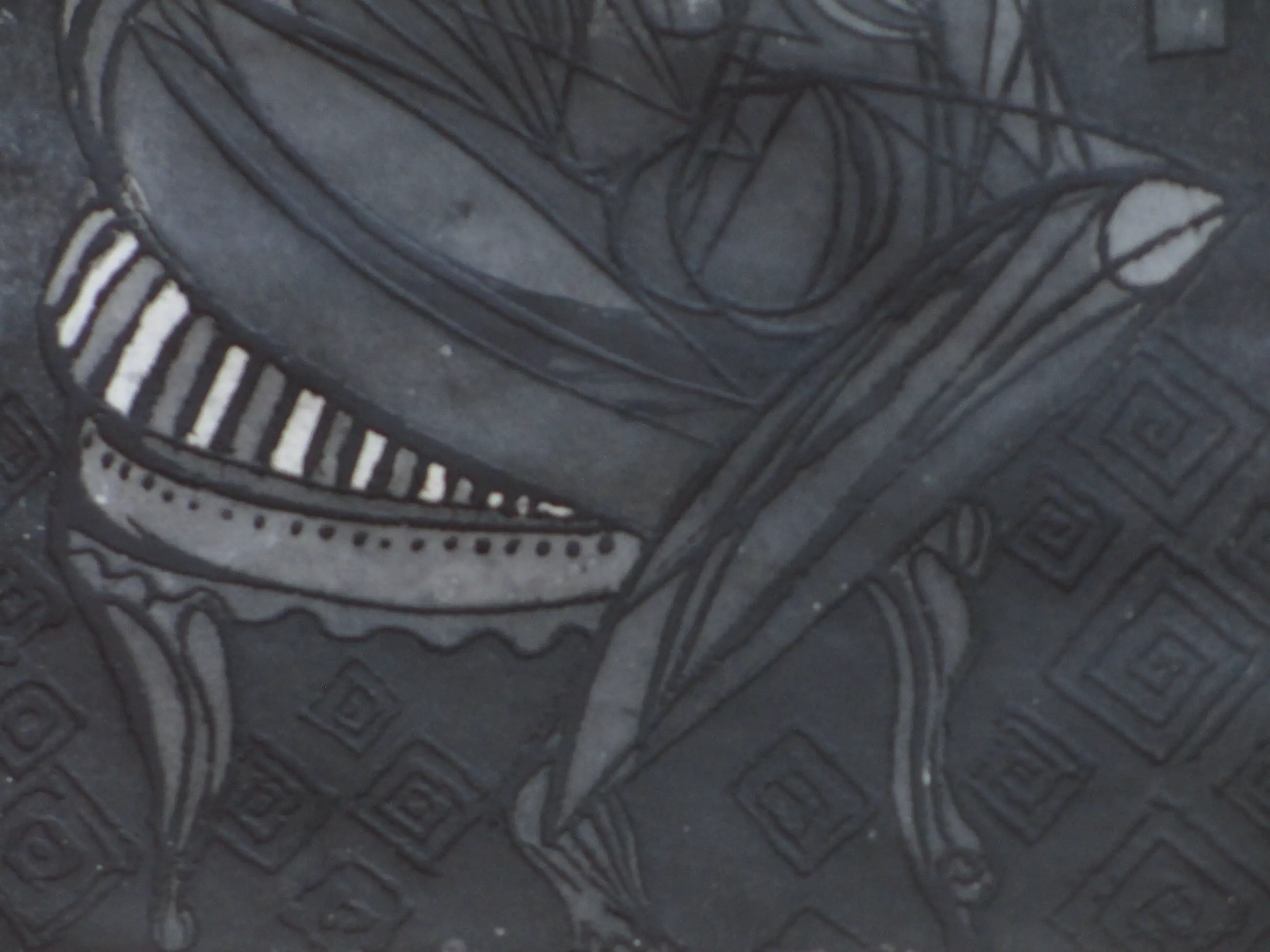 Ets in diepdruk door Theo Beerendonk Voorstelling van een kubistisch koppel op een stoel Losbladig, beeldmaat 30x24.5, bladmaat 45x43 Niet gesigneerd Proefdruk Authenticiteit volledig gegarandeerd