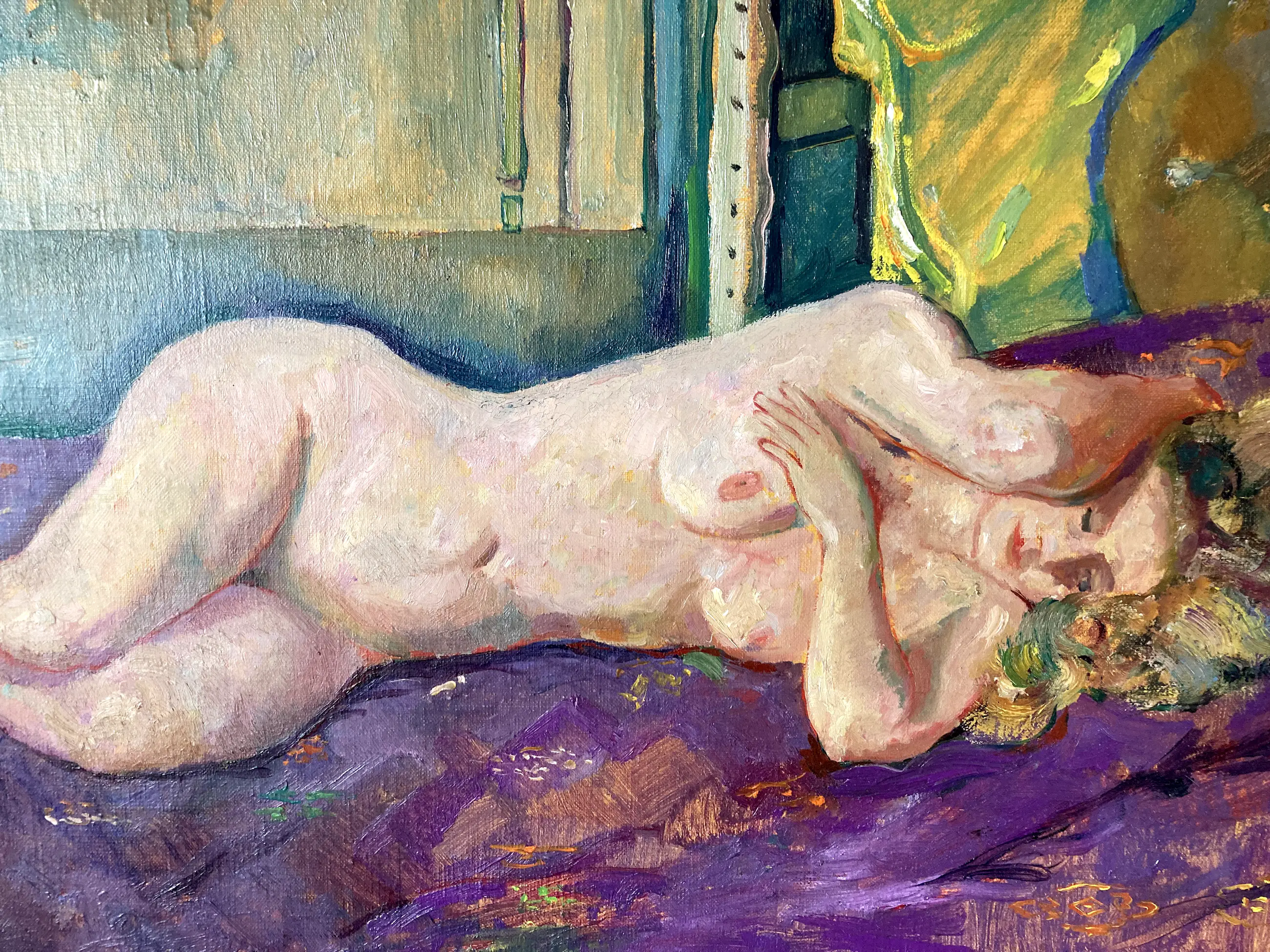 Een toonaangevend werk (plus twee gratis boeken over Theo Beerendonk) in het oeuvre van deze nog steeds ondergewaardeerde Nederlandse kunstenaar. Dit liggend naakt is 100 procent authentiek, komt met een certificaat van Peter Breendonk en staat verschillende malen afgebeeld in zowel het boek ''De liefde voor het naakt'' als de monografie ''Theo Beerendonk, van impressionisme tot abstractie''. Het is meerdere keren tentoongesteld waaronder in museum De Wieger waarvan nog een sticker op de achterkant. Catalogusnummer 16. Prachtig kleurrijk impressionisme of fauvisme, doet denken aan Jan Sluijters. Perfecte conditie van het doek en de prachtige bijhorende lijst. Het werk is niet gedateerd, wat wel vaker voorkwam bij deze schilder. Er loopt momenteel een grote verkooptentoonstelling van de kunstenaar met prijzen rond 5000 Euro en ook volgend jaar volgen twee exposities. Eindelijk wordt Theo Beerendonk meer en weer terug gewaardeerd en herontdekt. Hij heeft een krachtig en erg gevarieerd oeuvre waarin naakten toch wel een centrale rol speelden. Gekocht van een Nederlandse collectioneur. De prijs is vergeleken met de werken op de tentoonstelling erg laag.