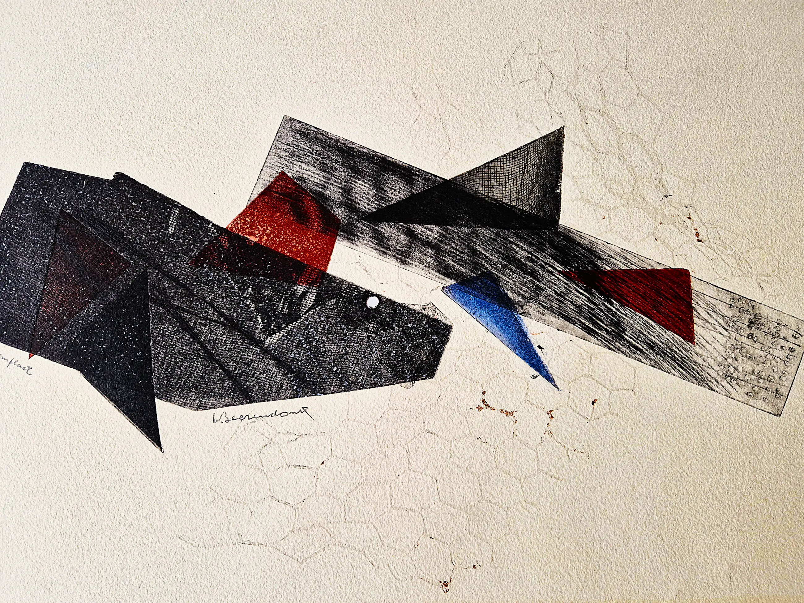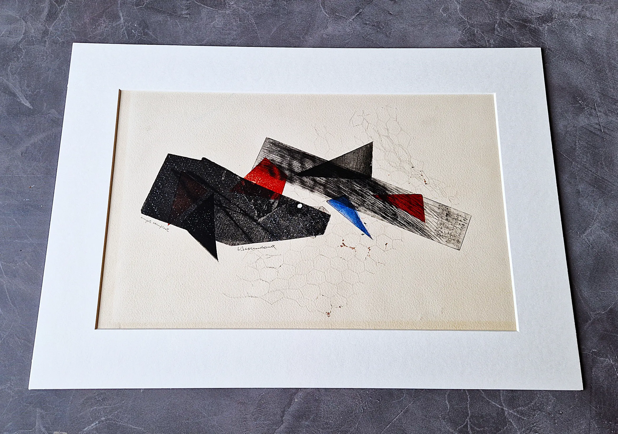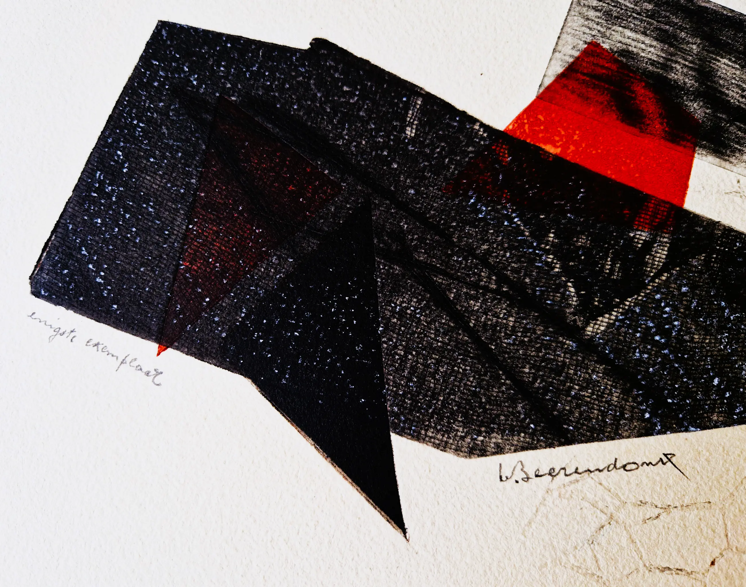 Prachtig abstract werk (handgekleurde reliëfdruk) van de veelzijdige beeldend kunstenaar Theo Beerendonk. Betreft een uniek exemplaar, dus niet in oplage vervaardigd. Verkeert in zeer goede conditie - potloodgesigneerd en losbladig.