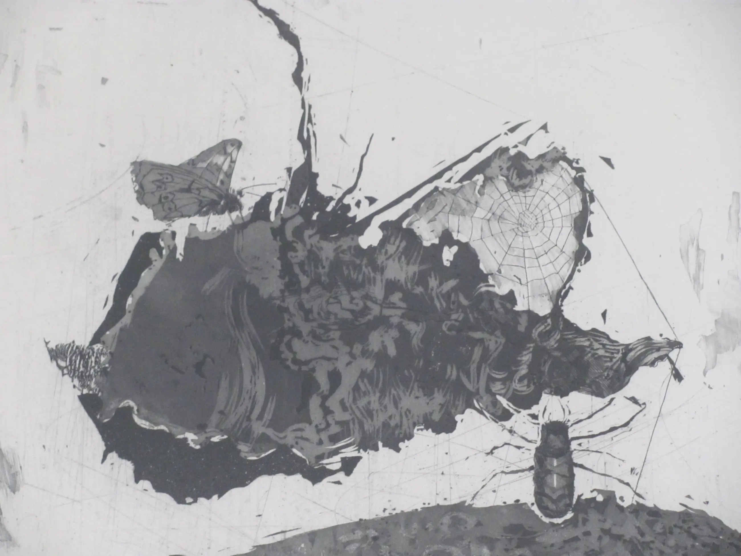 Zeefdruk of ets van Theo Beerendonk. Afgebeeld is onder meer een vlinder, een tor en een spinnenweb.