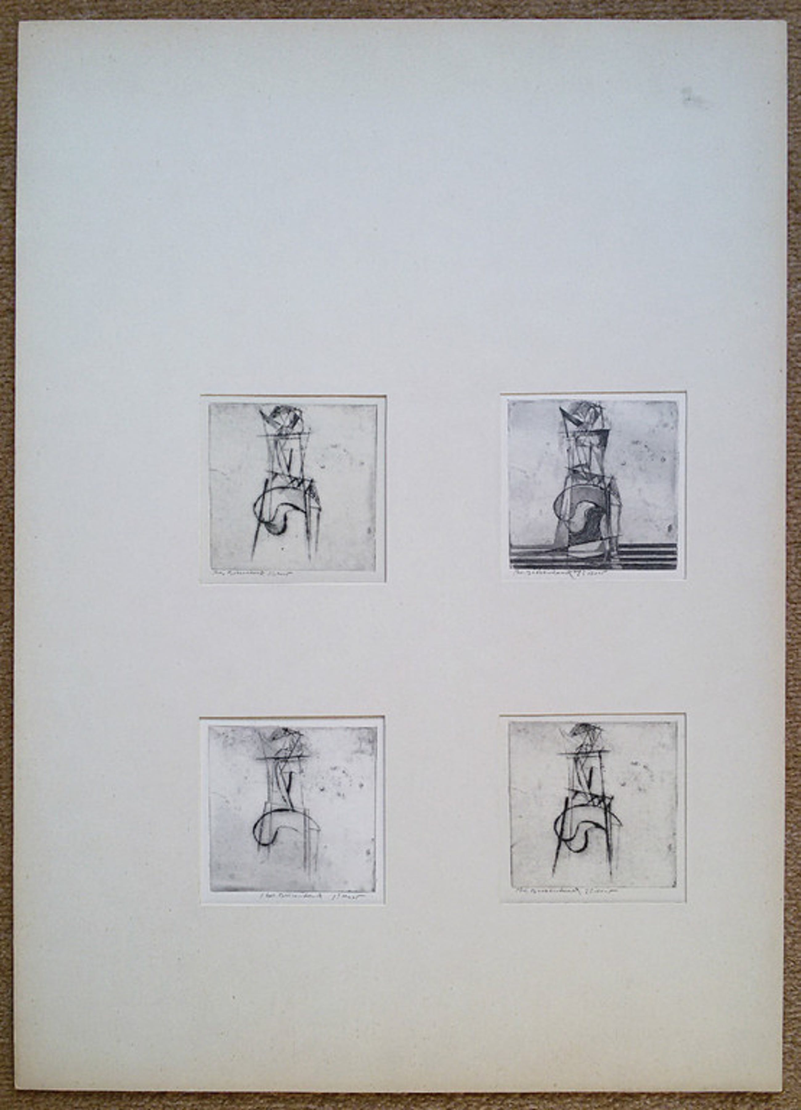 Prachtig kwartet etsen van Theo Beerendonk. Alle vier met potlood gesigneerd, met vermelding van de staat. Alle vier in zeer goede conditie. De etsen zitten eenvoudig bevestigd in een soort schriftachtig passe-partout, en kunnen daar heel eenvoudig uitgehaald worden om afzonderlijk, of weer als kwartet, ingelijst te worden.