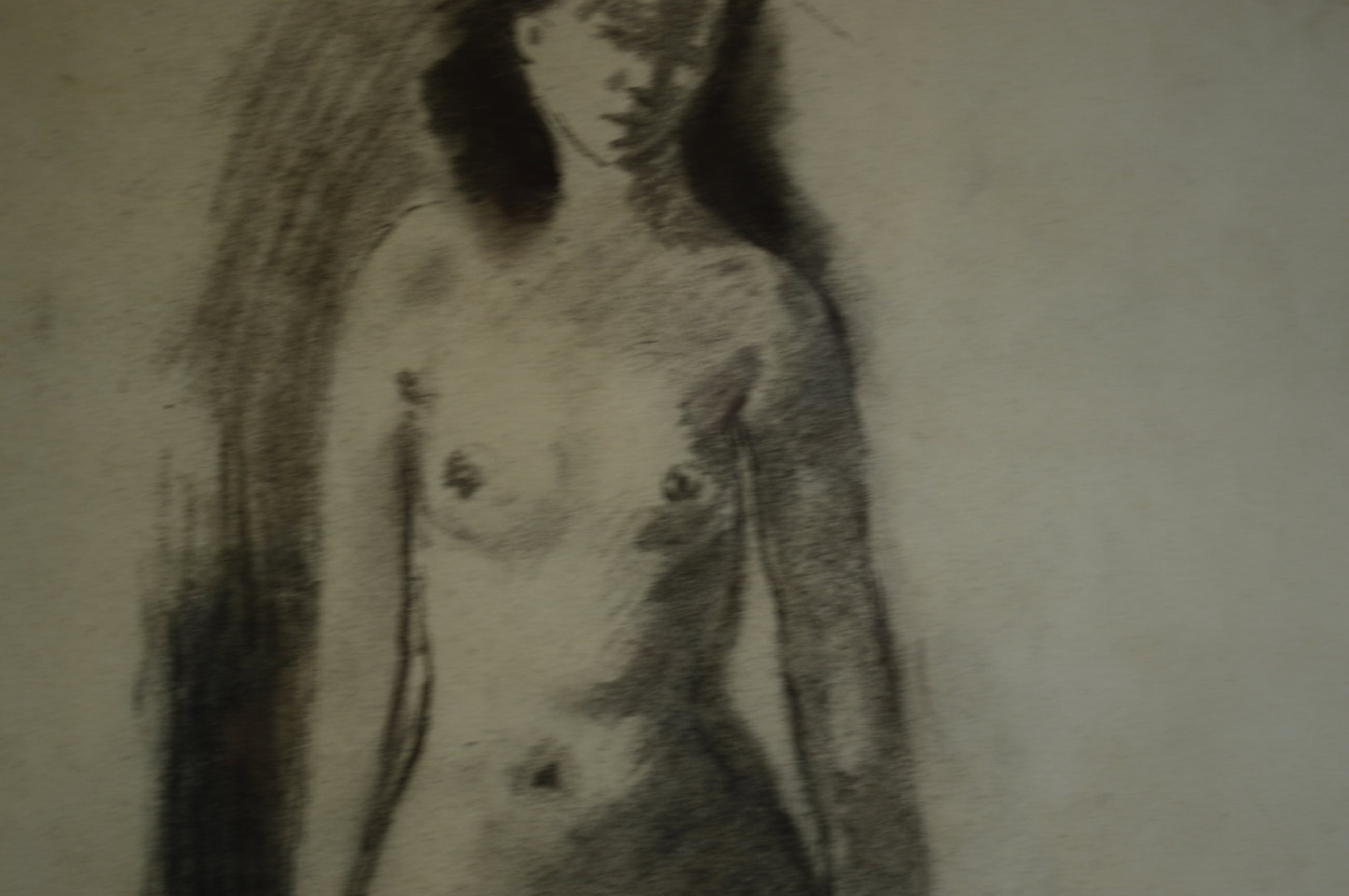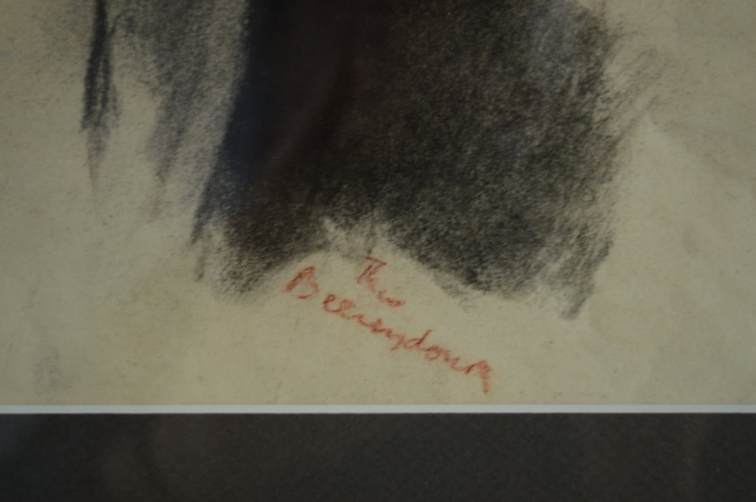 Theo Beerendonks staand naakt in krijt, links-onder en rechts-boven een vouw in papier zichtbaar, niet echt storend. Signatuur in rood rechts-onder.