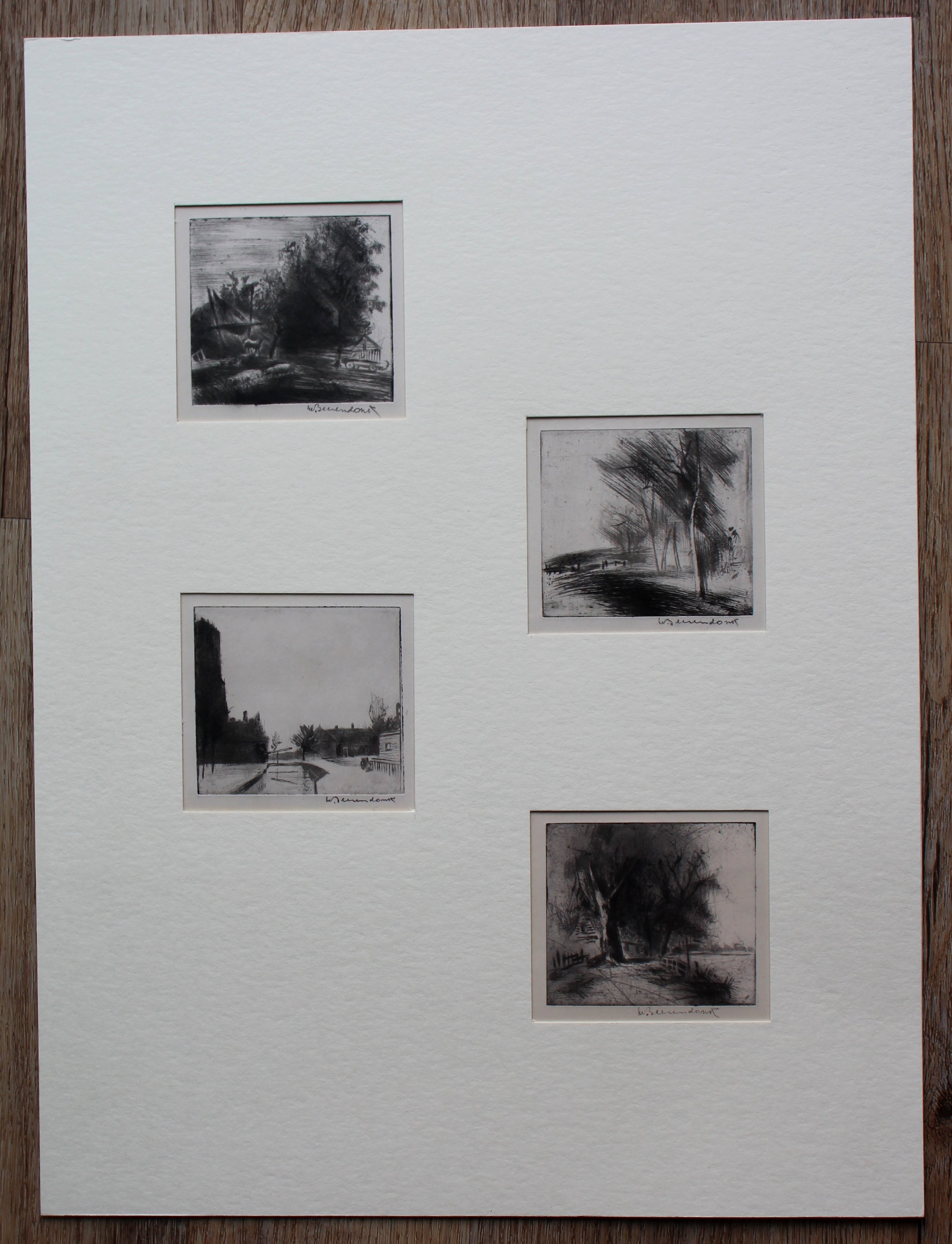 Vier etsen van Theo Beerendonk op 1 blad. Afmetingen blad incl passepartout: H45.5 x b34cm. Afmetingen per voorstelling ca: H7 x b7.5cm. Elk werk is onderaan, met potlood, gesigneerd door de kunstenaar. De authenticiteit van het aangeboden werk wordt volledig gegarandeerd. Een certificaat van echtheid kan, op aanvraag, worden gemaild.