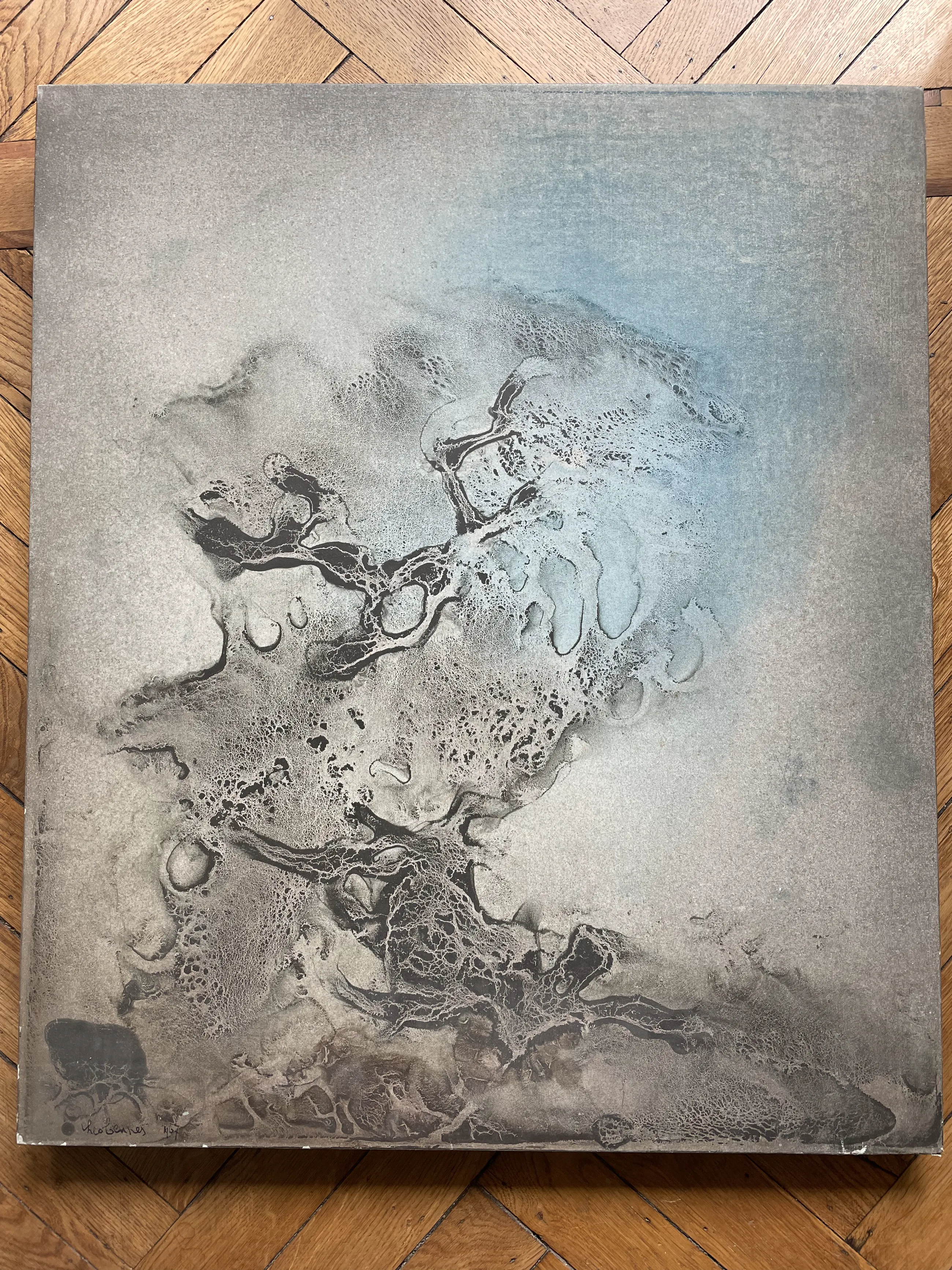 Een op het boeddhisme geïnspireerd abstract werk, confronterend én beschouwend en uitnodigend tot eigen interpretatie, uitgevoerd in een combinatie van zwartbruine, lichtgrijze en lichtblauwe tinten, die een serene stemming opwekken.