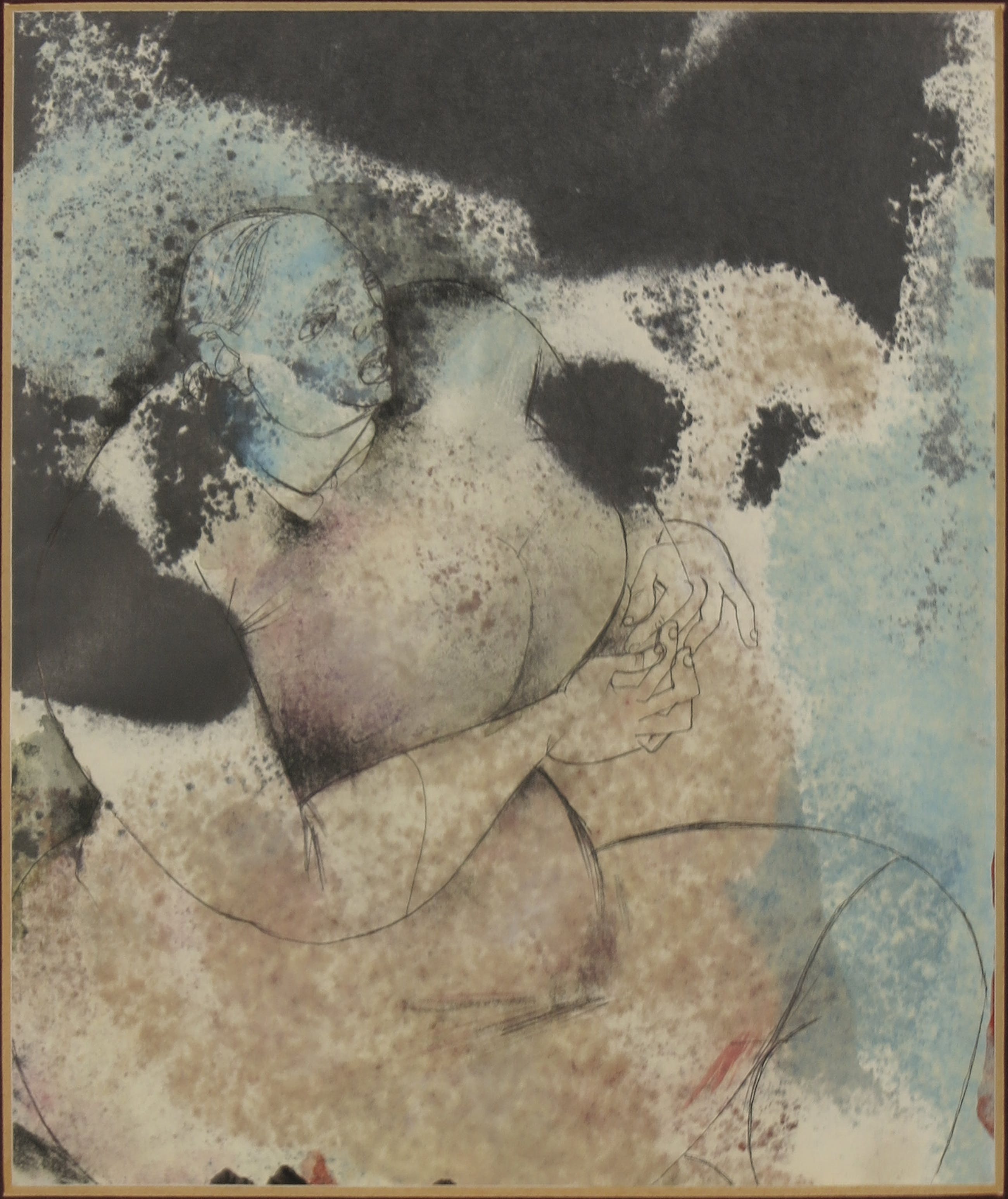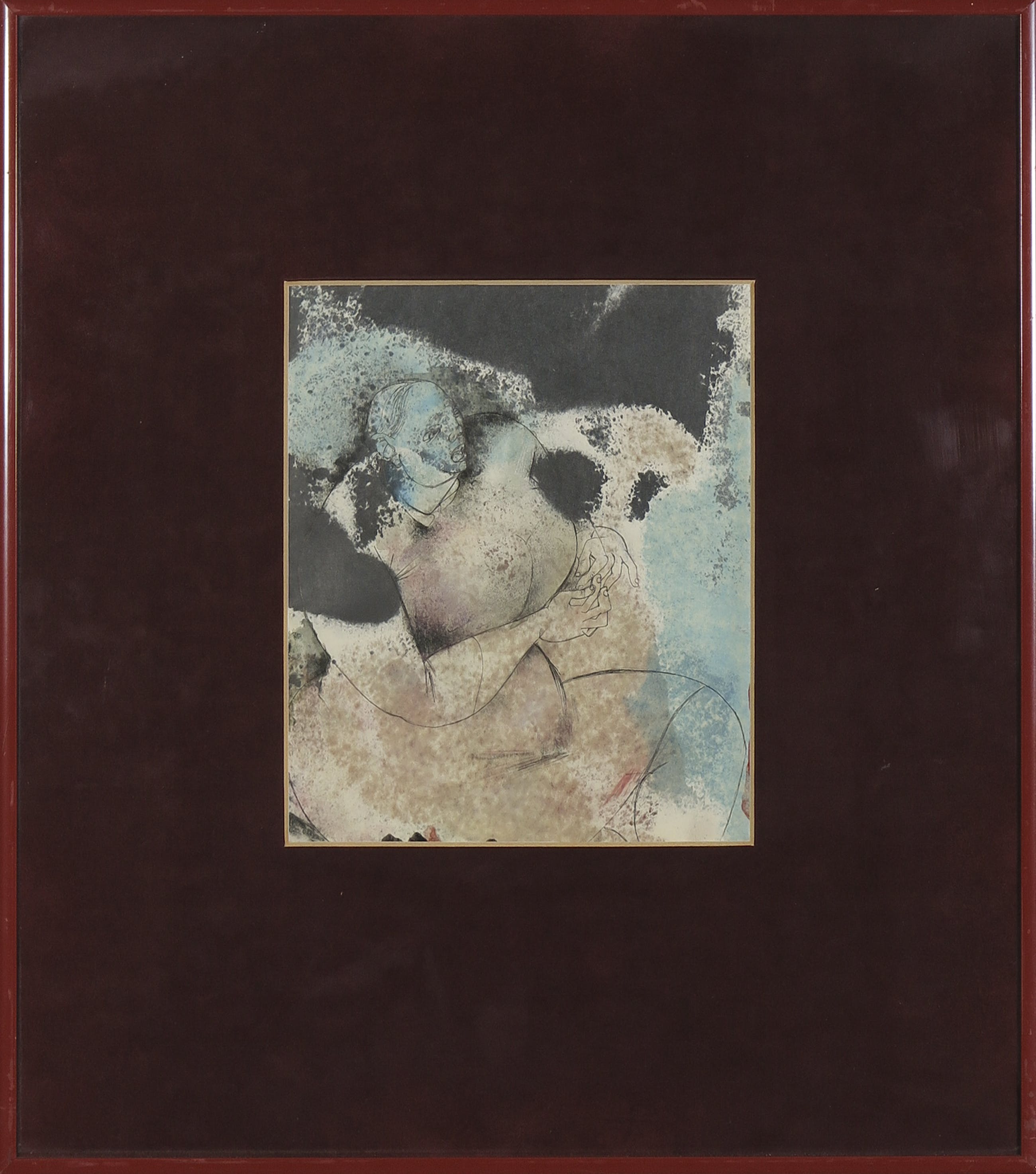 Het werk zit achter een donkerrood fluwelen passe-partout, dan op de foto wat donker uitvalt.