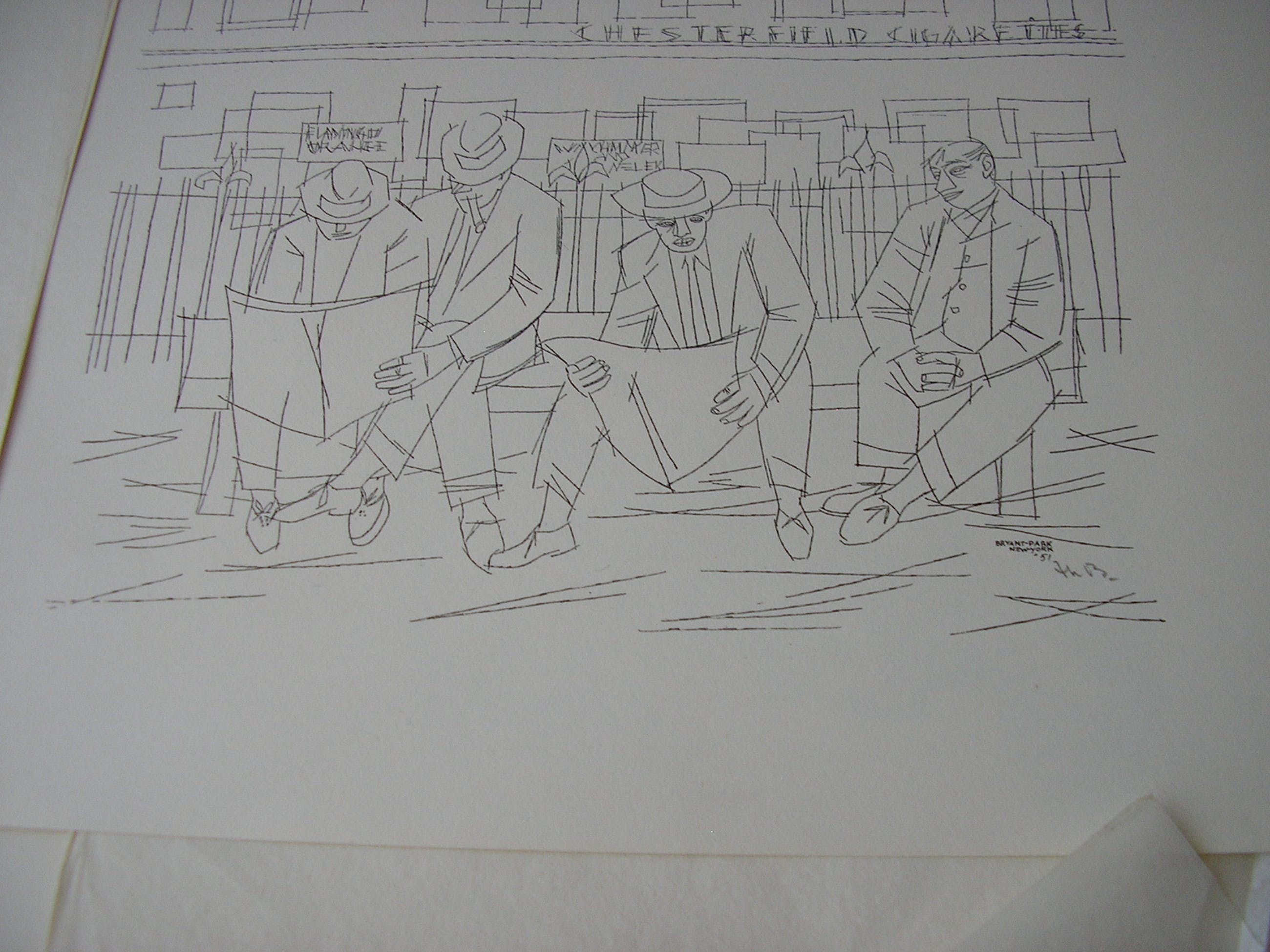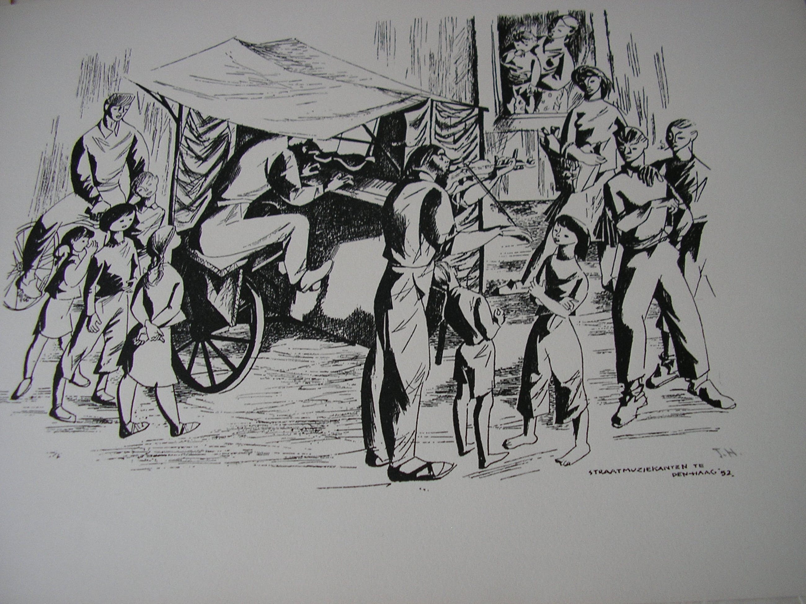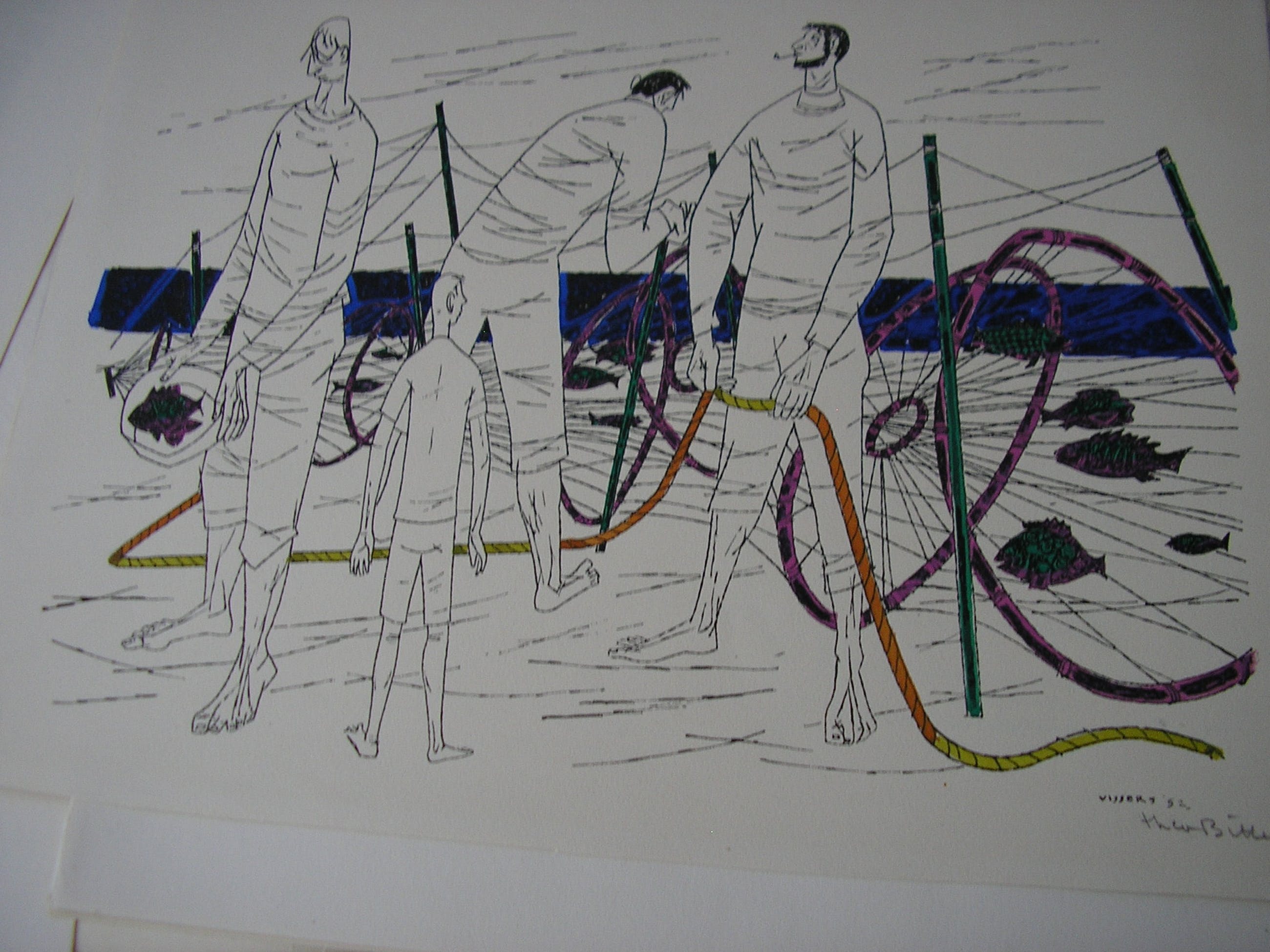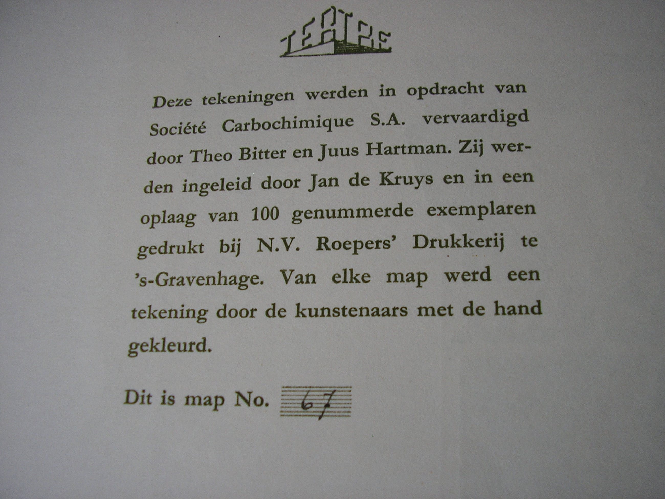 Verzameling van 10 tekeningen in uitstekende konditie: Nummer 67 van een uitgave van 100 genummerde exemplaren , gedrukt in NV Roepers Drukkerij te S'Gravenhage met een inleiding van Jan de Kruys, december 1952. Eén tekening is met de hand gekleurd door Theo Bitter en alle tien zijn getekend door de artiesten.